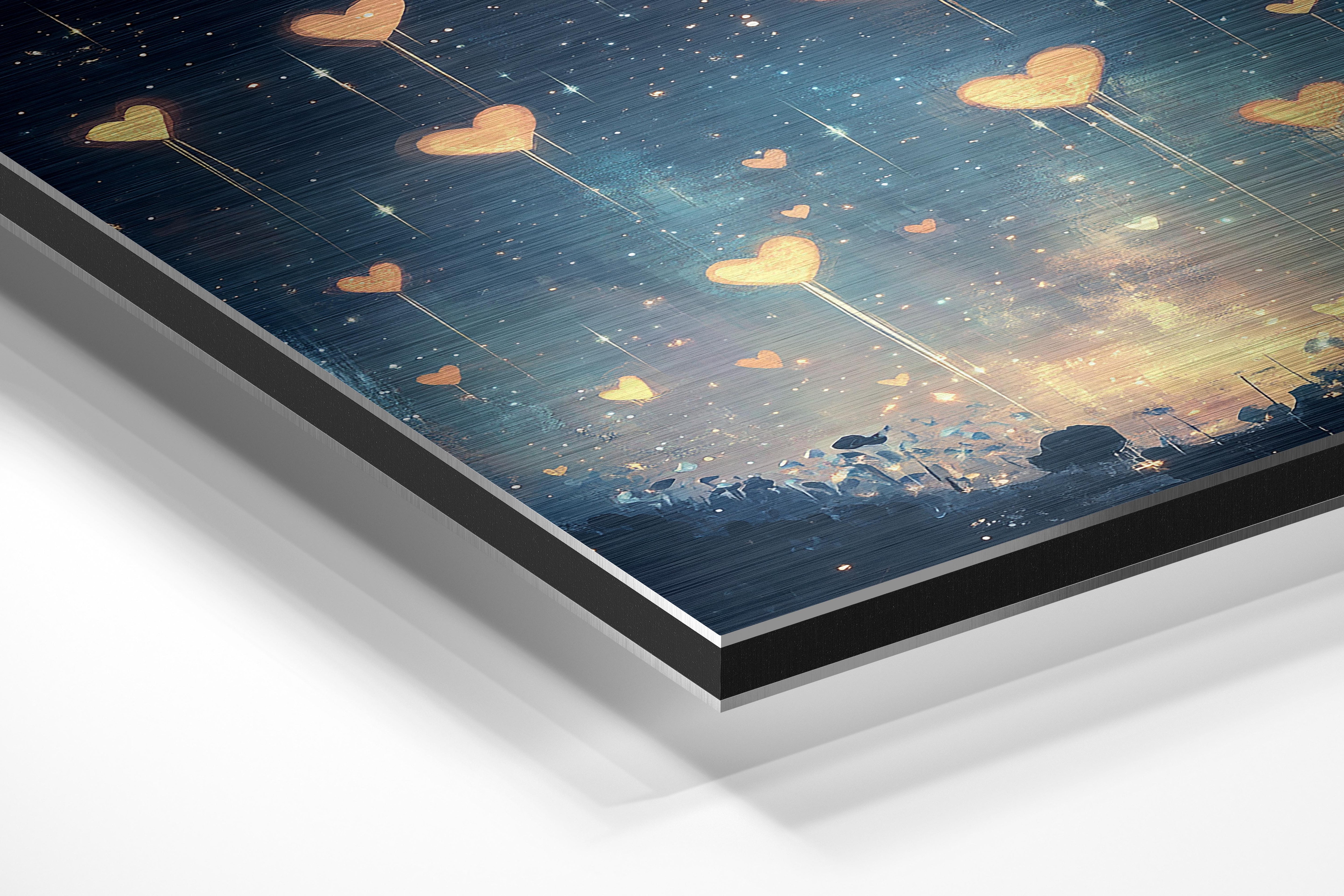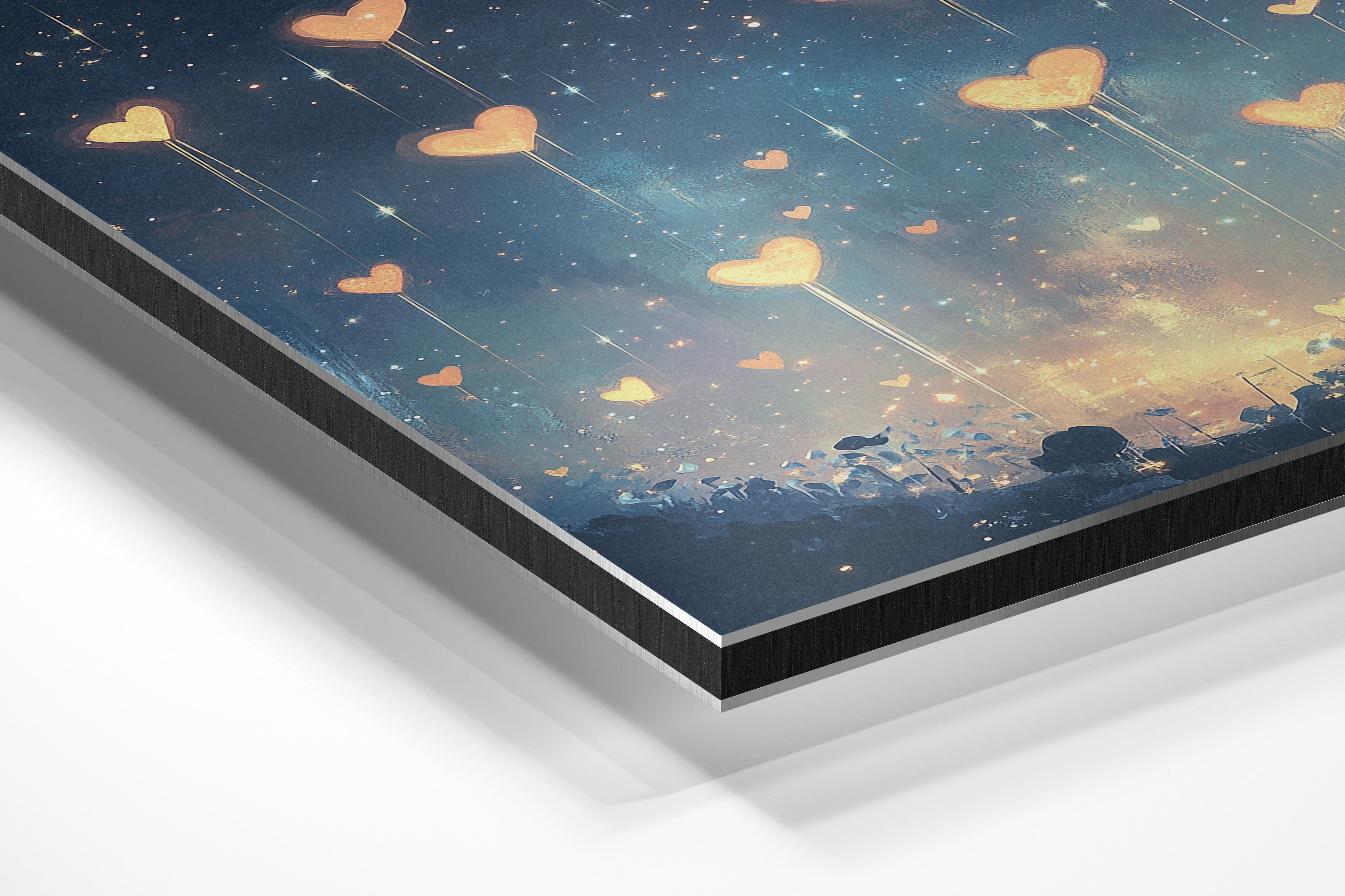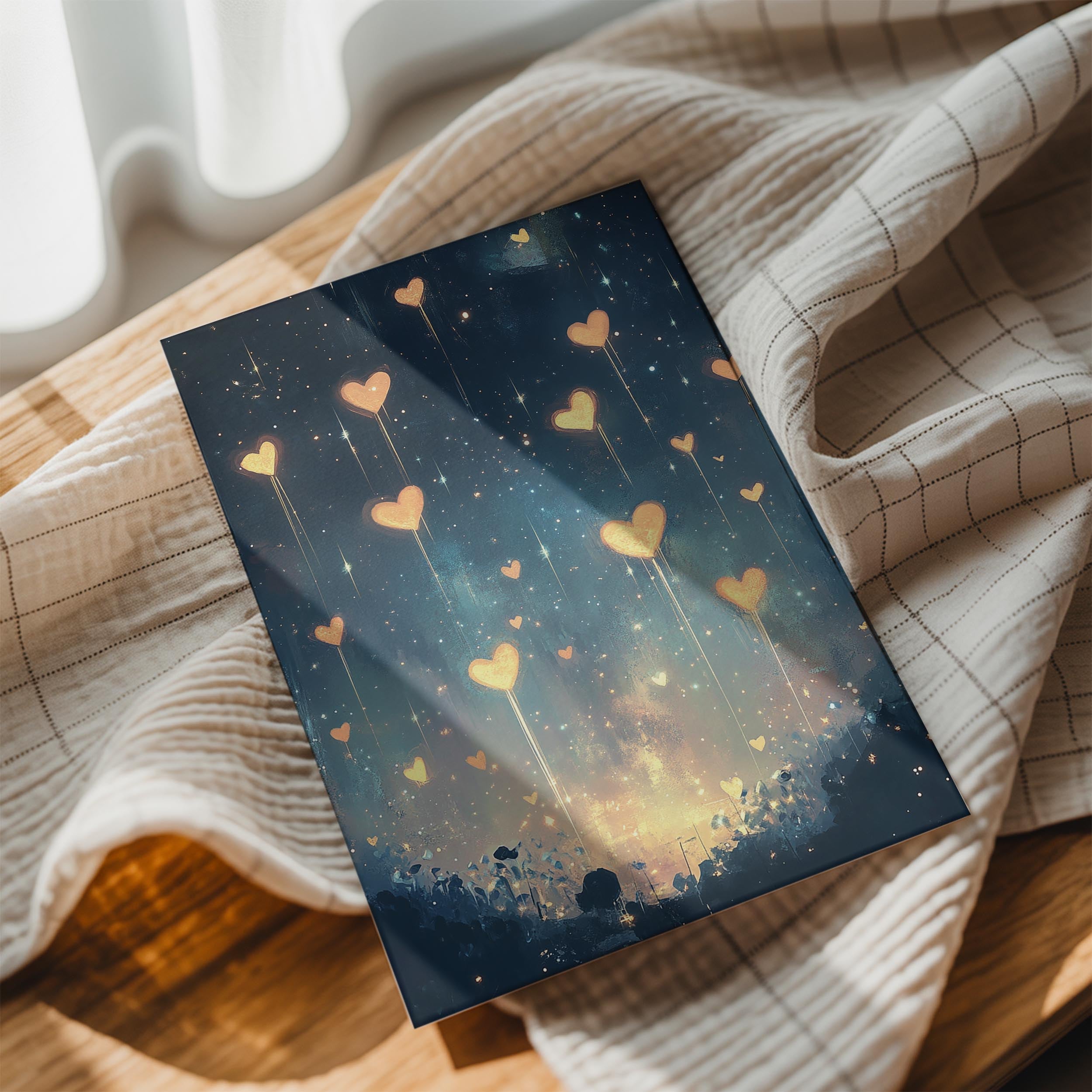 A dreamy night sky filled with glowing heart-shaped balloons floats above a whimsical landscape. The balloons seem to rise towards the stars, creating an ethereal and romantic atmosphere. The blending of soft blues and warm golden lights gives the image a sense of tranquility and wonder. This artwork is ideal for settings that inspire love and imagination, such as a bedroom or a romantic-themed space. Its captivating details and enchanting theme make it a conversation starter while also adding a soothing charm to the environment.