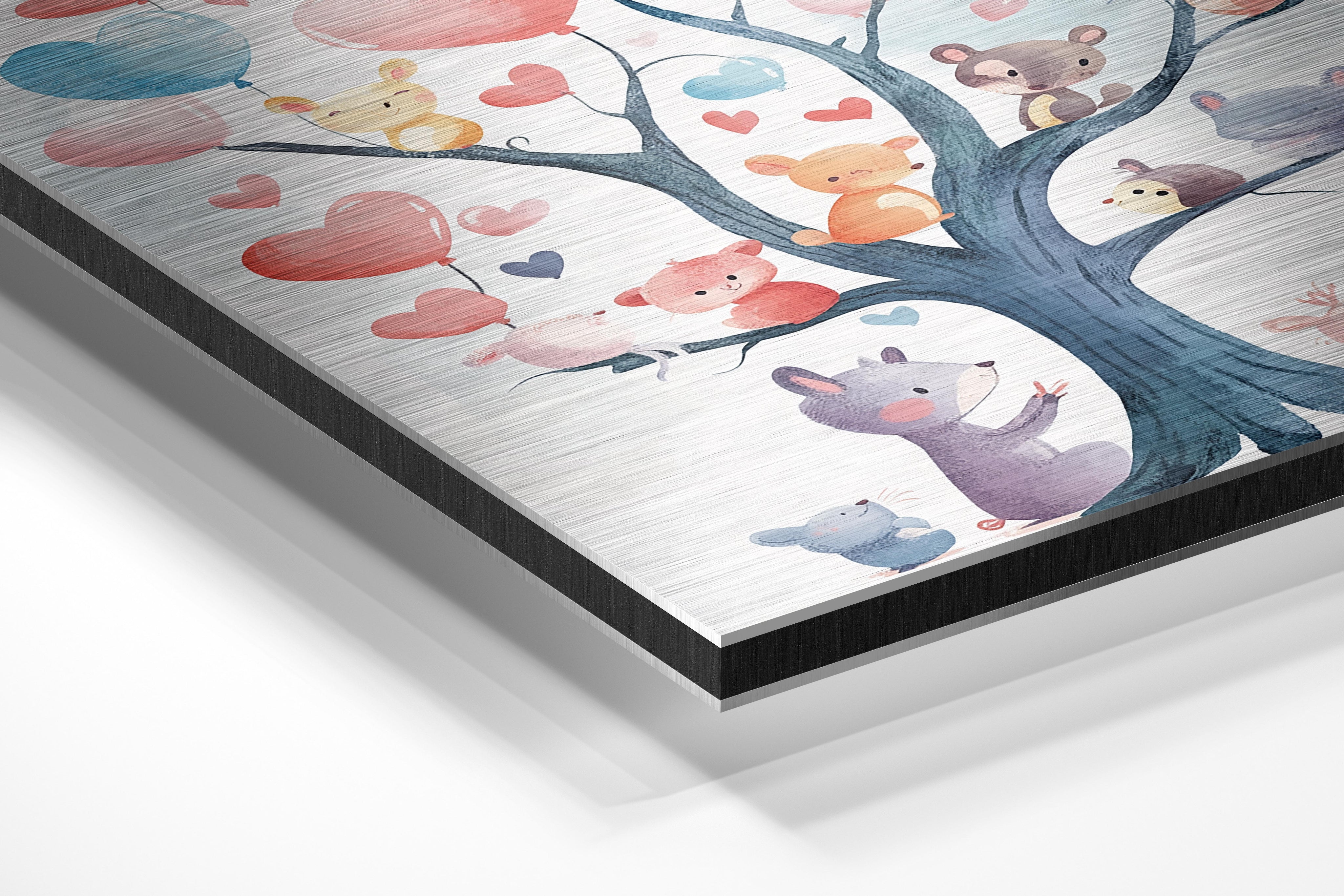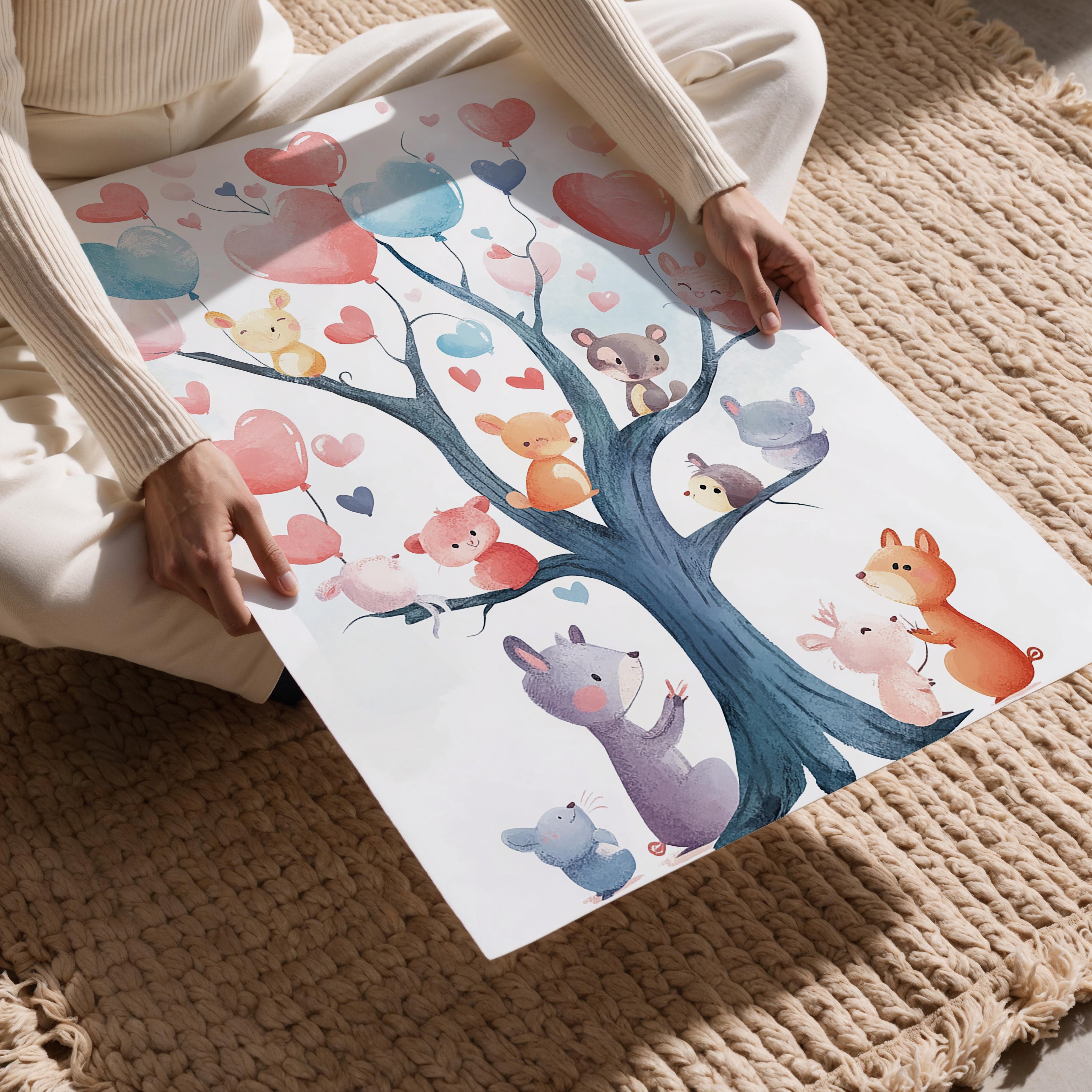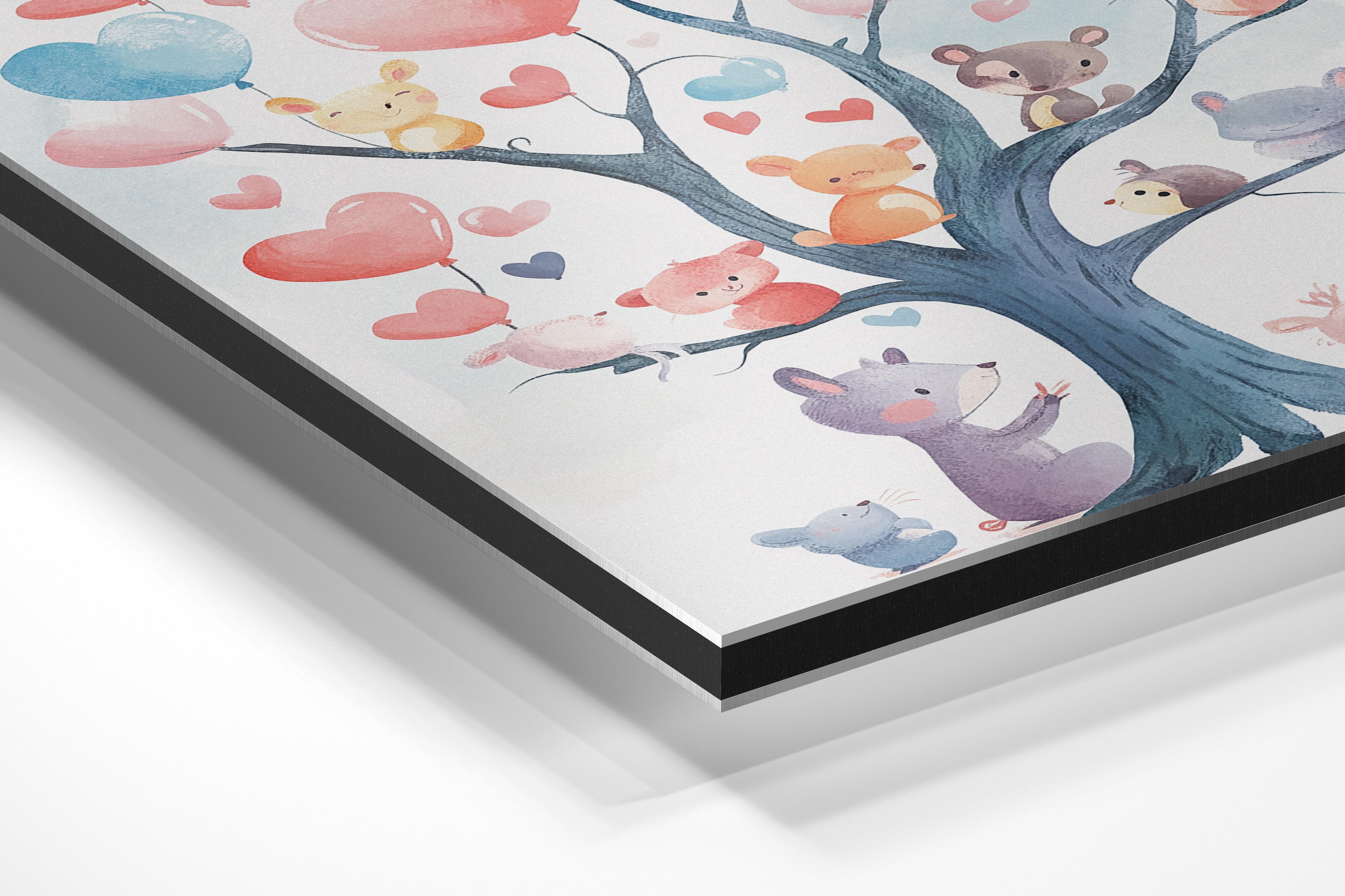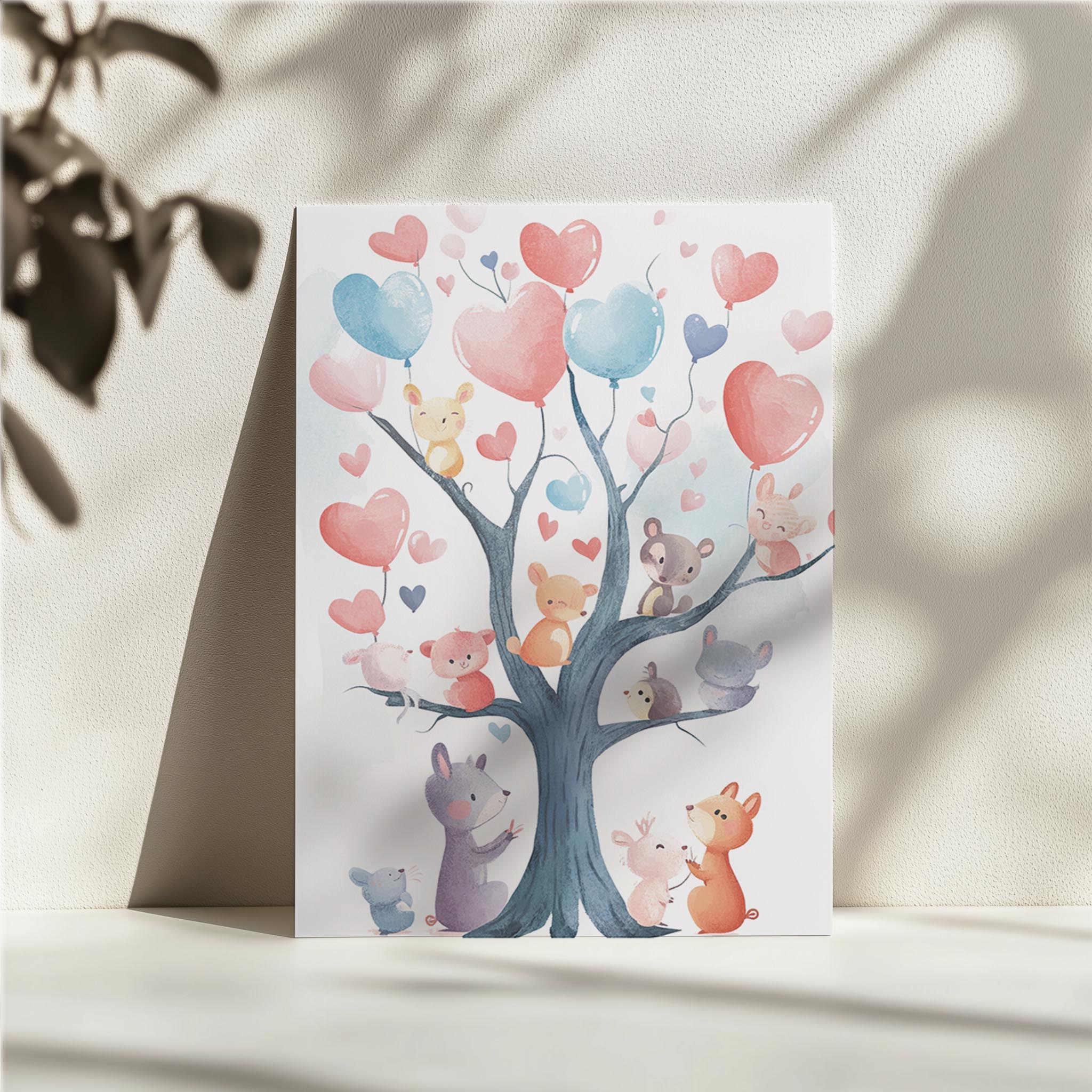 This whimsical artwork showcases a tree with heart-shaped balloons in pastel tones of pink, blue, and red. Tiny, adorable animals like mice, rabbits, and bears interact with the tree, each clutching or looking at the floating balloons. The image evokes a sense of joy and togetherness, perfect for a child’s nursery or playroom. The soft, hand-painted style and vibrant yet soothing palette make it ideal for inspiring positivity and warmth. A wonderful piece to brighten up any wall, encouraging smiles and imaginative storytelling.