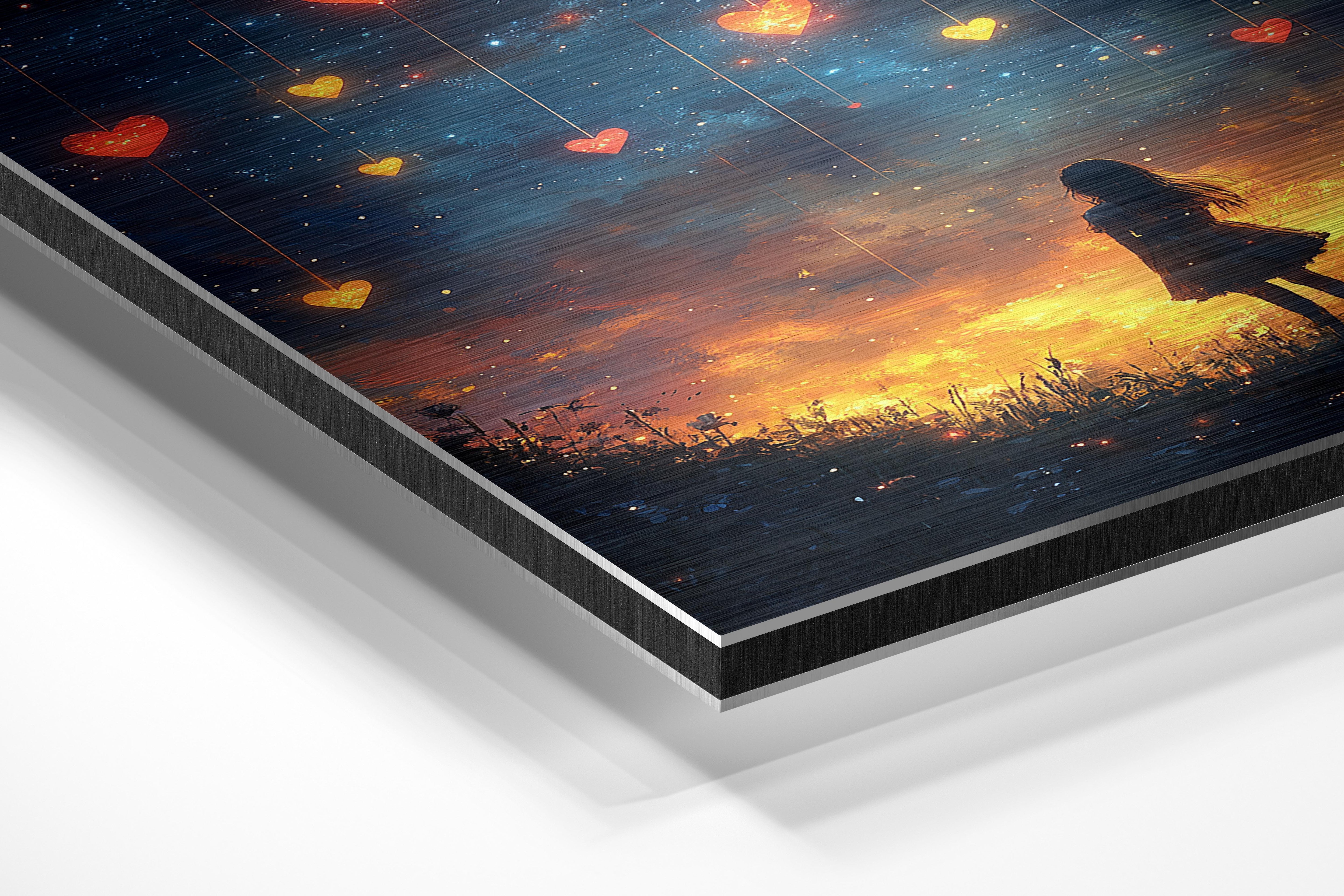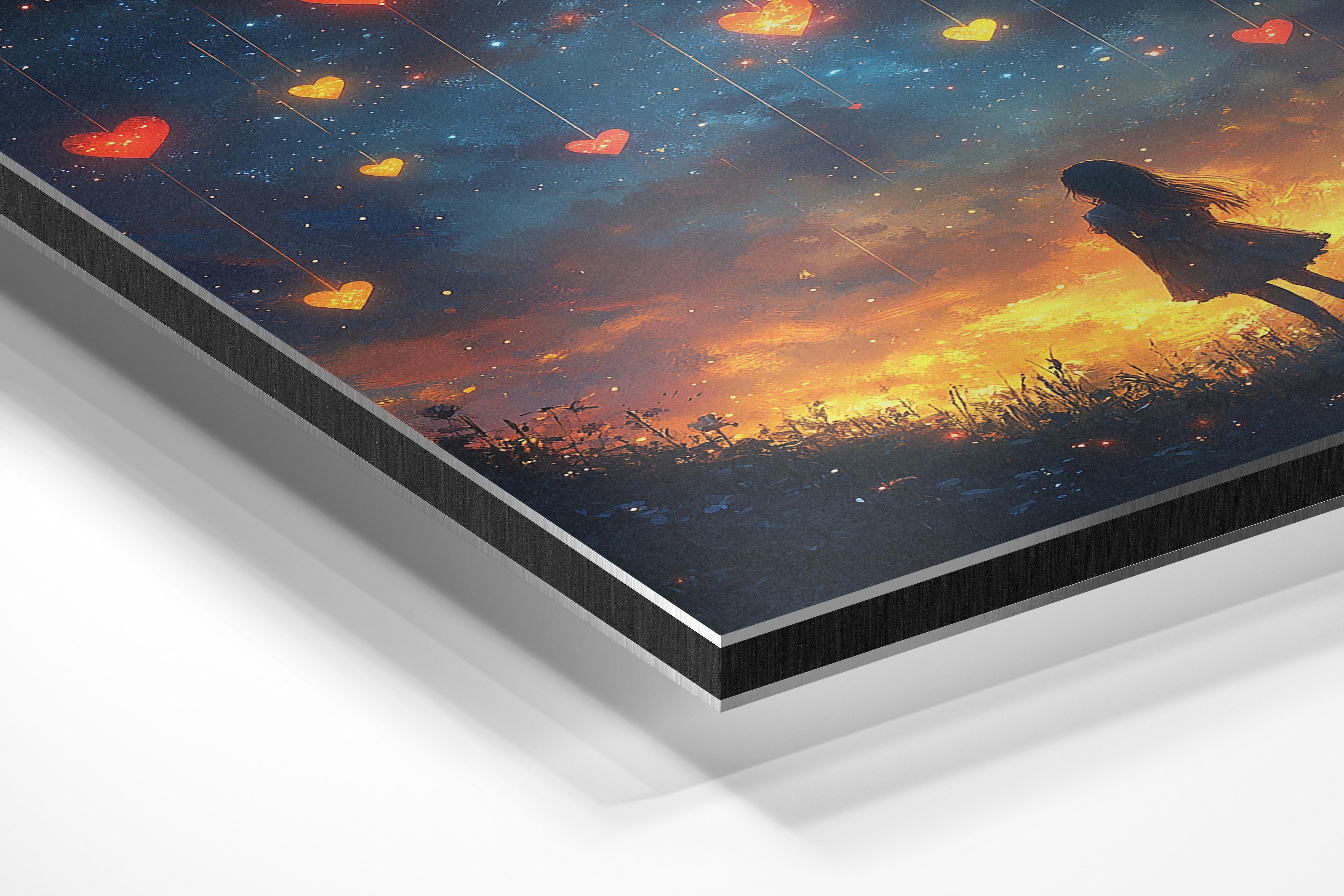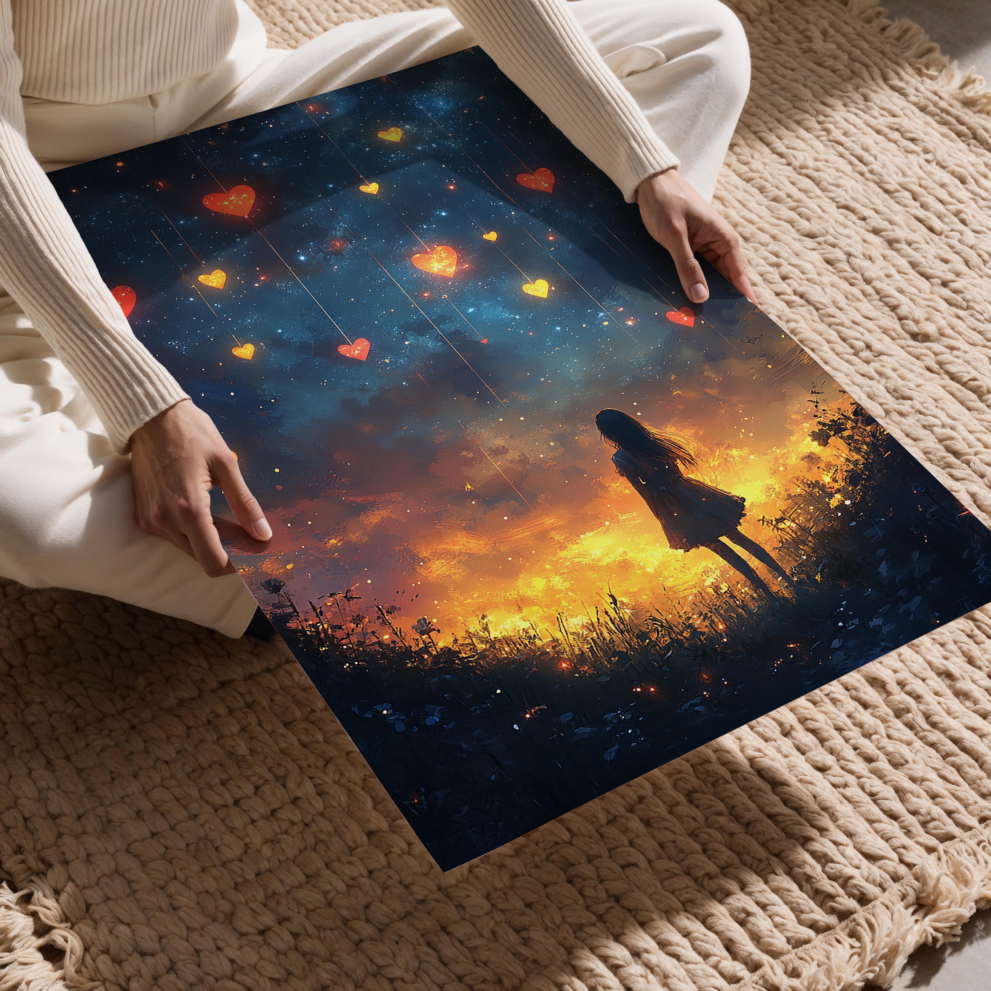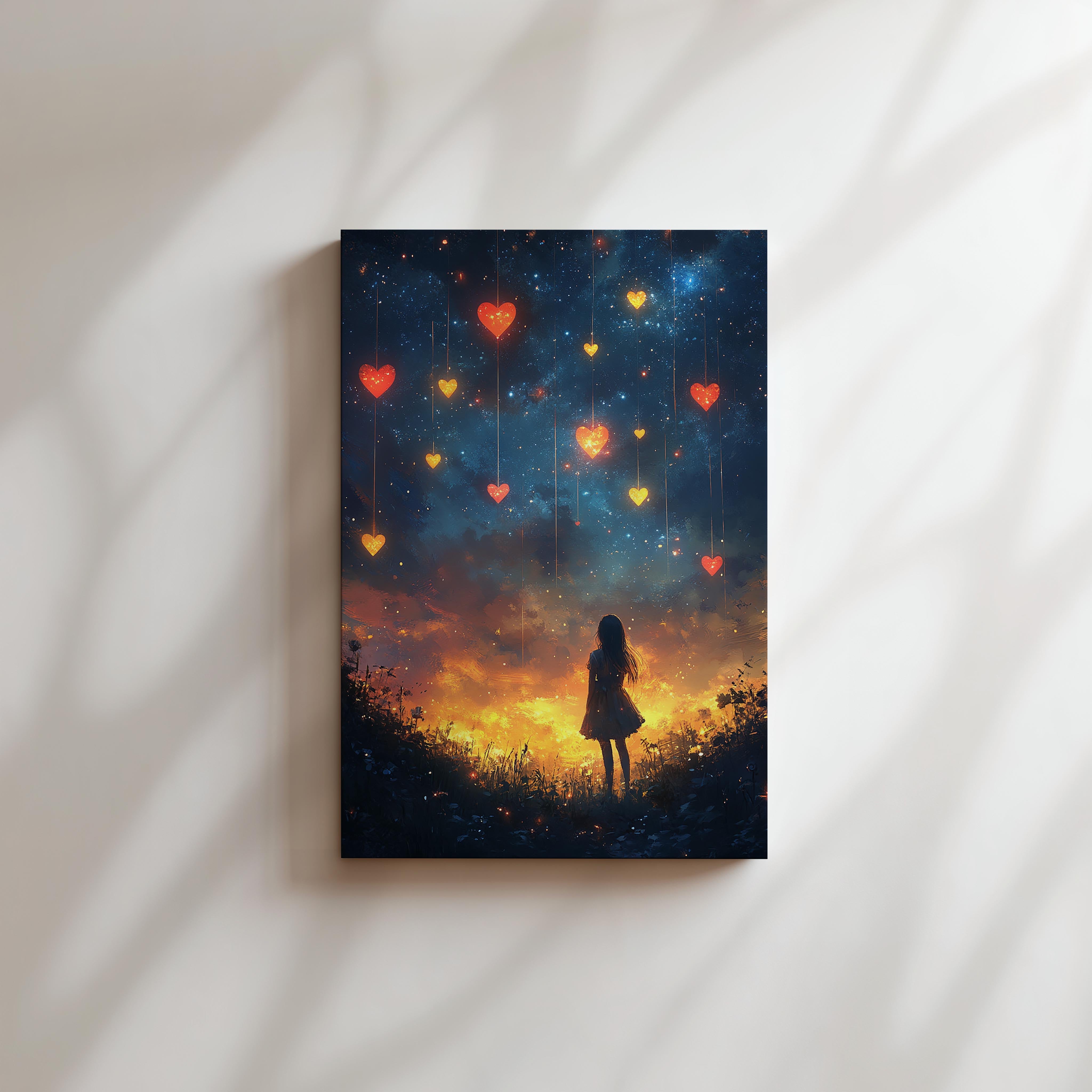 A mesmerizing night scene featuring a girl gazing at glowing hearts suspended in the sky. The vibrant mix of deep blues, oranges, and reds creates a romantic and contemplative atmosphere. This artwork is ideal for creating a dreamy, whimsical mood in bedrooms, living spaces, or areas meant for reflection and relaxation. The cosmic beauty of this piece will appeal to those who enjoy art that evokes emotion and wonder.