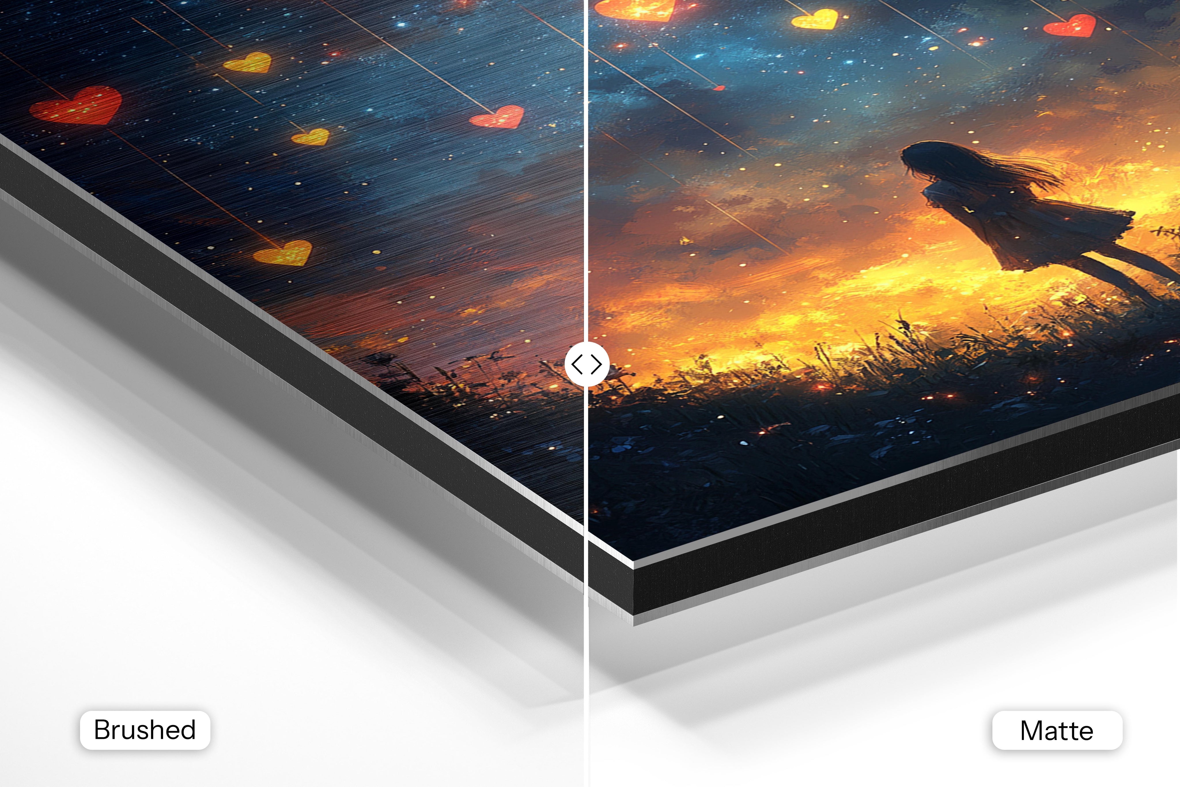 - Brushed Aluminum, on the other hand, features a raw metallic texture with visible brush strokes. Whites and highlights in your image let the silver surface show through, adding a dramatic, shimmering effect. Ideal for black-and-white images, minimalist designs, or abstract art, it creates a bold, industrial vibe with a modern edge.