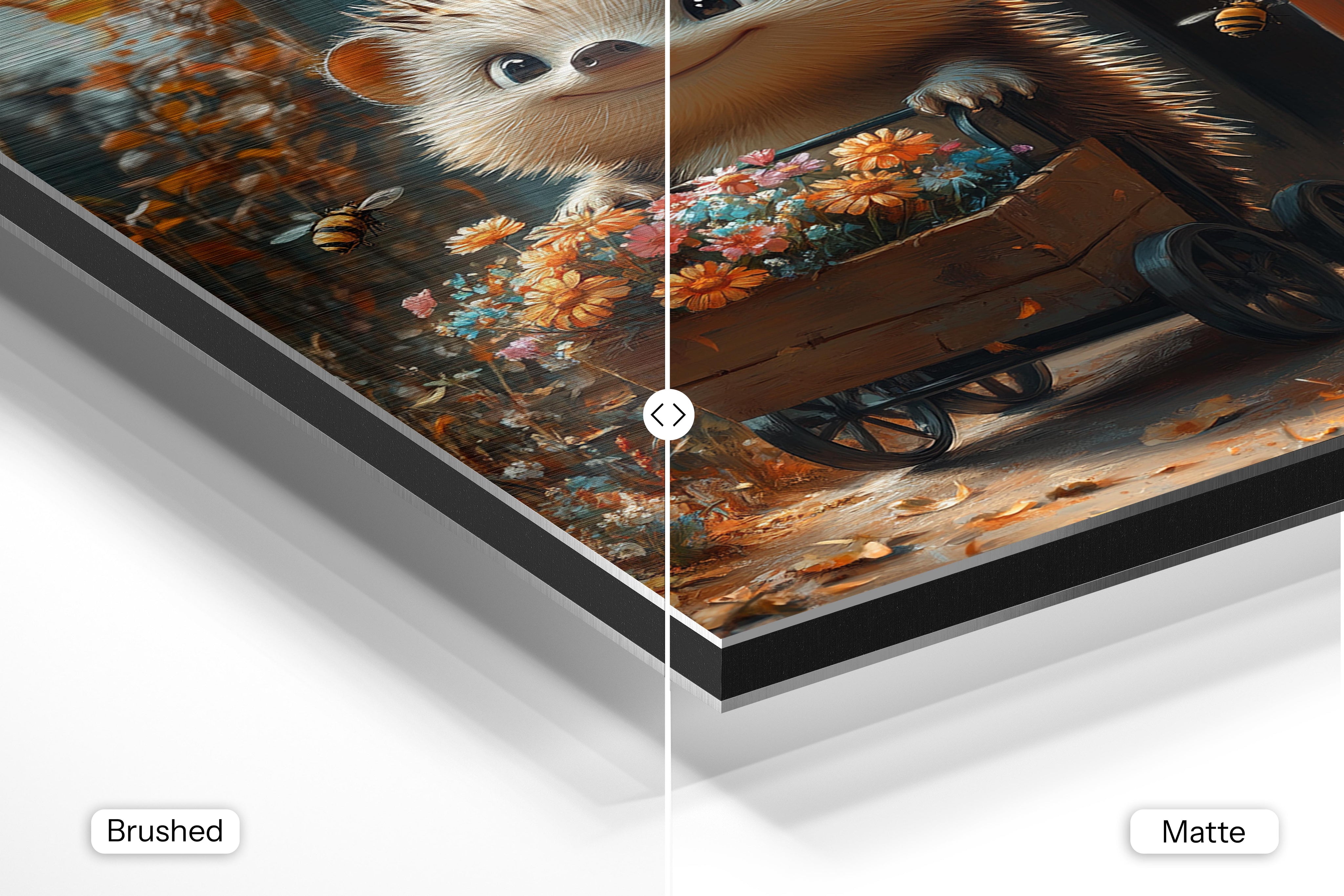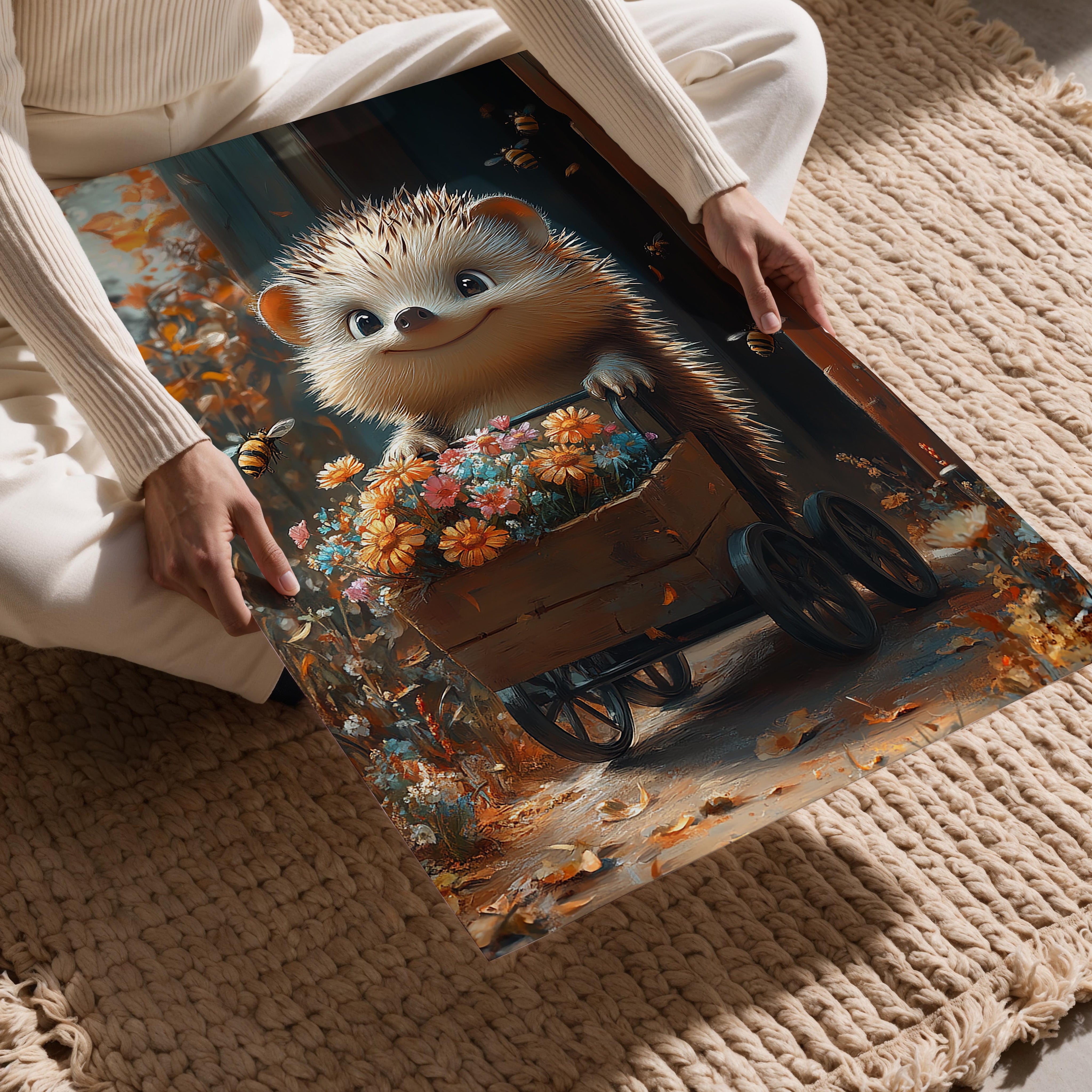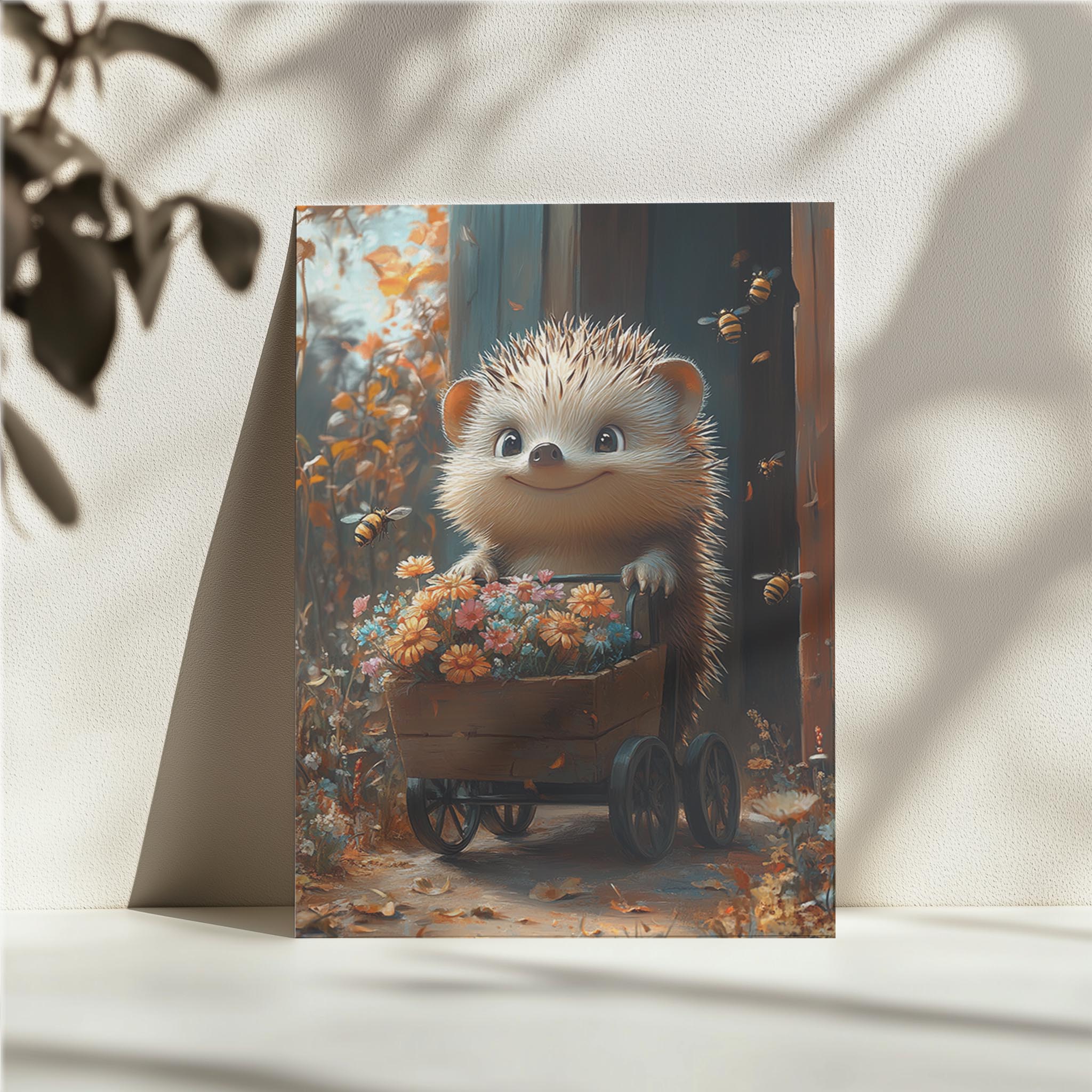 A cheerful hedgehog stands behind a wooden cart filled with colorful blooms, surrounded by buzzing bees. The sunny, autumnal hues create a heartwarming outdoor scene filled with whimsy and joy. This artwork would be an excellent fit for a rustic-themed wall or a nature lover’s collection. The attention to detail in the flowers, combined with the hedgehog’s adorable smile, conveys a sense of playful harmony with nature. It’s a charming piece for children’s spaces, garden-themed décor, or any setting that embraces cheerful, lively energy.