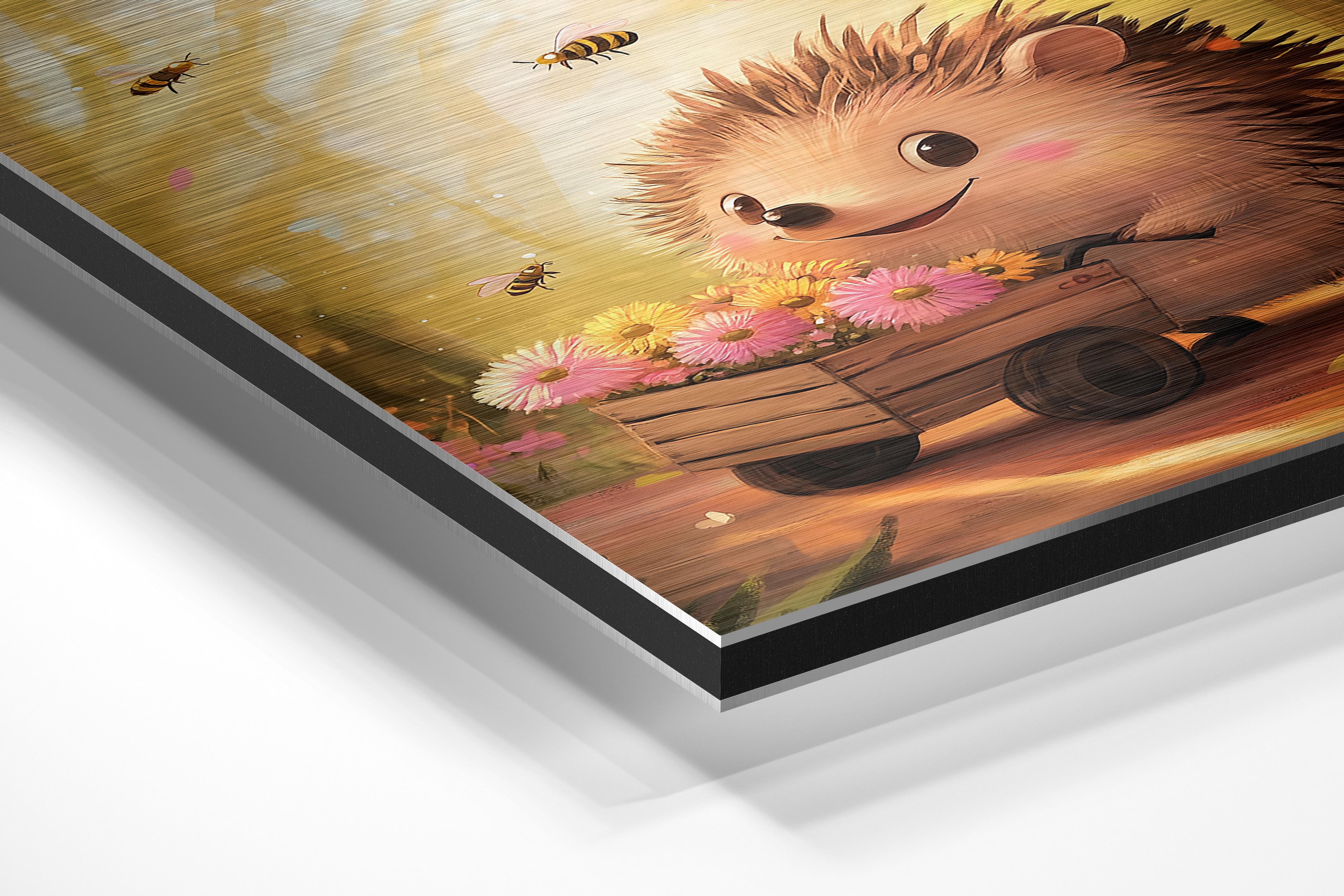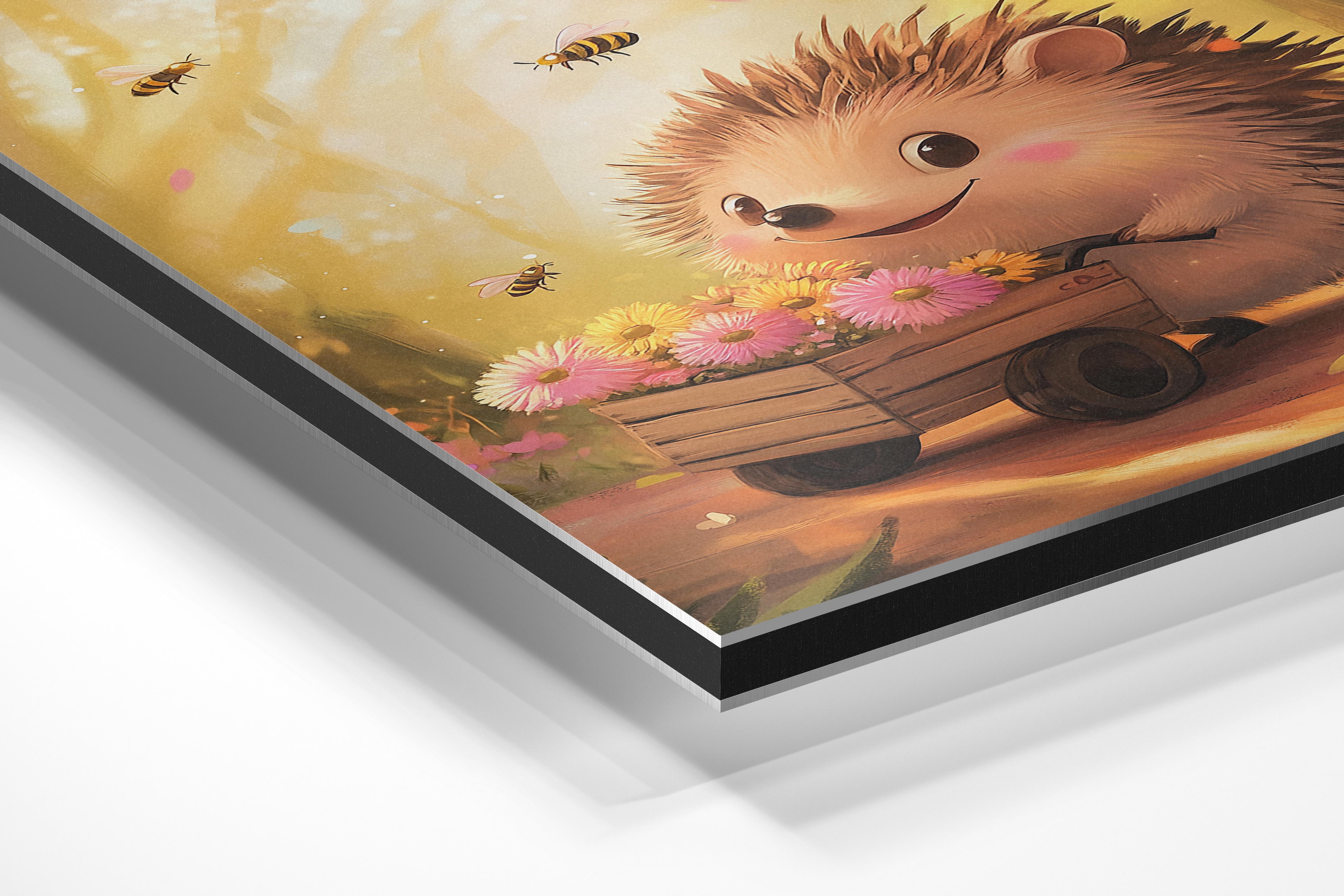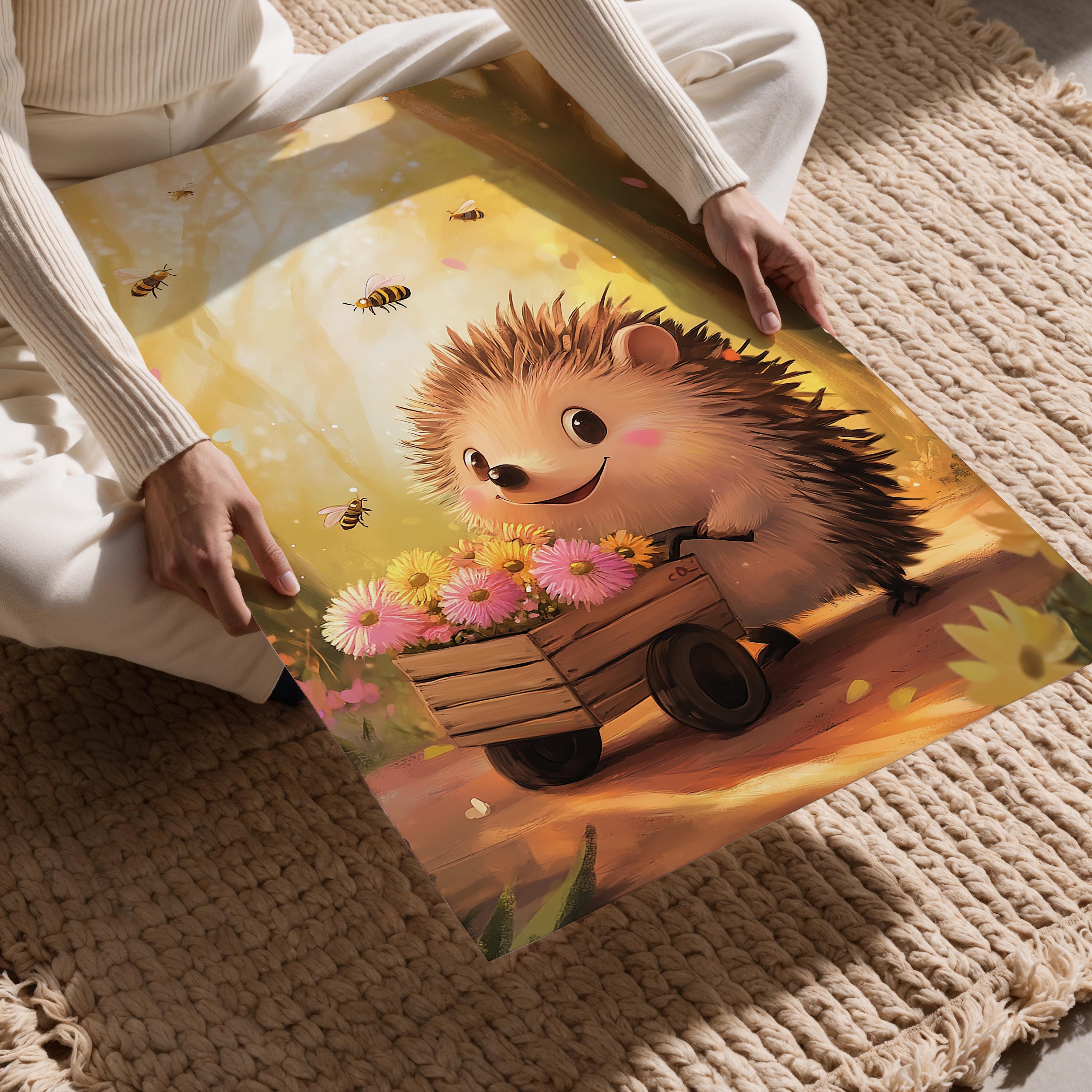 This whimsical artwork portrays an adorable hedgehog joyfully pushing a cart filled with colorful flowers in a sunlit forest. The warm, golden hues create a magical atmosphere, making it perfect for brightening up any living space. The level of detail in the hedgehog’s fur and the delicate blossoms highlights the artist’s skill. The scattering bees and soft lighting further enhance the idyllic, fairy-tale feel. This piece is an excellent choice for children’s rooms, garden-inspired themes, or spaces designed to radiate positivity and cheerfulness.