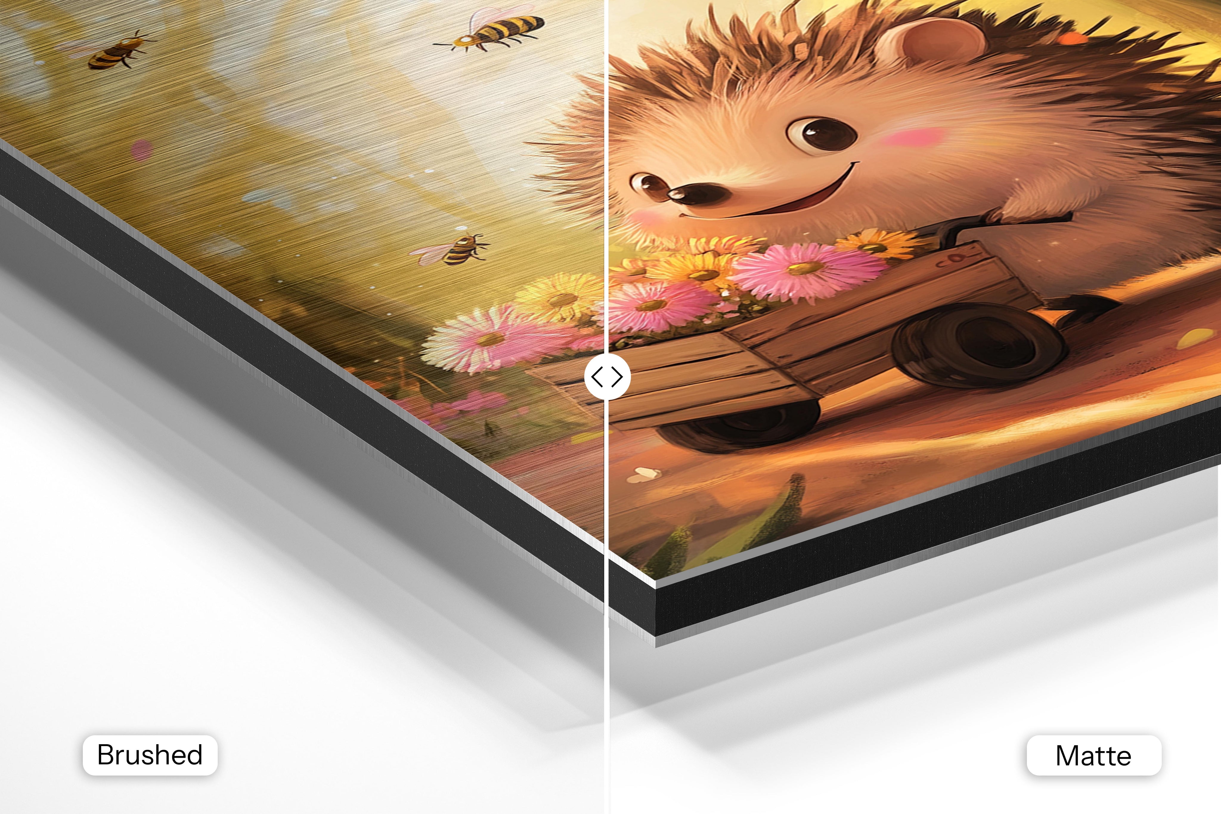 - Brushed Aluminum, on the other hand, features a raw metallic texture with visible brush strokes. Whites and highlights in your image let the silver surface show through, adding a dramatic, shimmering effect. Ideal for black-and-white images, minimalist designs, or abstract art, it creates a bold, industrial vibe with a modern edge.