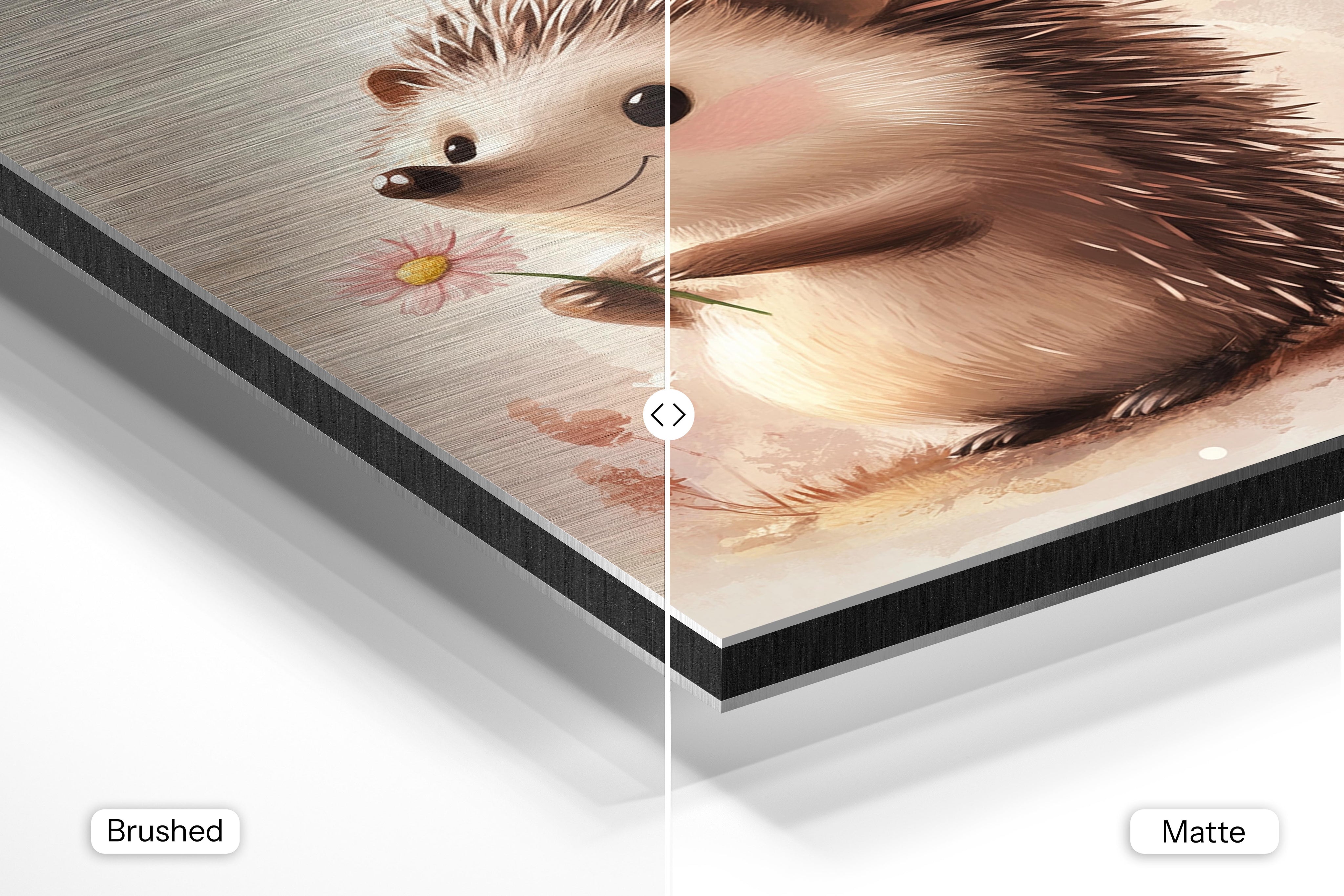 - Brushed Aluminum, on the other hand, features a raw metallic texture with visible brush strokes. Whites and highlights in your image let the silver surface show through, adding a dramatic, shimmering effect. Ideal for black-and-white images, minimalist designs, or abstract art, it creates a bold, industrial vibe with a modern edge.
