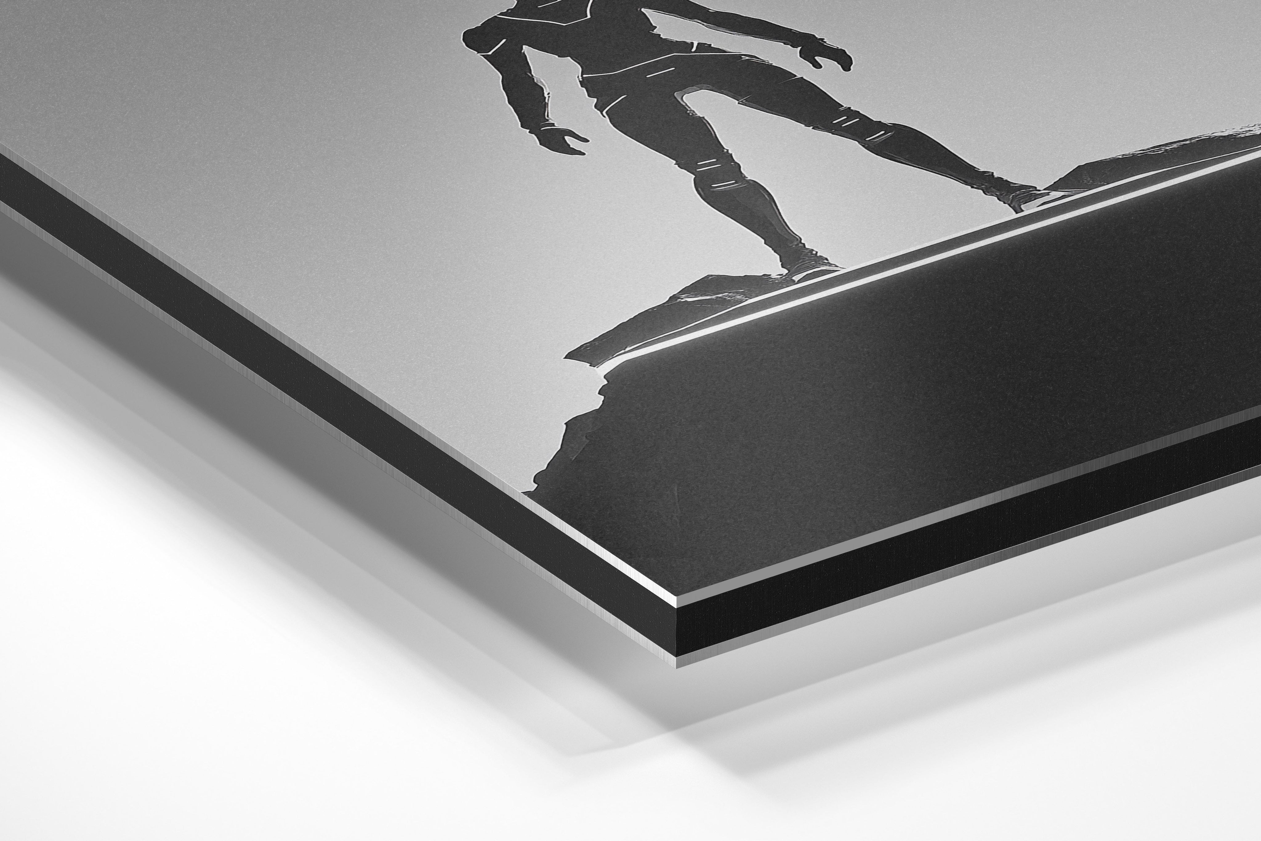 A stunning silhouette of a heroic figure standing confidently on an illuminated platform. The sharp contrast and clean lines create a futuristic and empowering aesthetic, appealing to fans of sci-fi and action genres. This artwork inspires strength and resilience, making it perfect for modern office spaces or personal areas focused on motivation and creativity. Its minimalist approach ensures it fits seamlessly into contemporary interiors while delivering a powerful visual impact.