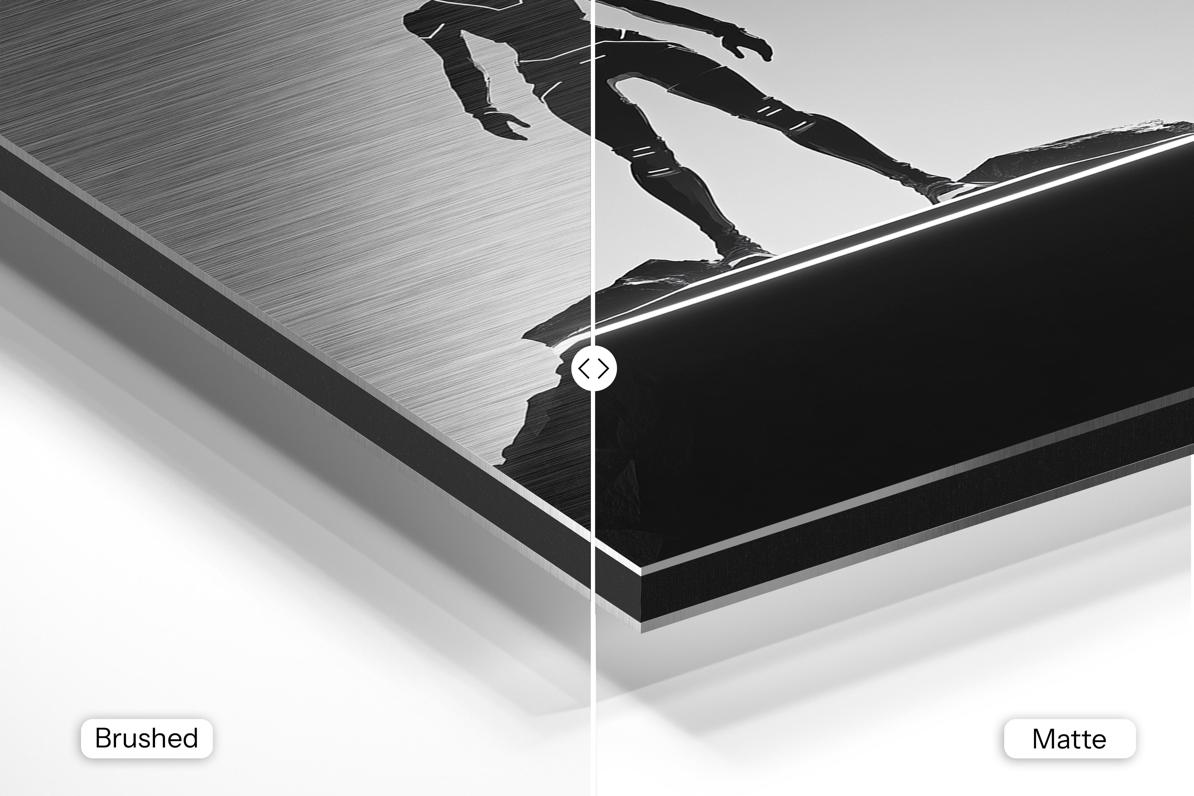 - Brushed Aluminum, on the other hand, features a raw metallic texture with visible brush strokes. Whites and highlights in your image let the silver surface show through, adding a dramatic, shimmering effect. Ideal for black-and-white images, minimalist designs, or abstract art, it creates a bold, industrial vibe with a modern edge.