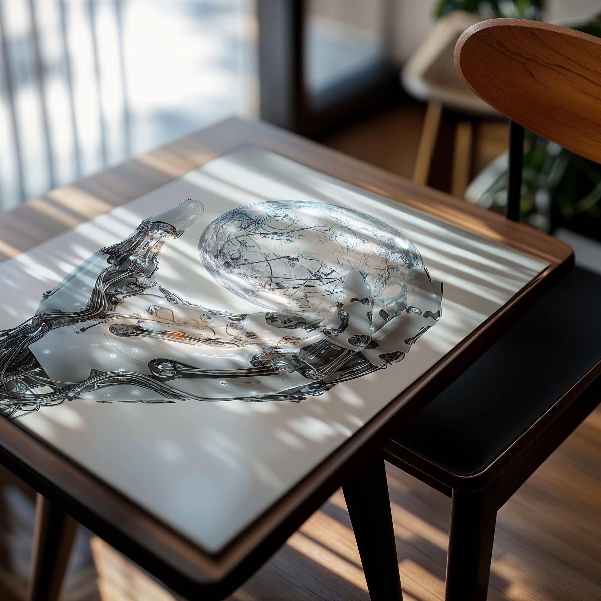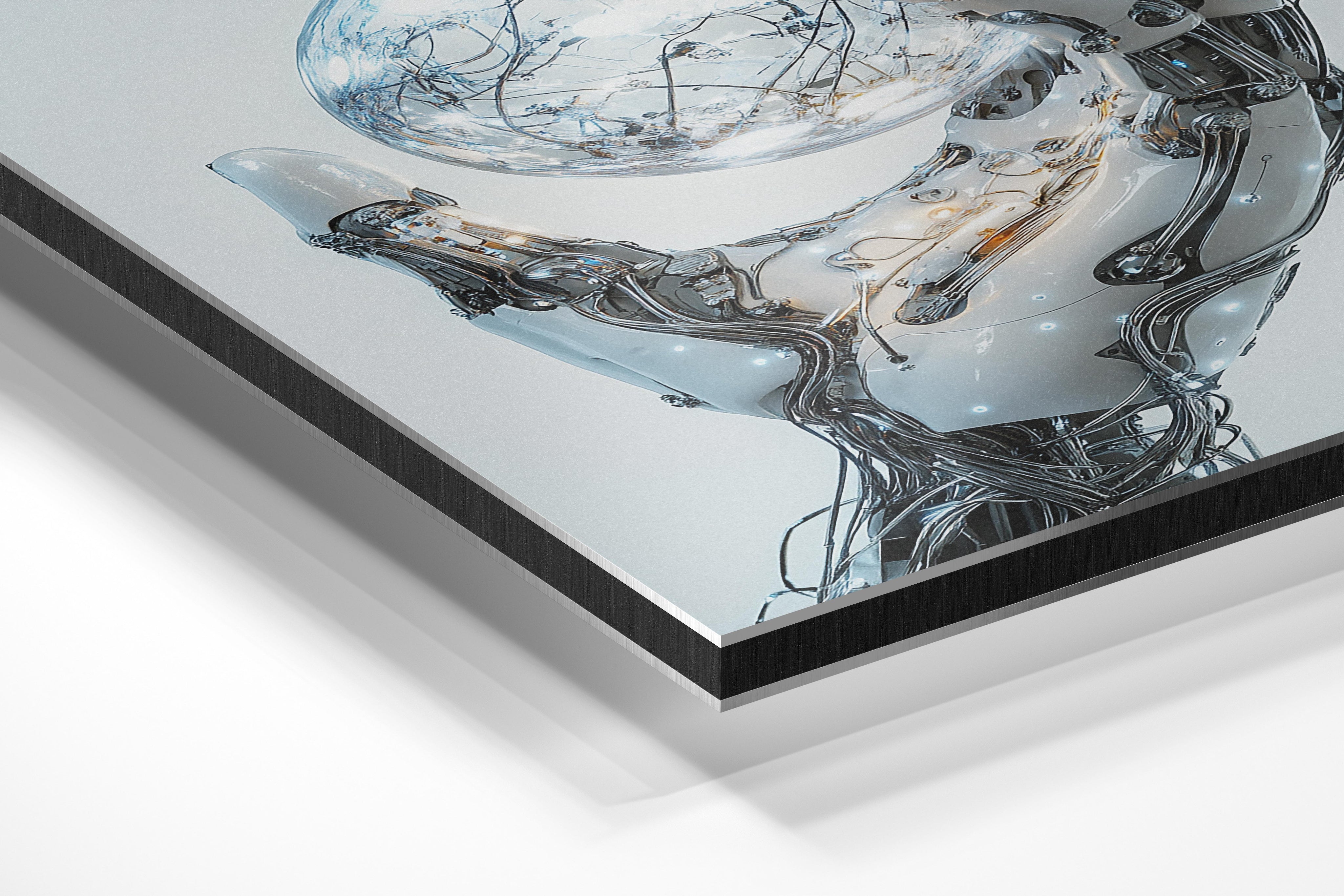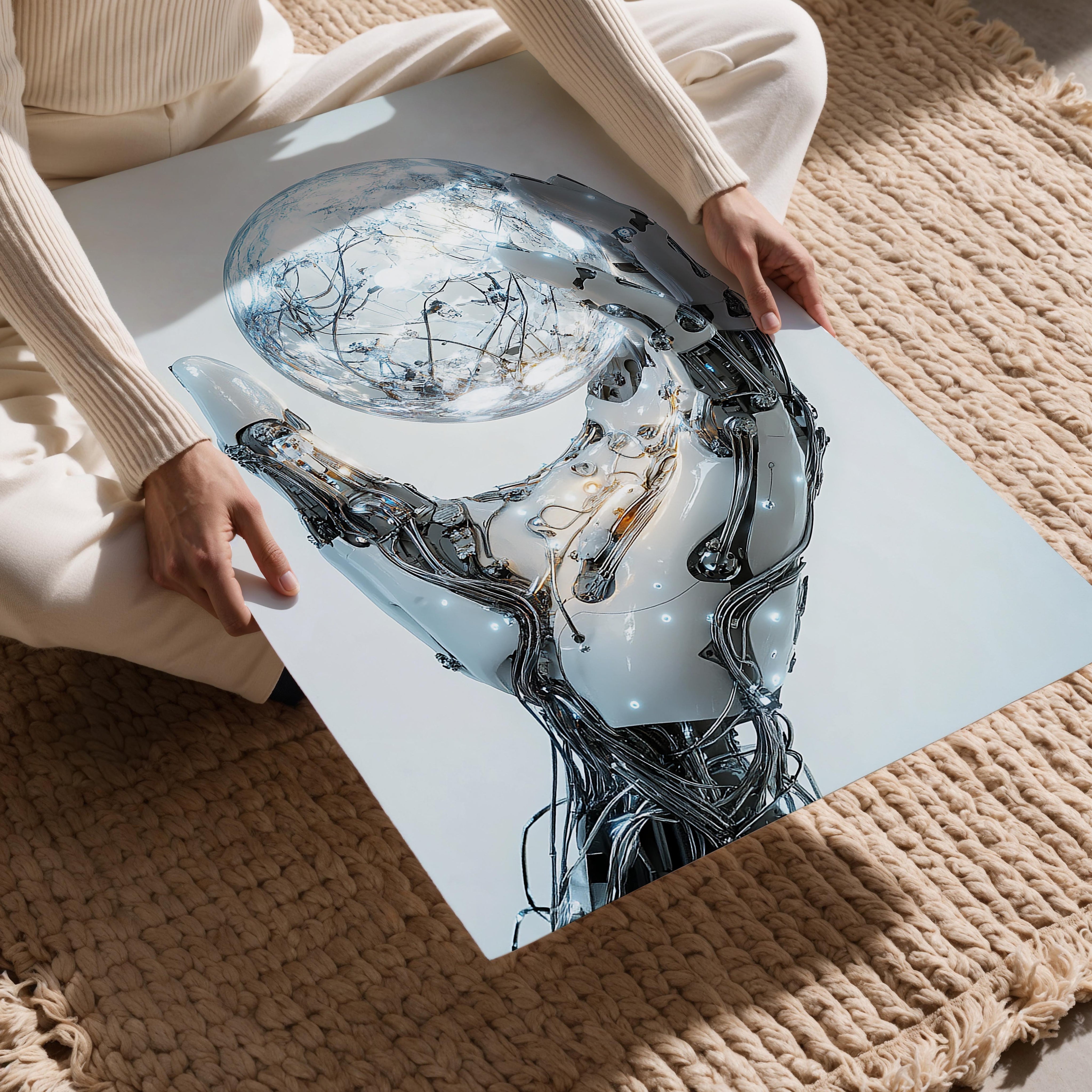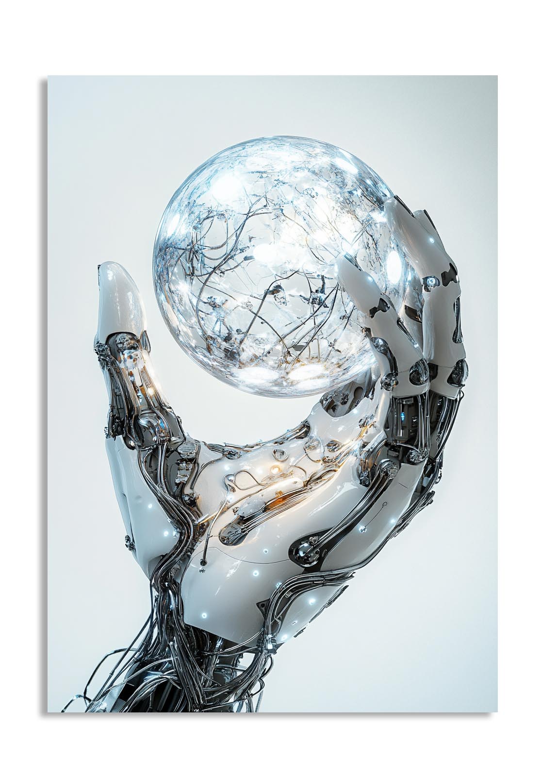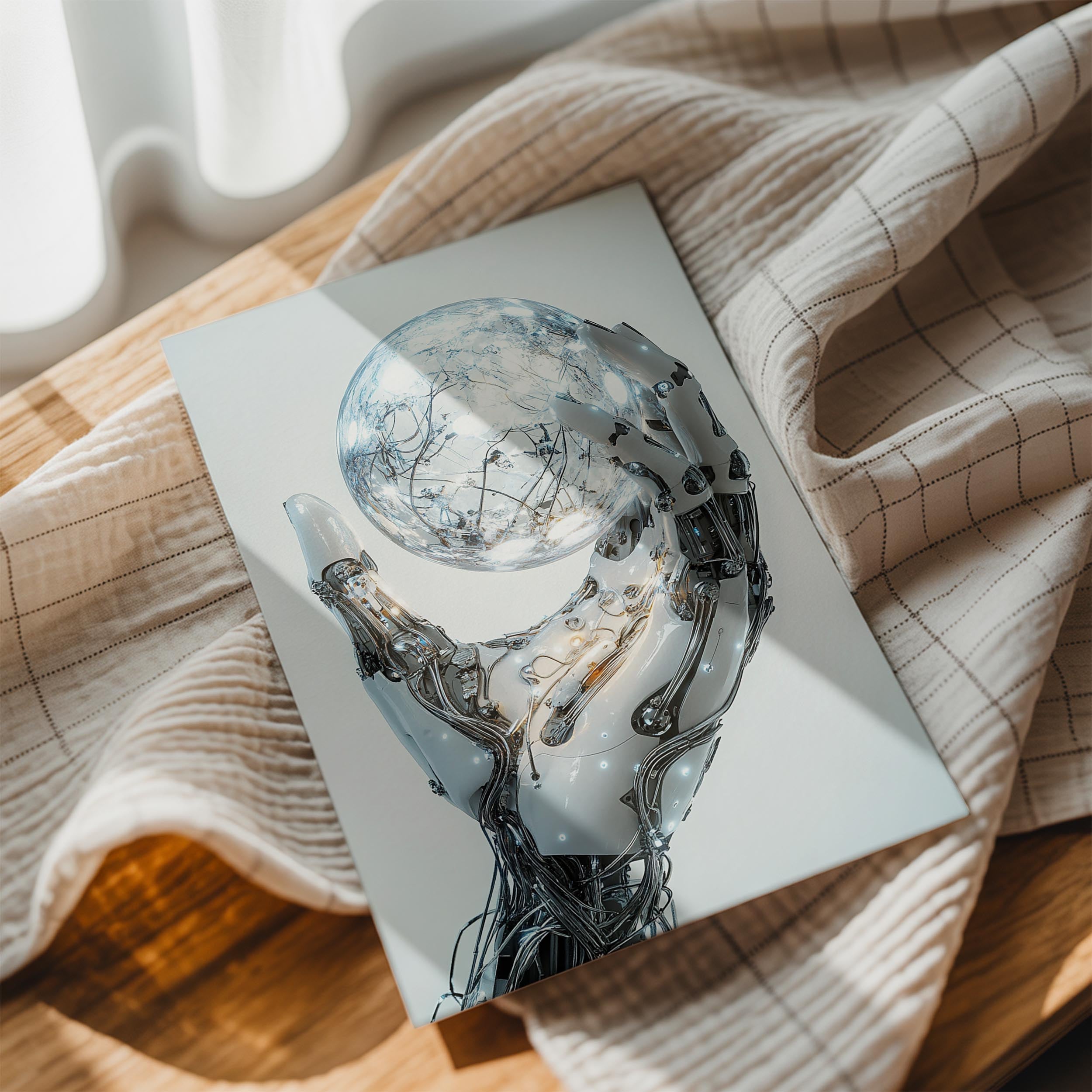 A futuristic holographic orb held in a robotic hand. This artwork showcases the perfect blend of AI, robotics, and interactive holographic technologies, suitable for high-tech concepts.