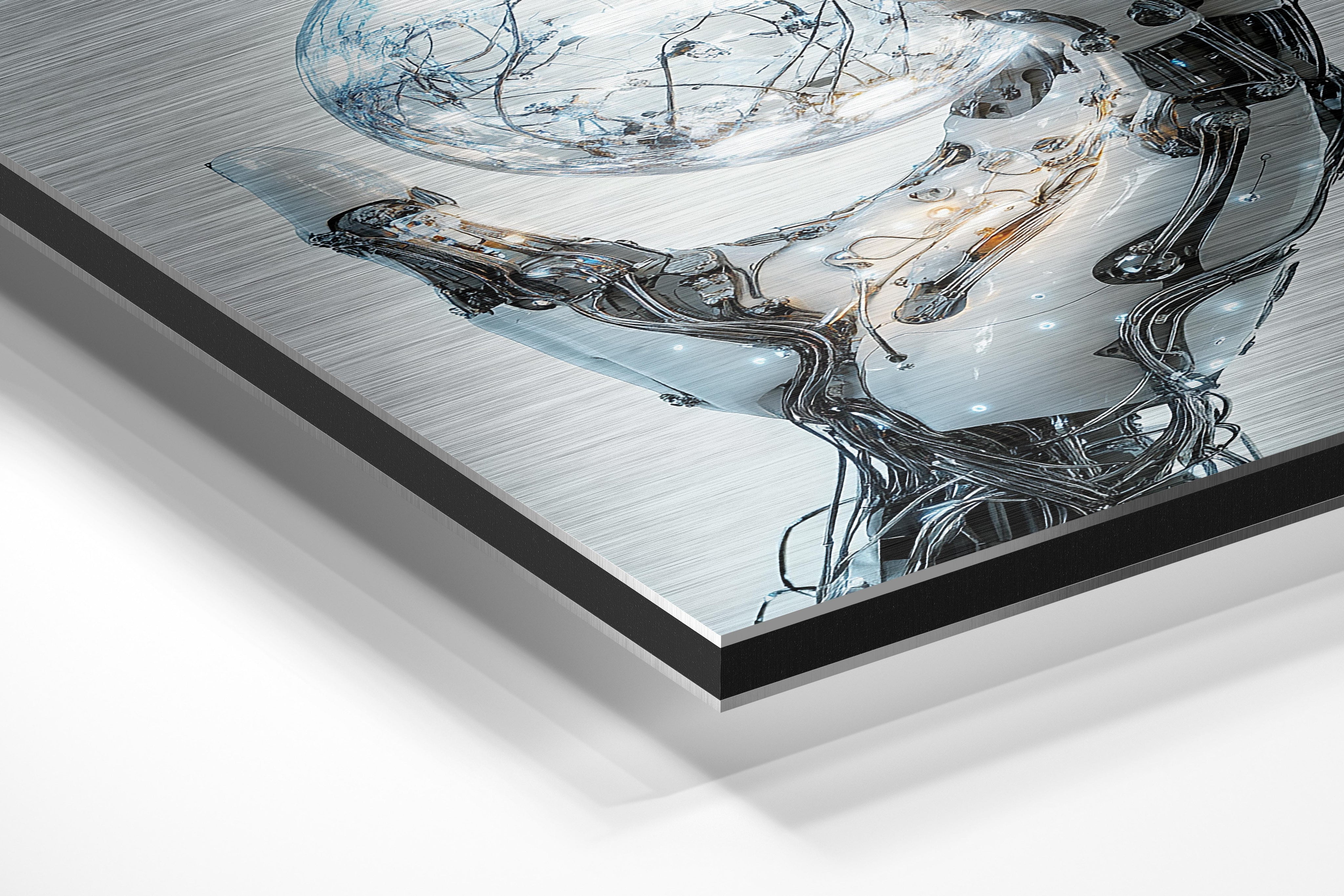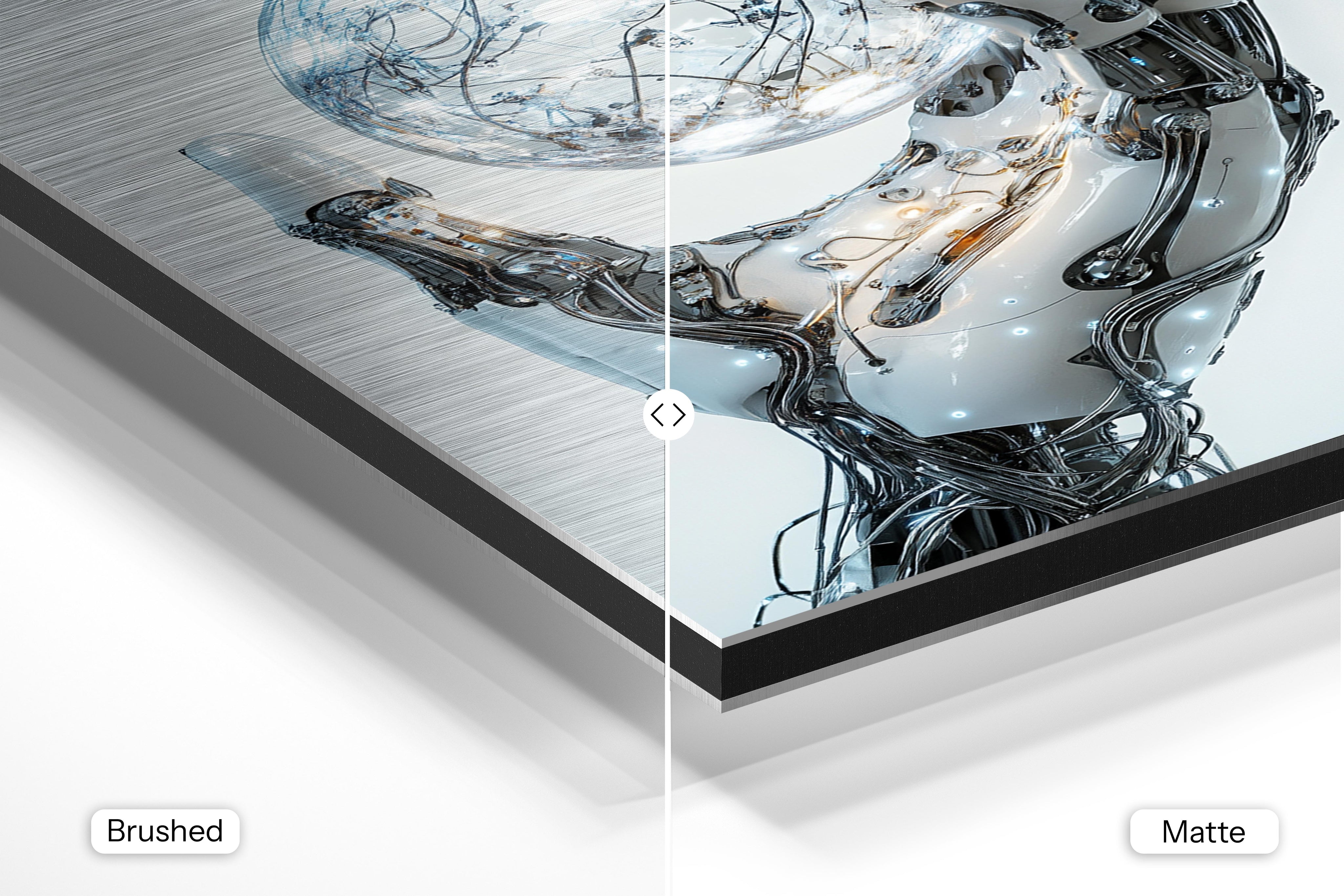 - Brushed Aluminum, on the other hand, features a raw metallic texture with visible brush strokes. Whites and highlights in your image let the silver surface show through, adding a dramatic, shimmering effect. Ideal for black-and-white images, minimalist designs, or abstract art, it creates a bold, industrial vibe with a modern edge.