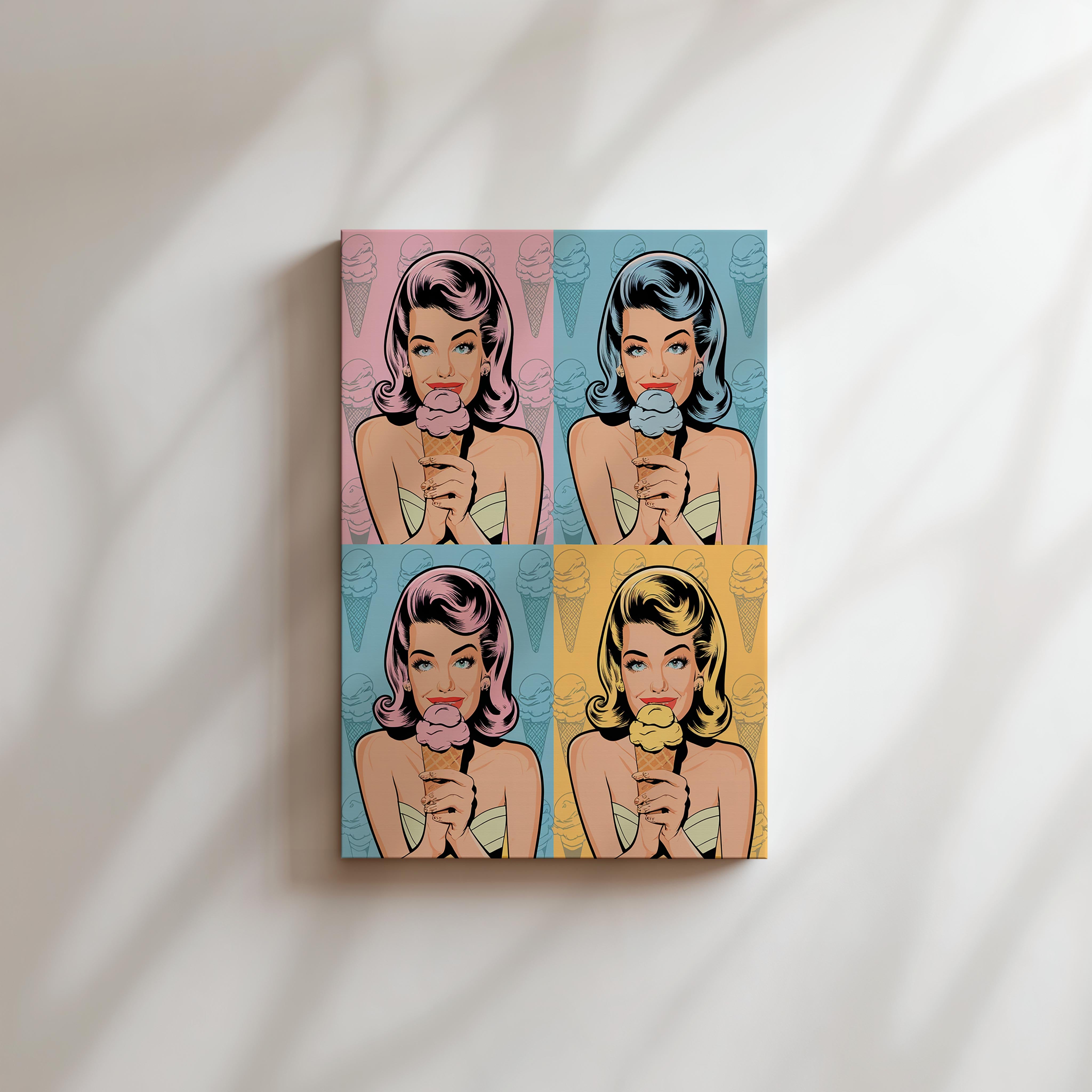 A retro woman holding ice cream appears in four color palettes, channeling 1950s charm. Perfect for vintage lovers and dessert spaces.