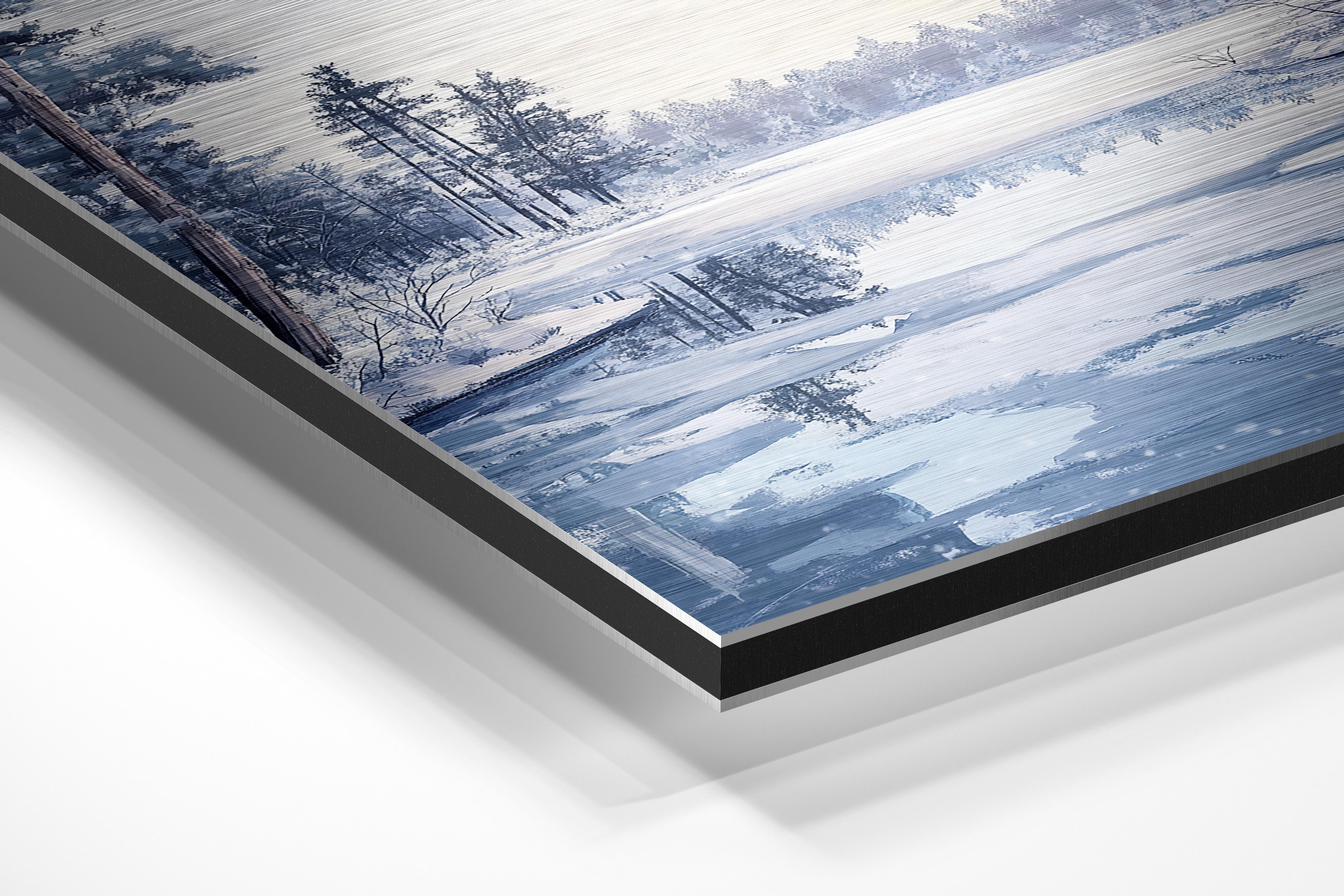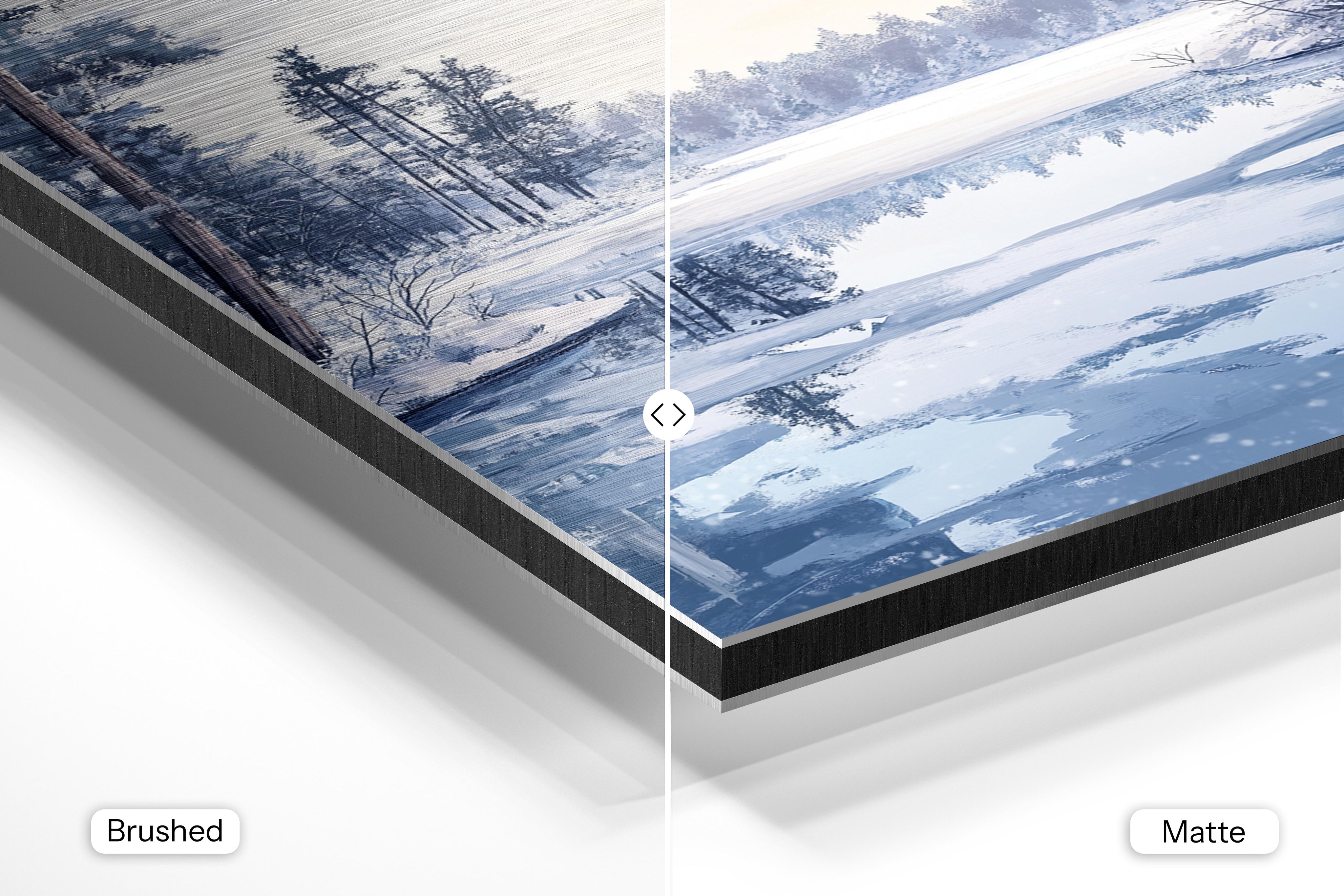 - Brushed Aluminum, on the other hand, features a raw metallic texture with visible brush strokes. Whites and highlights in your image let the silver surface show through, adding a dramatic, shimmering effect. Ideal for black-and-white images, minimalist designs, or abstract art, it creates a bold, industrial vibe with a modern edge.