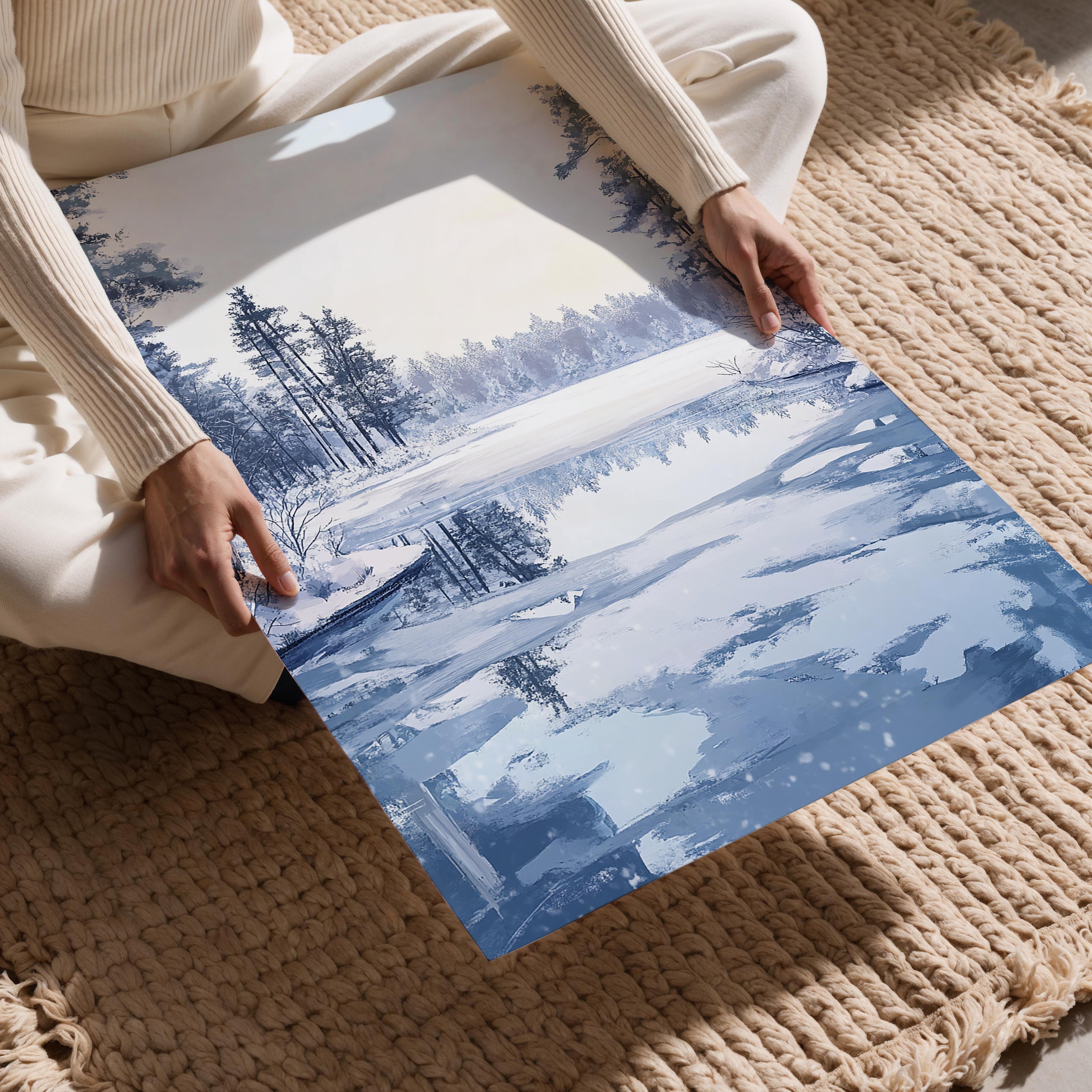A serene icy river winds through a winter landscape, framed by snow-covered trees and a pale blue sky. The stillness of the water mirrors the quiet of the surroundings, creating a calming and meditative atmosphere. Every detail, from the frost-covered branches to the subtle reflections on the water, contributes to the overall sense of peace. This image captures the essence of winter’s beauty, offering a glimpse into a world of tranquility. Ideal for those who find inspiration in nature, it is a celebration of the quiet power and elegance of the season.