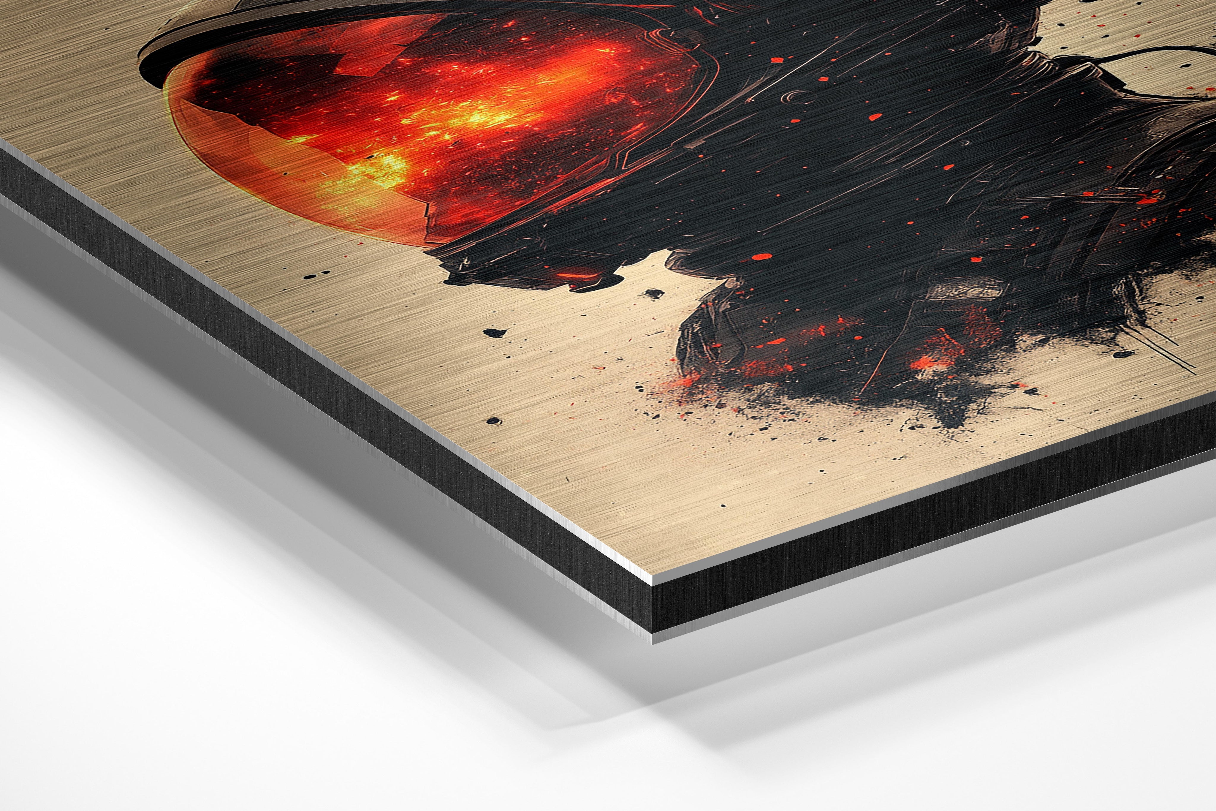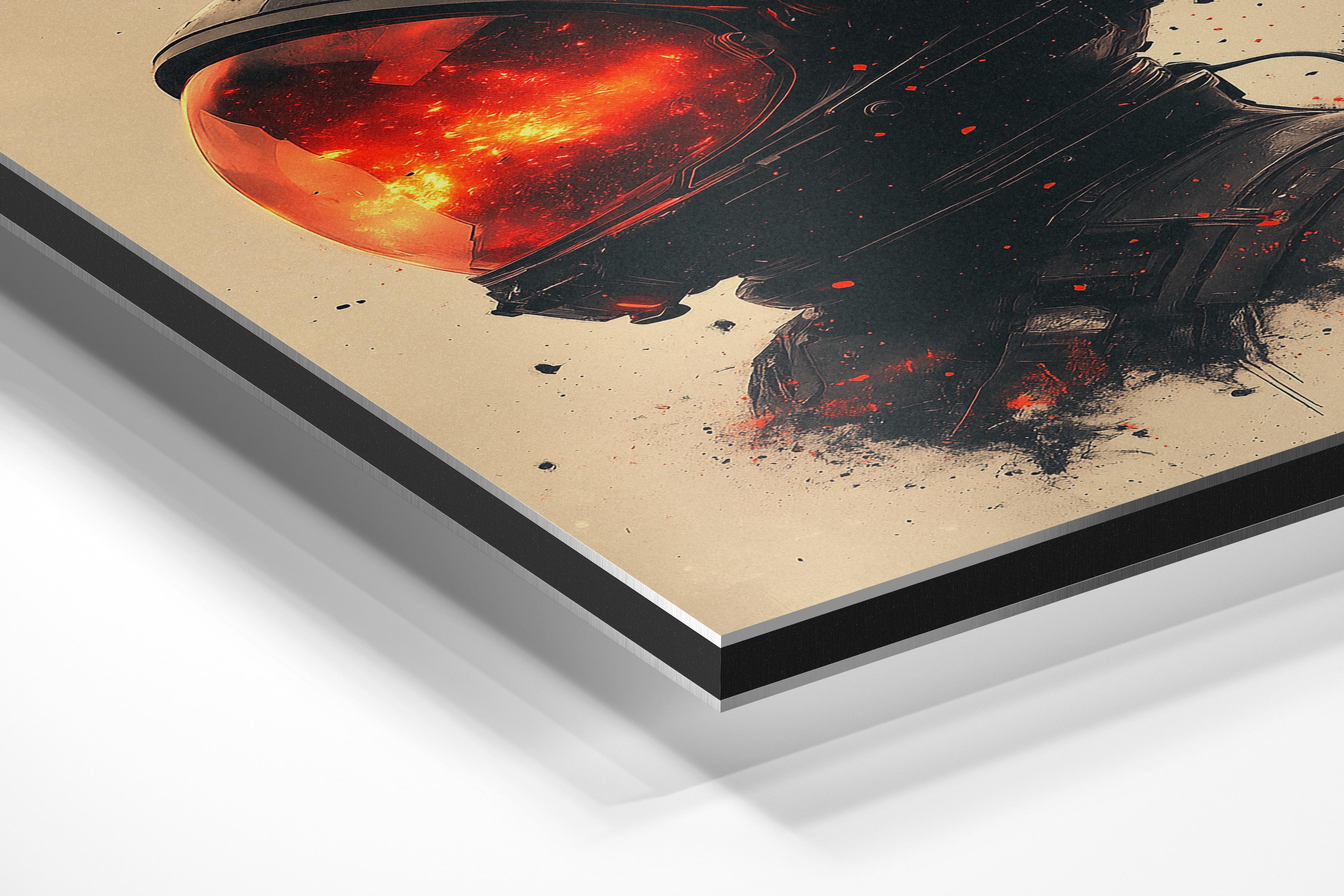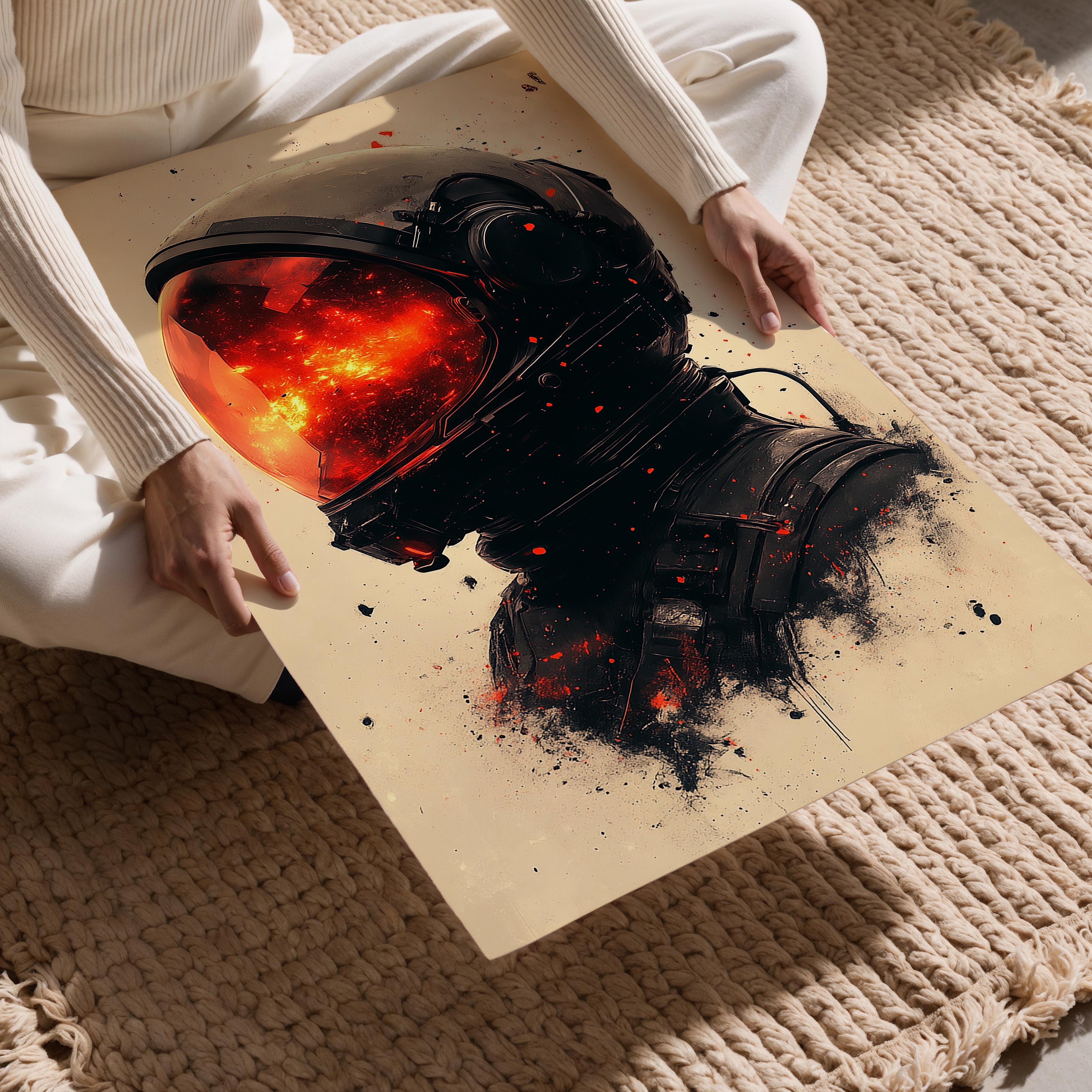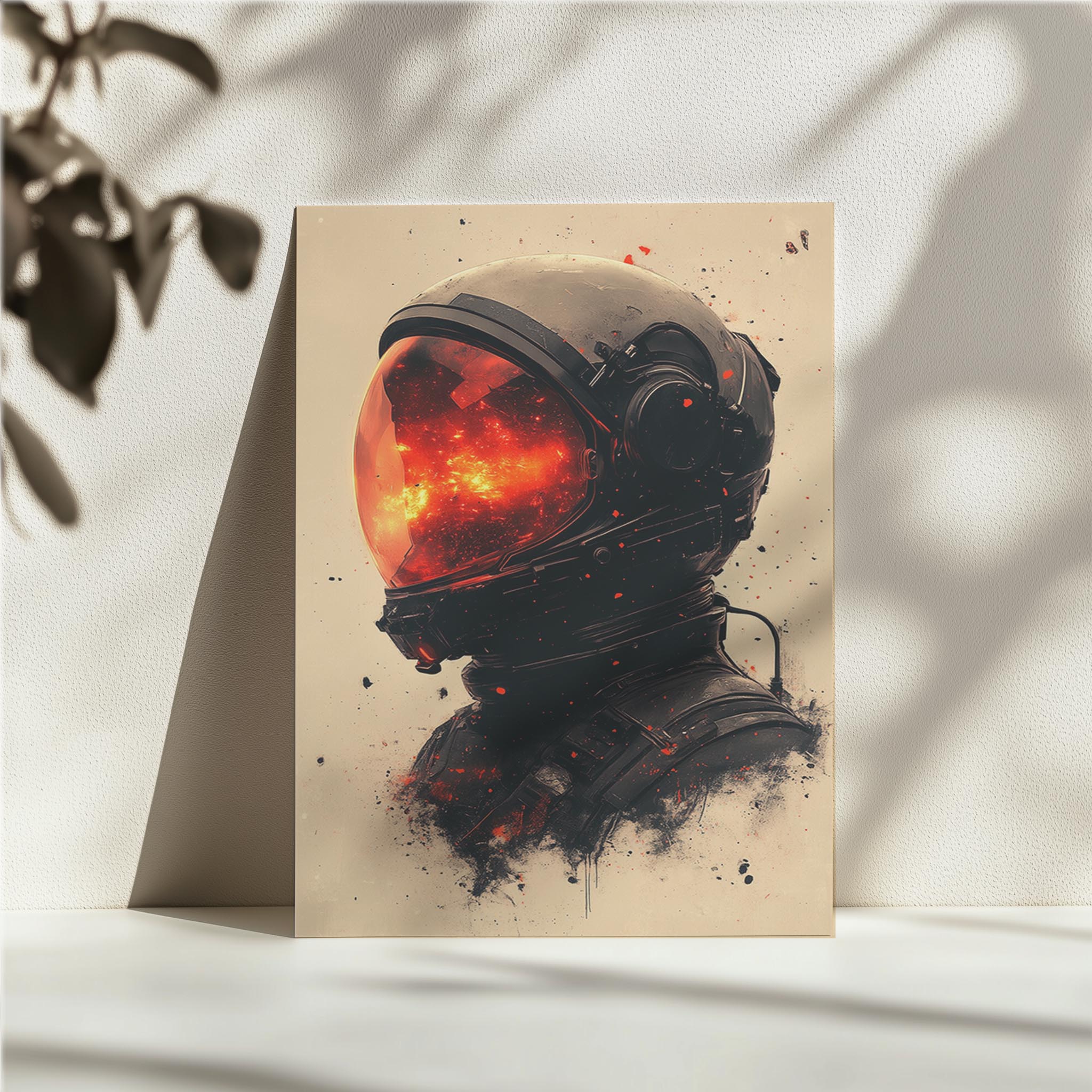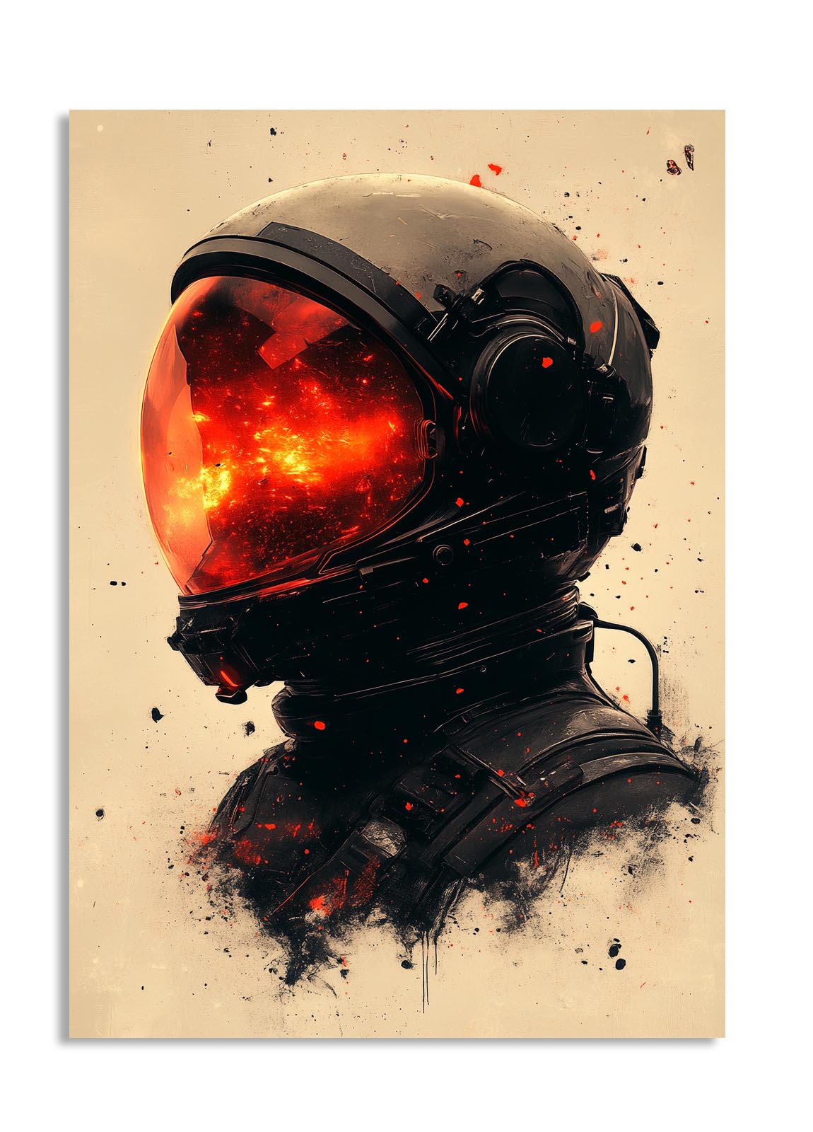 A futuristic astronaut helmet, engulfed in an infernal glow, reflecting what seems to be a cosmic explosion. The deep blacks of the suit contrast sharply with the raging flames in the visor, creating a visually intense and thought-provoking piece. This artwork embodies the tension between the beauty and danger of space travel, making it ideal for fans of sci-fi and adventure. The dynamic, almost cinematic quality of the piece makes it a great focal point in gaming setups, media rooms, or modern interiors, where it adds a dramatic and energetic flair.