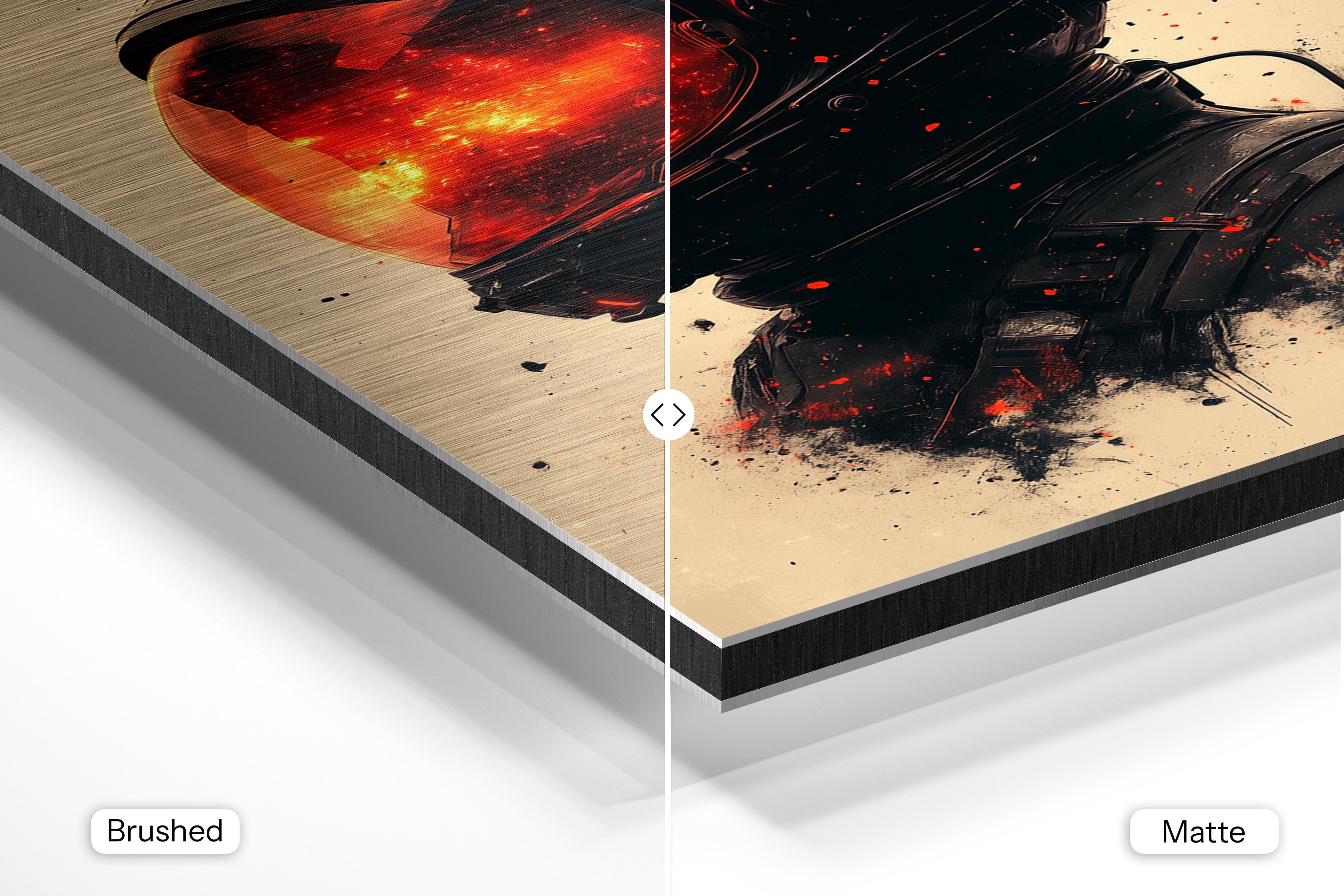 - Brushed Aluminum, on the other hand, features a raw metallic texture with visible brush strokes. Whites and highlights in your image let the silver surface show through, adding a dramatic, shimmering effect. Ideal for black-and-white images, minimalist designs, or abstract art, it creates a bold, industrial vibe with a modern edge.