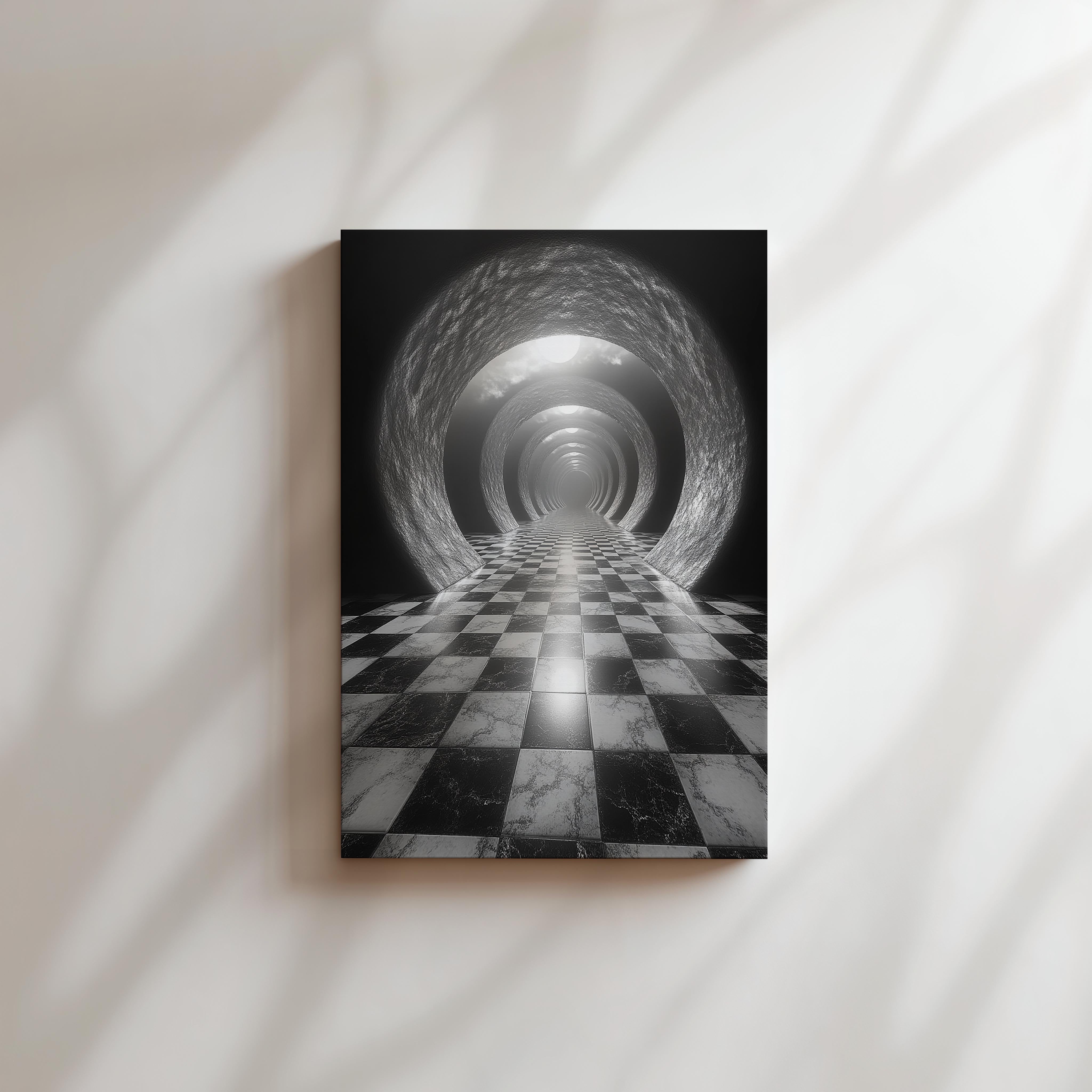 This surreal piece features a black-and-white checkerboard floor stretching into an infinite tunnel of glowing circular portals. The stark contrasts and mesmerizing perspective evoke a sense of wonder and intrigue. Perfect for contemporary or eclectic interiors, this artwork adds a bold, artistic statement to hallways, lounges, or creative spaces.