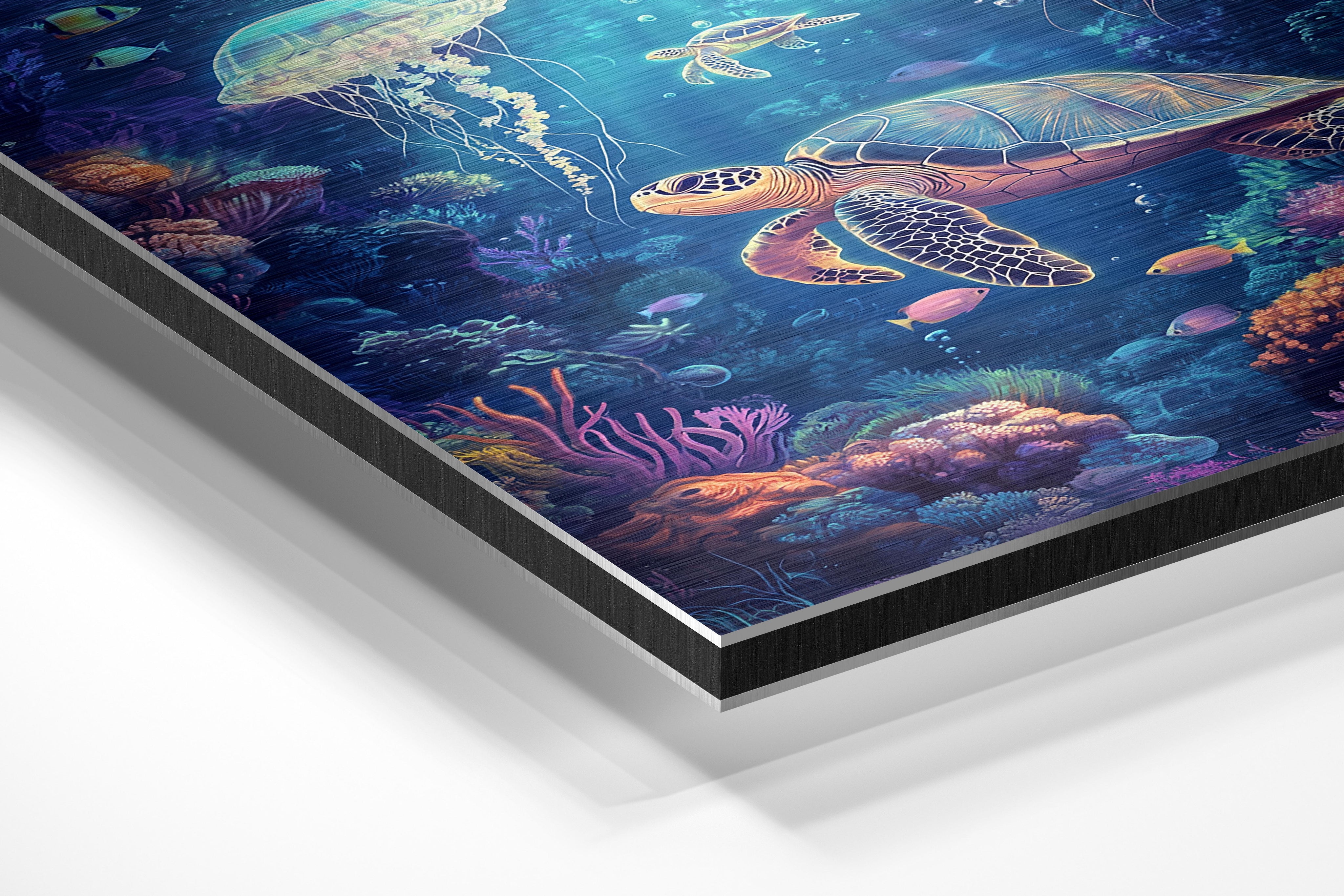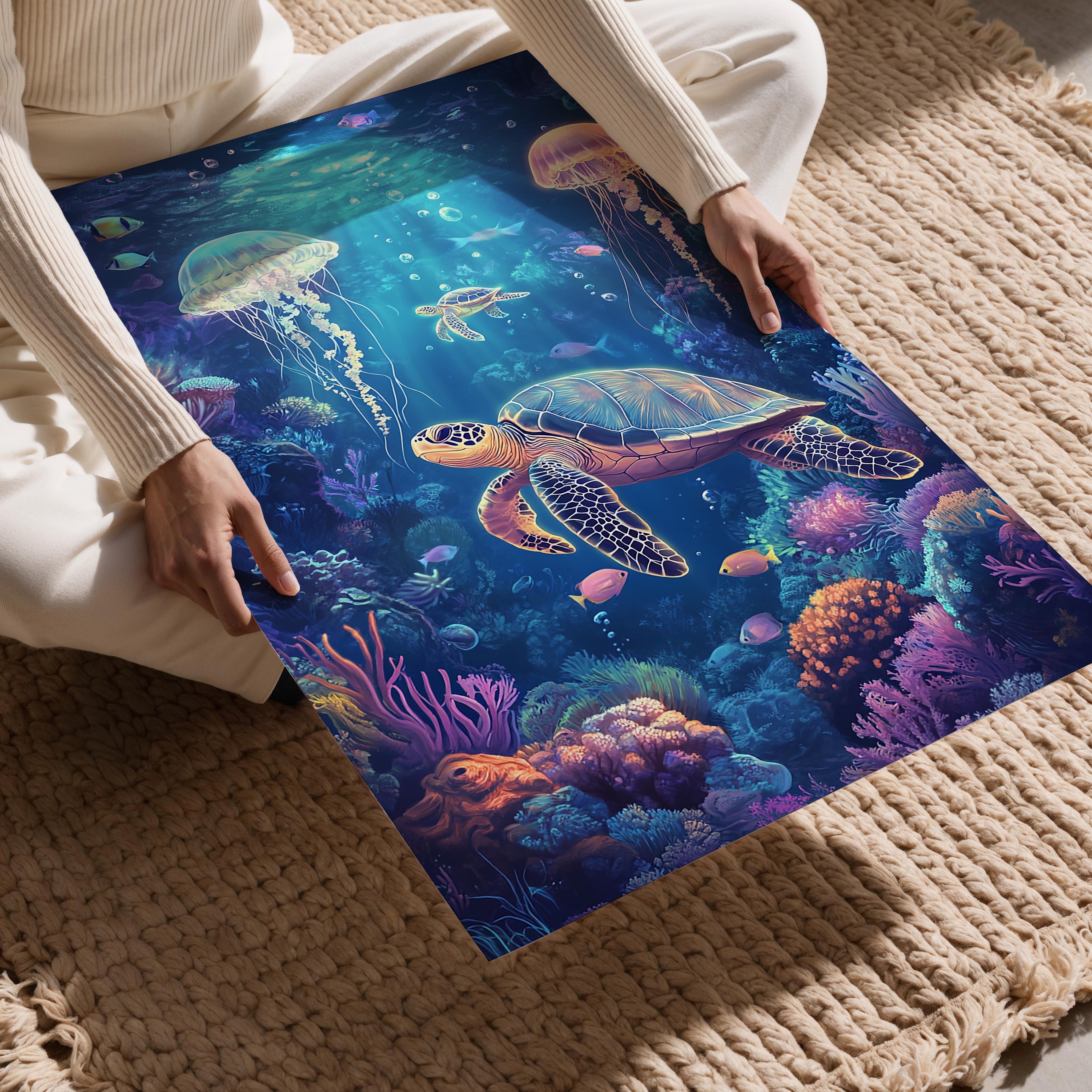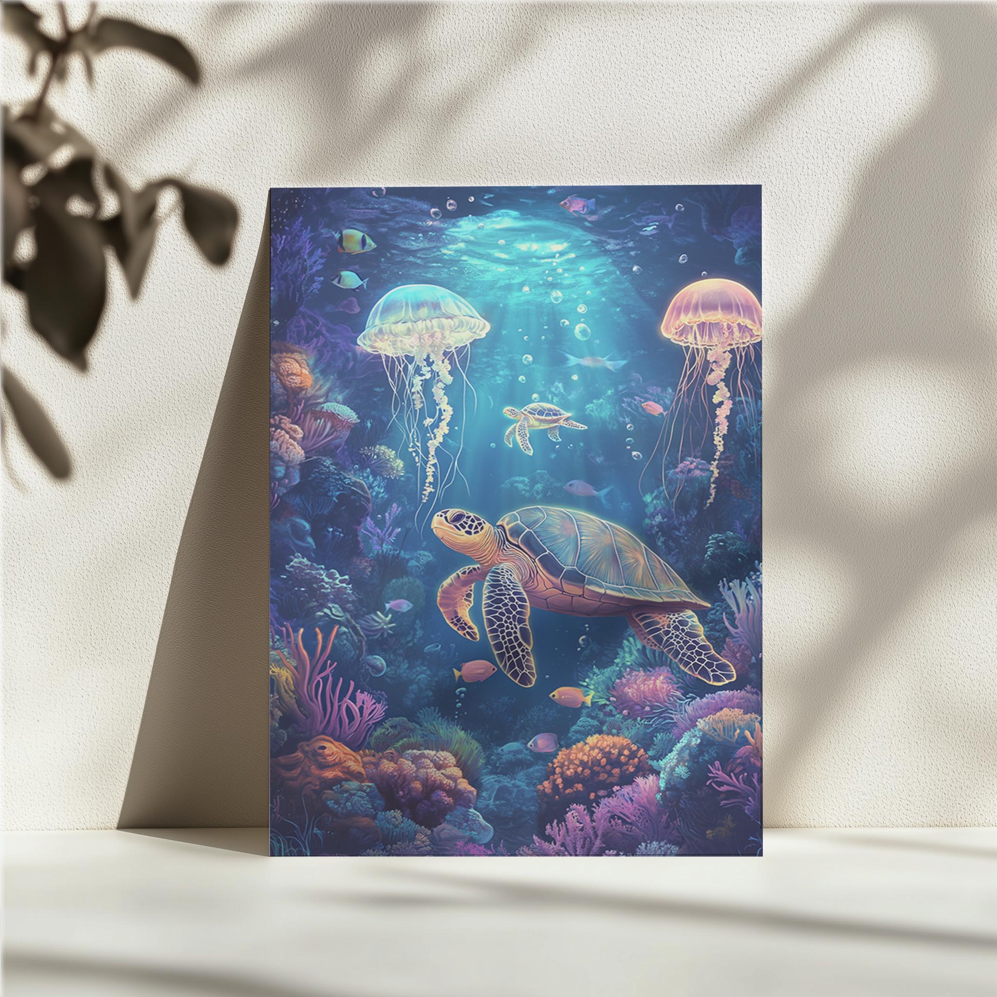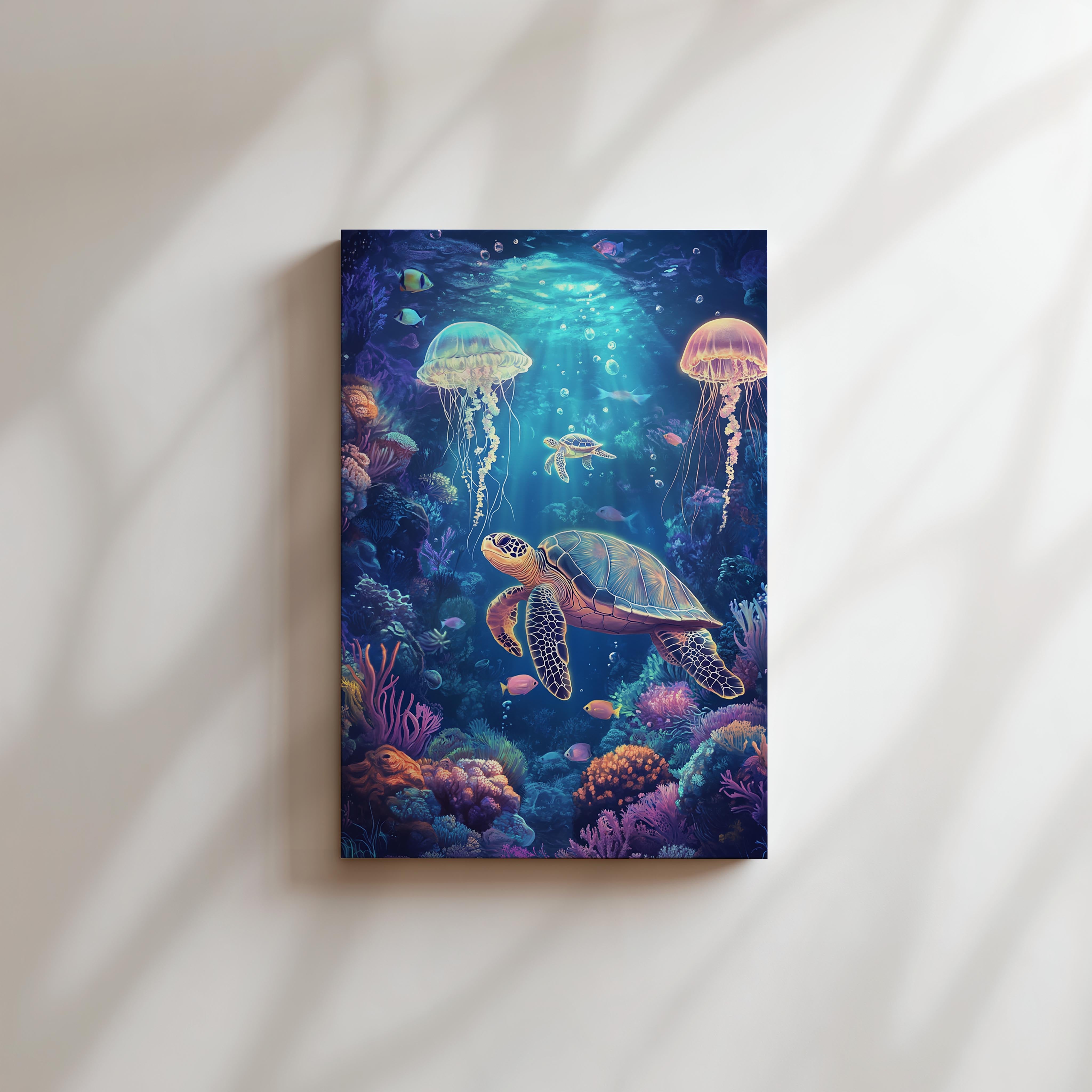 An underwater marvel featuring a sea turtle surrounded by jellyfish and a vibrant coral reef. The intricate details and glowing jellyfish make this artwork a stunning representation of marine life. Ideal for ocean lovers, this piece is perfect for bathrooms, living rooms, or any space needing a burst of underwater serenity and beauty.
