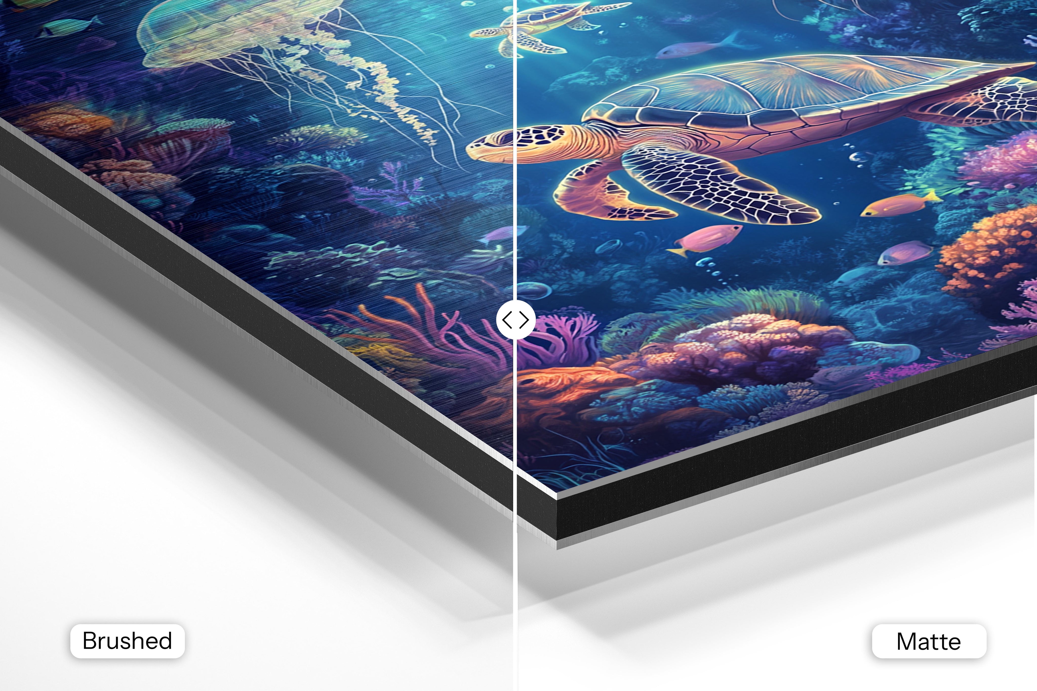 - Brushed Aluminum, on the other hand, features a raw metallic texture with visible brush strokes. Whites and highlights in your image let the silver surface show through, adding a dramatic, shimmering effect. Ideal for black-and-white images, minimalist designs, or abstract art, it creates a bold, industrial vibe with a modern edge.