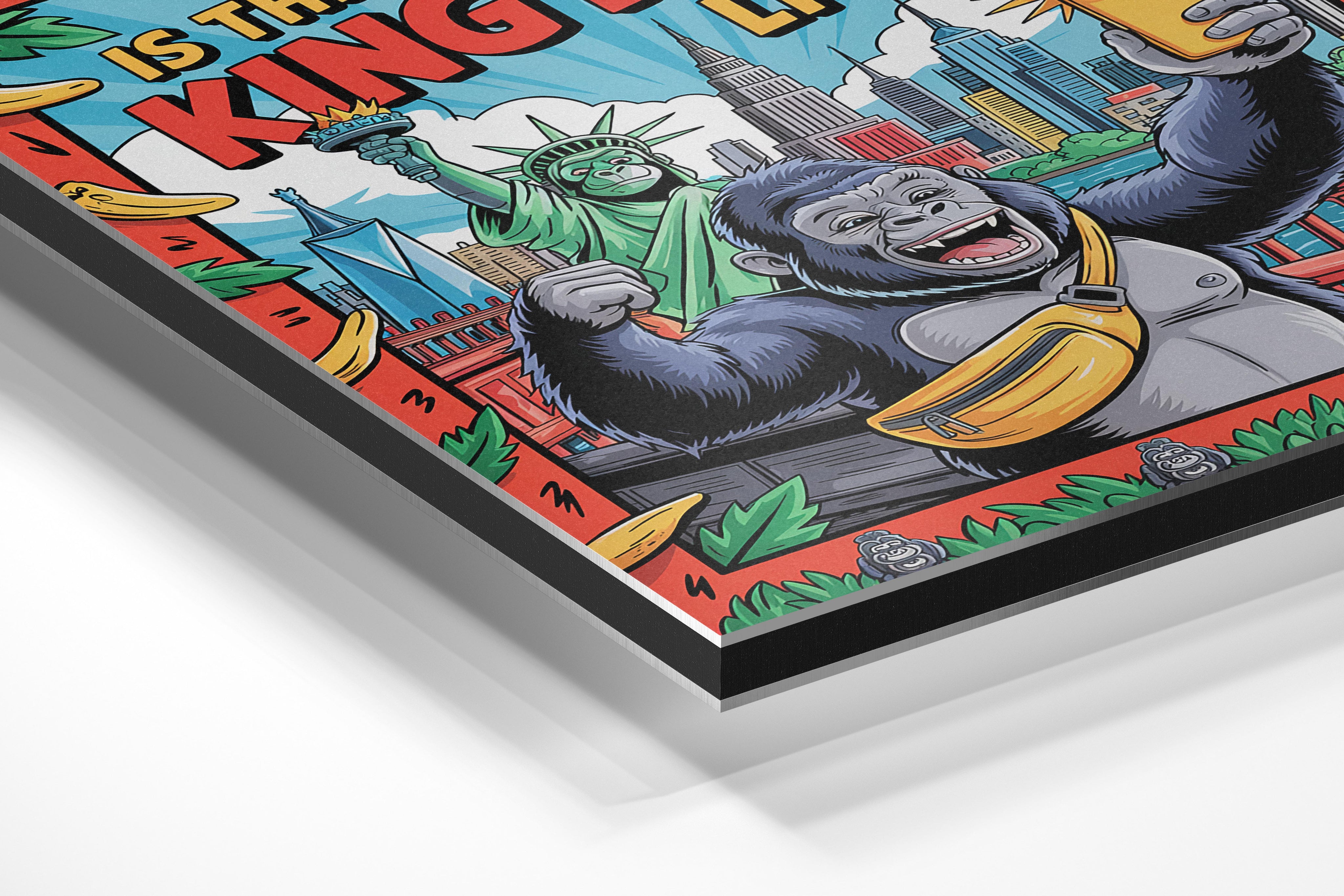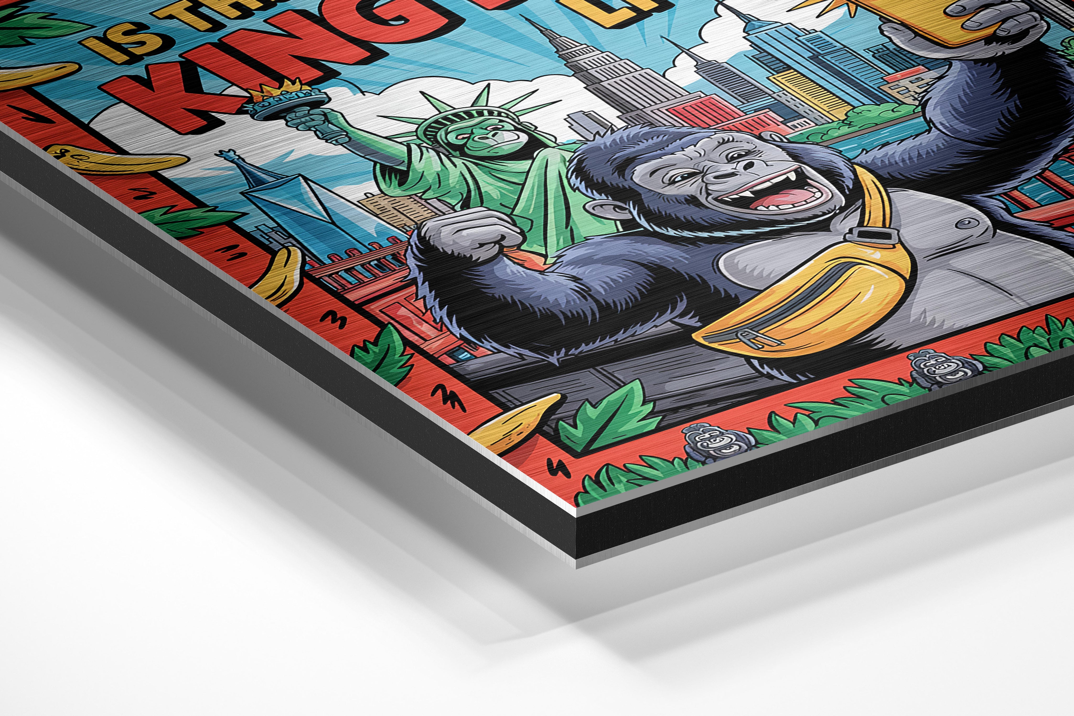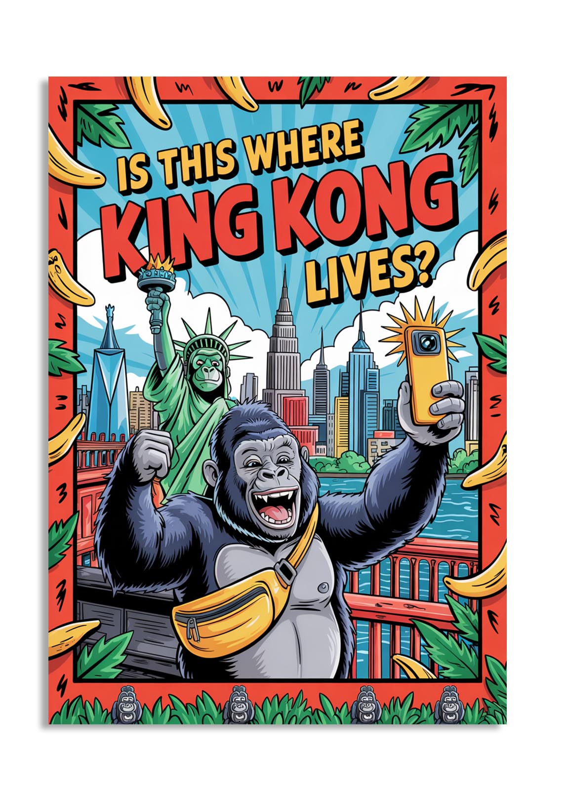 This comic-style piece features a joyful gorilla dressed like a tourist, complete with a yellow fanny pack, taking a selfie in front of New York landmarks like the Statue of Liberty and Empire State Building. The caption reads “Is this where King Kong lives?” set against a border of bananas and tropical leaves. It playfully nods to the iconic film while reimagining the mighty ape as a wide-eyed tourist. With its humorous spin and vibrant palette, this artwork is ideal for playful interiors, travel-themed spaces, or pop art collections that blend humor, culture, and nostalgia.