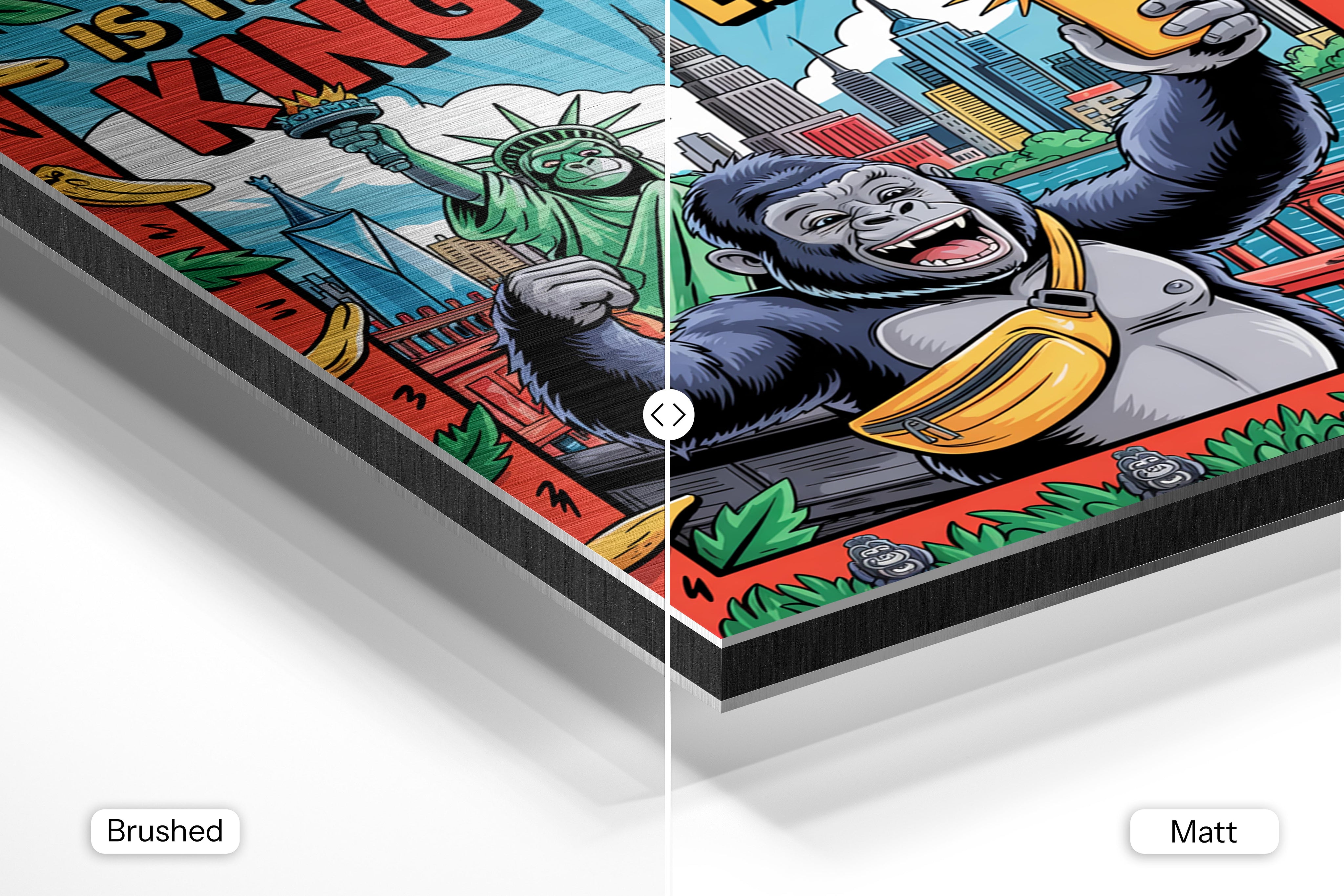 - Matte Aluminum offers a smooth, bright white surface that delivers crisp details and vibrant, true-to-life colors. With its non-reflective finish and subtle silky sheen, it’s perfect for photography, portraits, and colorful artwork—bringing a clean, polished look to any interior.