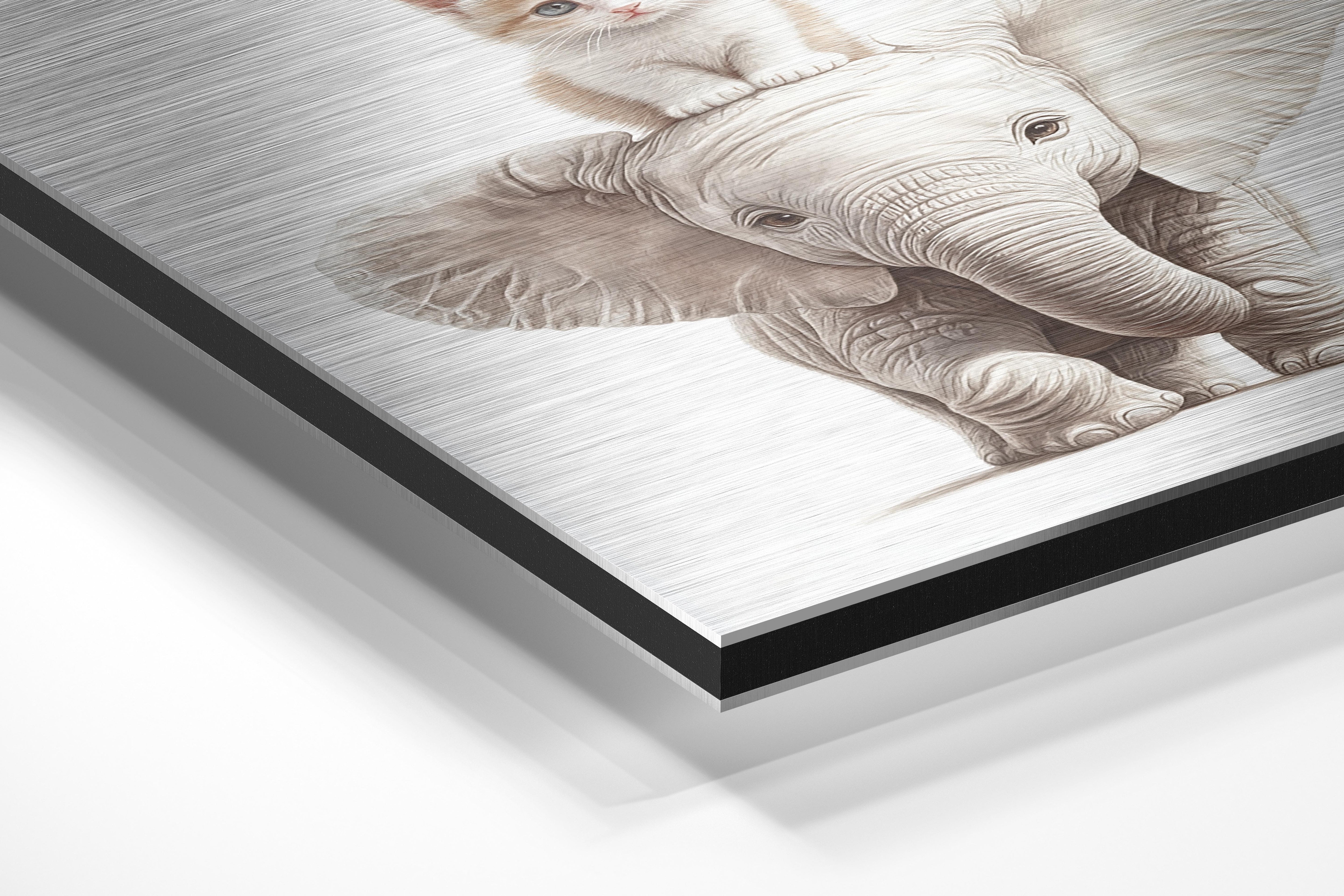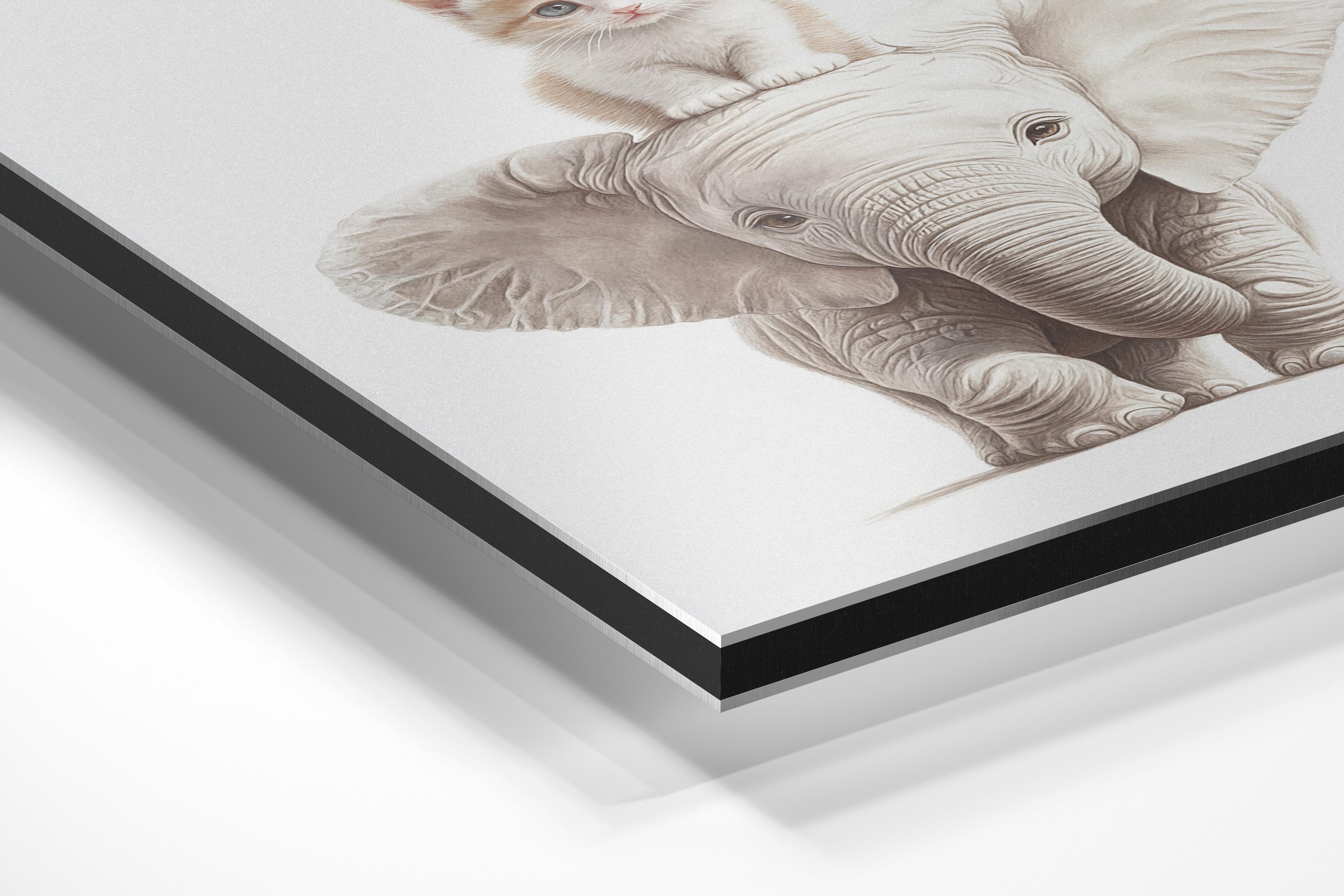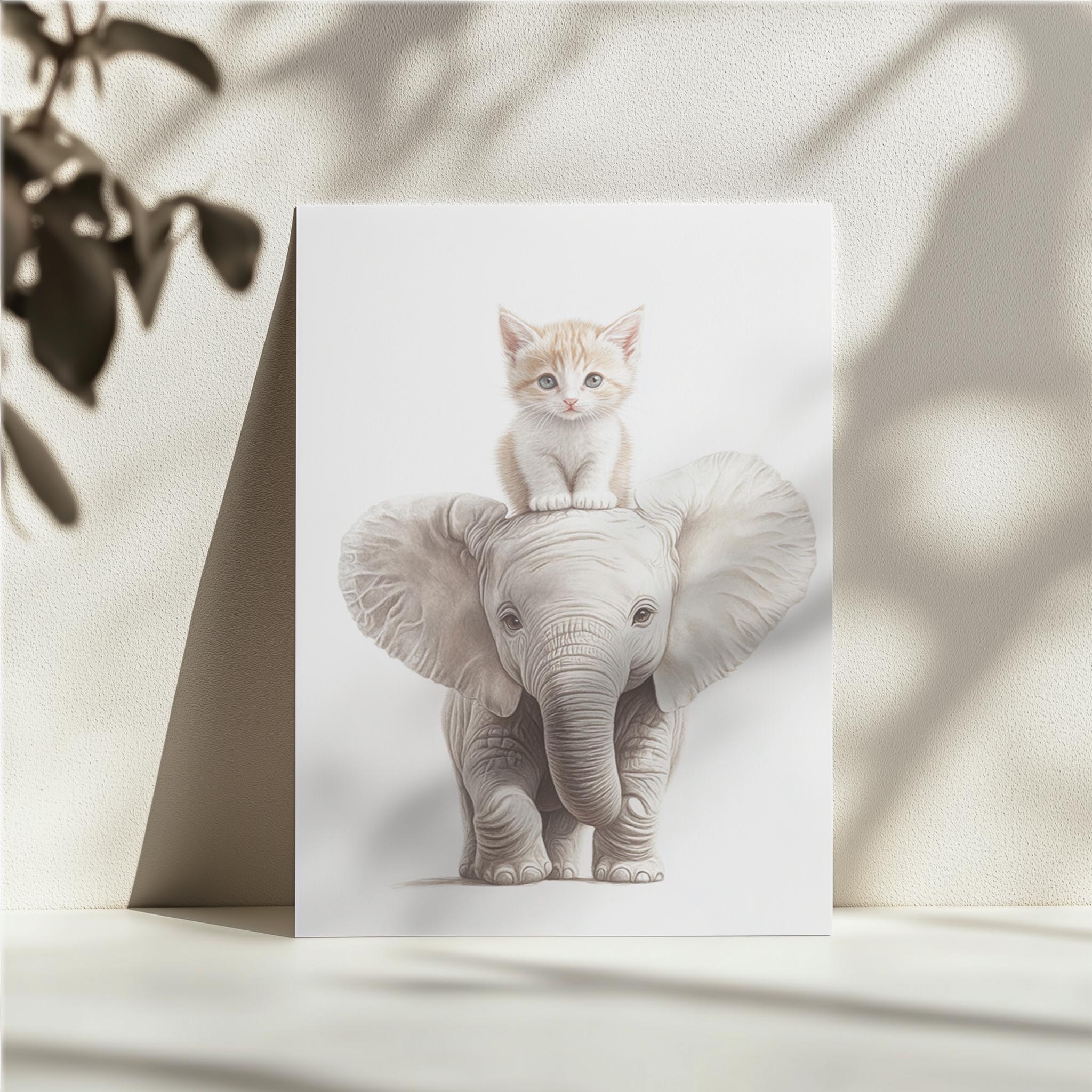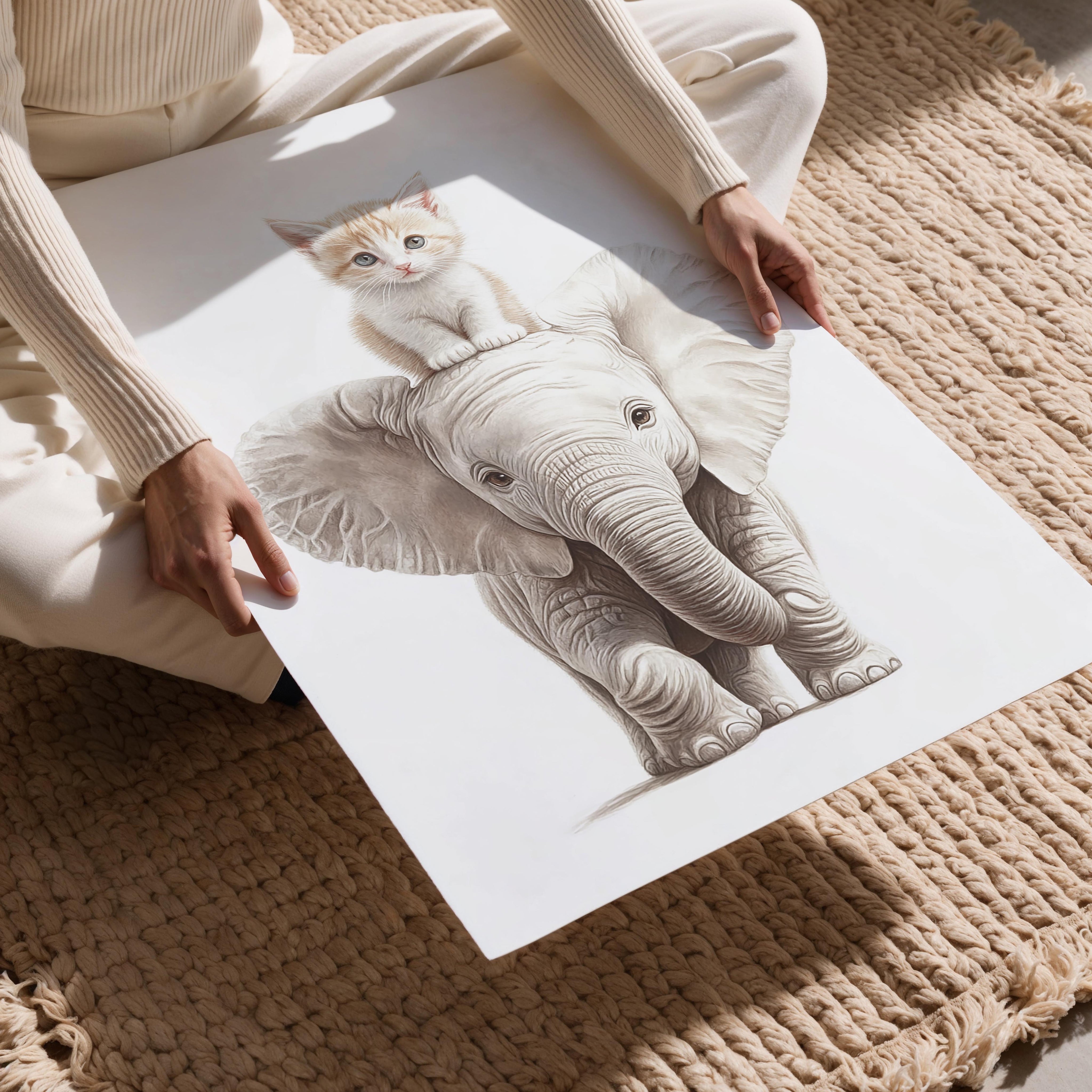 This heartwarming illustration features a small kitten sitting atop a baby elephant’s head, creating a charming contrast between their sizes. The soft pastel tones and detailed textures of the animals add warmth and innocence to the artwork. This piece embodies themes of friendship, trust, and unexpected bonds, making it perfect for a nursery, children’s room, or a cozy living space. The gentle expressions on both animals' faces evoke a sense of companionship and joy, making this an uplifting artwork for any animal lover.