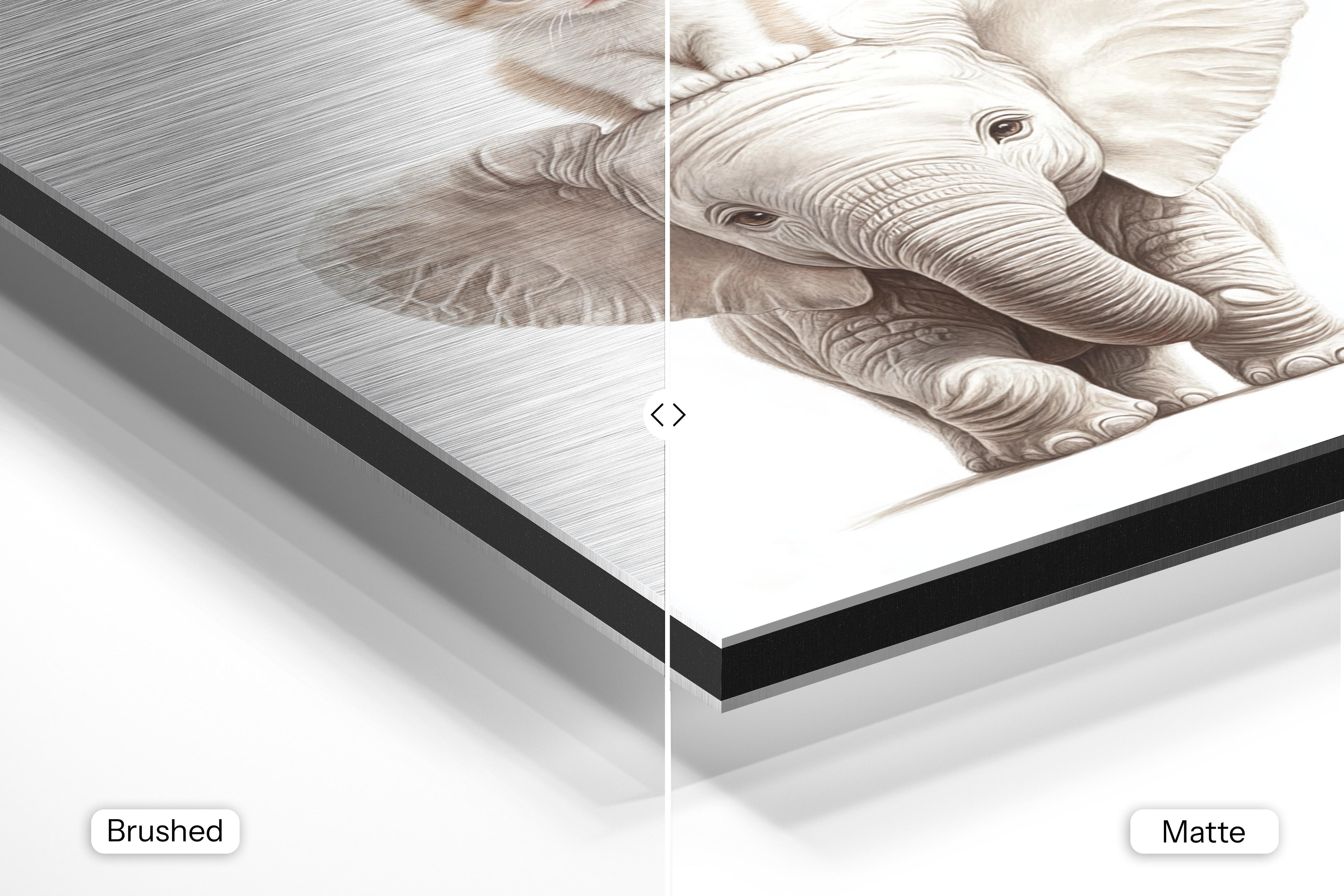 - Brushed Aluminum, on the other hand, features a raw metallic texture with visible brush strokes. Whites and highlights in your image let the silver surface show through, adding a dramatic, shimmering effect. Ideal for black-and-white images, minimalist designs, or abstract art, it creates a bold, industrial vibe with a modern edge.