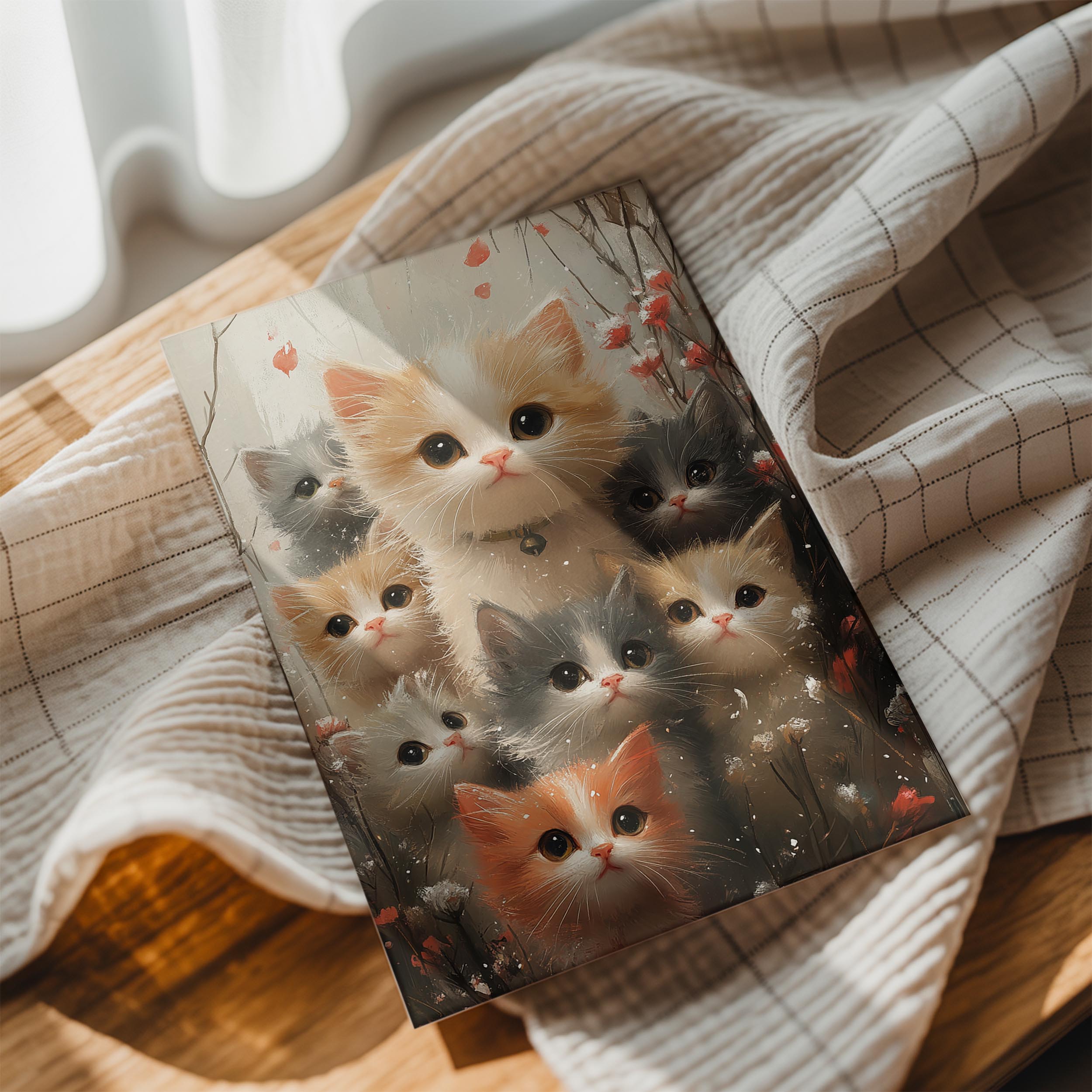 An adorable composition featuring a family of fluffy kittens with big, sparkling eyes, gathered closely together. The soft lighting and natural elements surrounding them create a heartwarming and inviting scene. This artwork would be perfect for cat lovers, children's rooms, or any space needing a touch of warmth and playfulness. The soft hues and fine details of each kitten’s fur make this an irresistible piece.