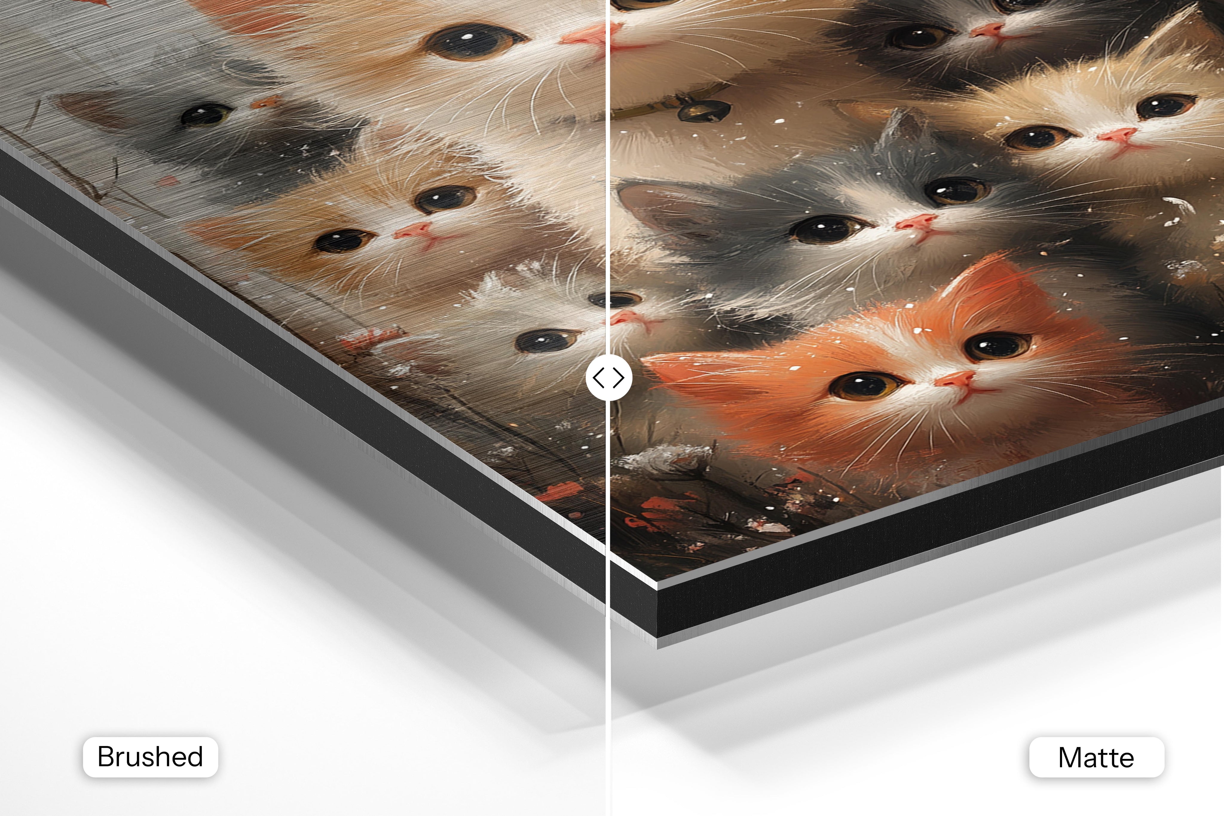 - Brushed Aluminum, on the other hand, features a raw metallic texture with visible brush strokes. Whites and highlights in your image let the silver surface show through, adding a dramatic, shimmering effect. Ideal for black-and-white images, minimalist designs, or abstract art, it creates a bold, industrial vibe with a modern edge.