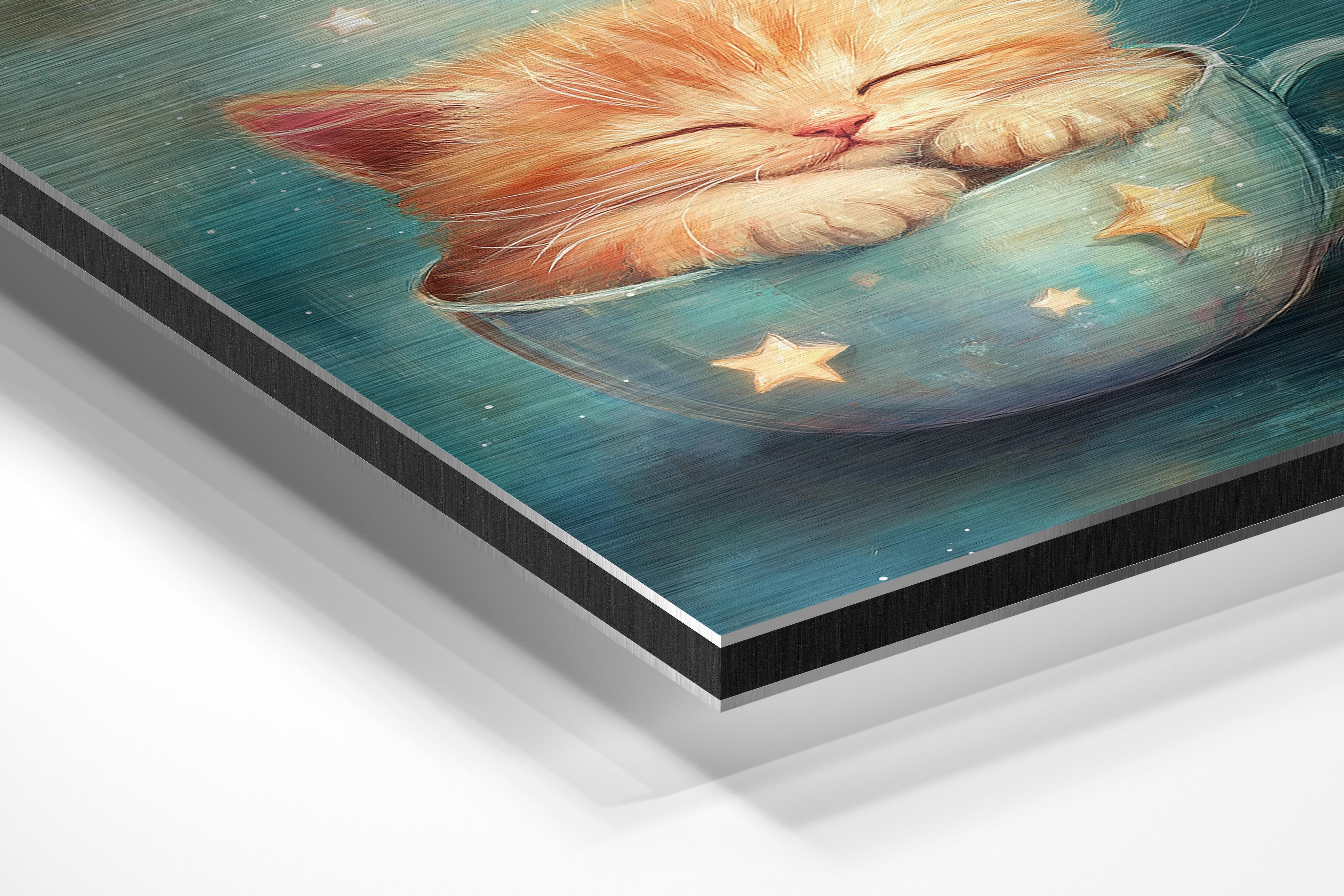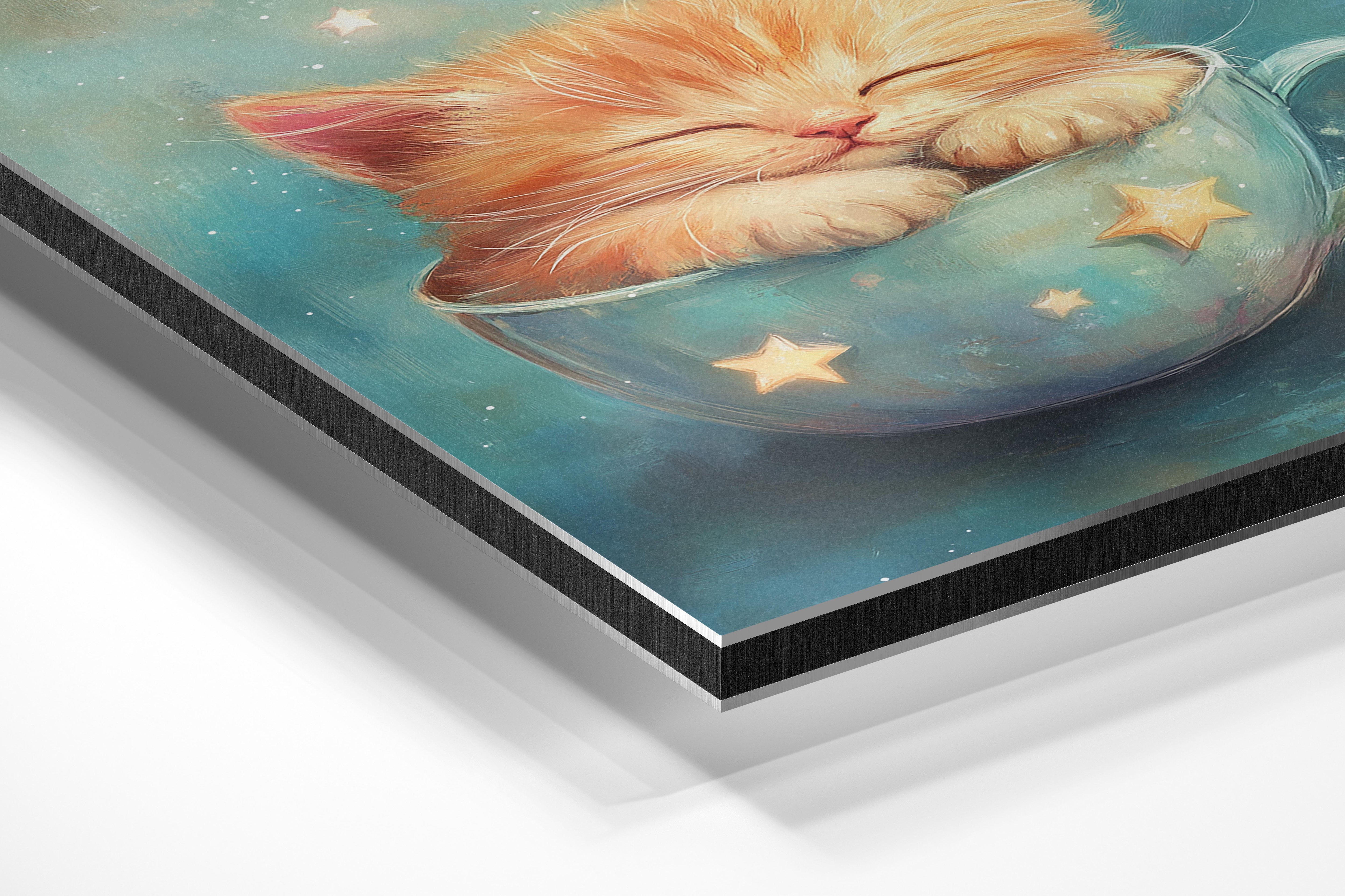 An adorable orange kitten peacefully snoozes in a star-decorated teacup, set against a soft blue background sprinkled with starry sparkles. This heartwarming image exudes comfort and charm, making it a delightful addition to any cozy nook or child’s bedroom. The light tones and whimsical theme make it universally appealing.