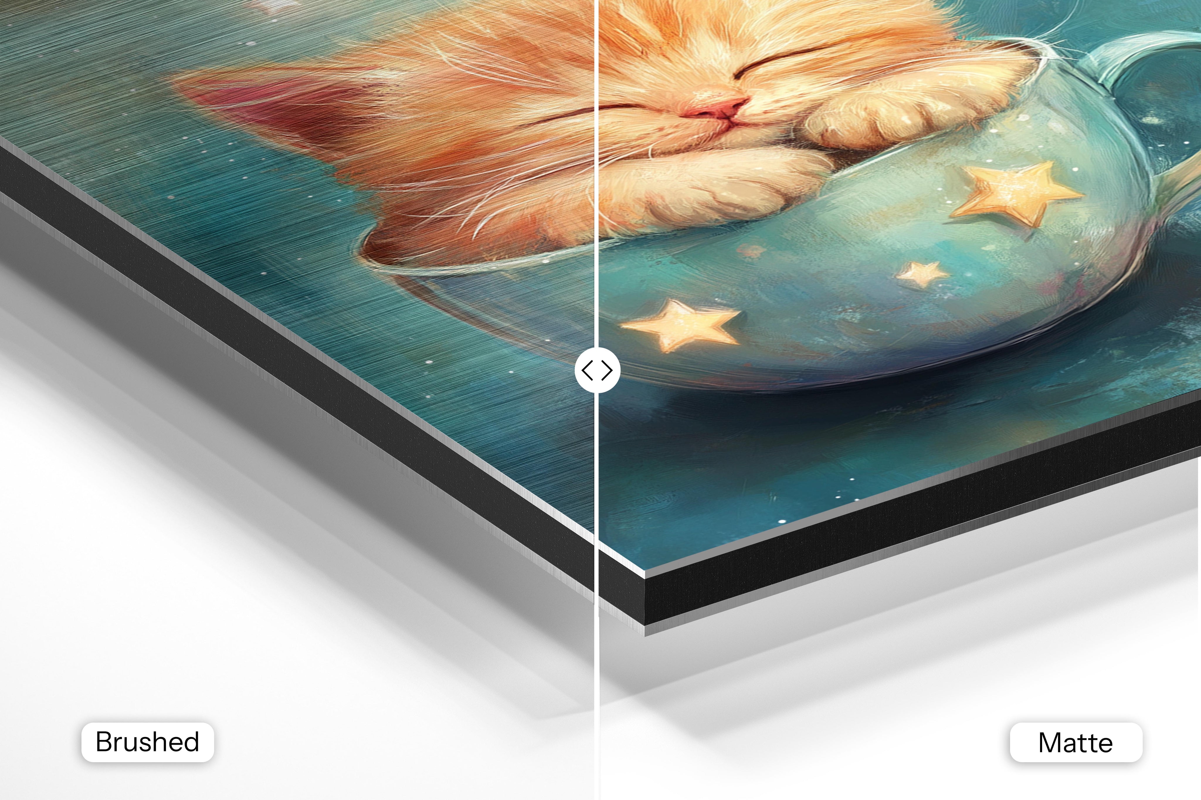 - Brushed Aluminum, on the other hand, features a raw metallic texture with visible brush strokes. Whites and highlights in your image let the silver surface show through, adding a dramatic, shimmering effect. Ideal for black-and-white images, minimalist designs, or abstract art, it creates a bold, industrial vibe with a modern edge.