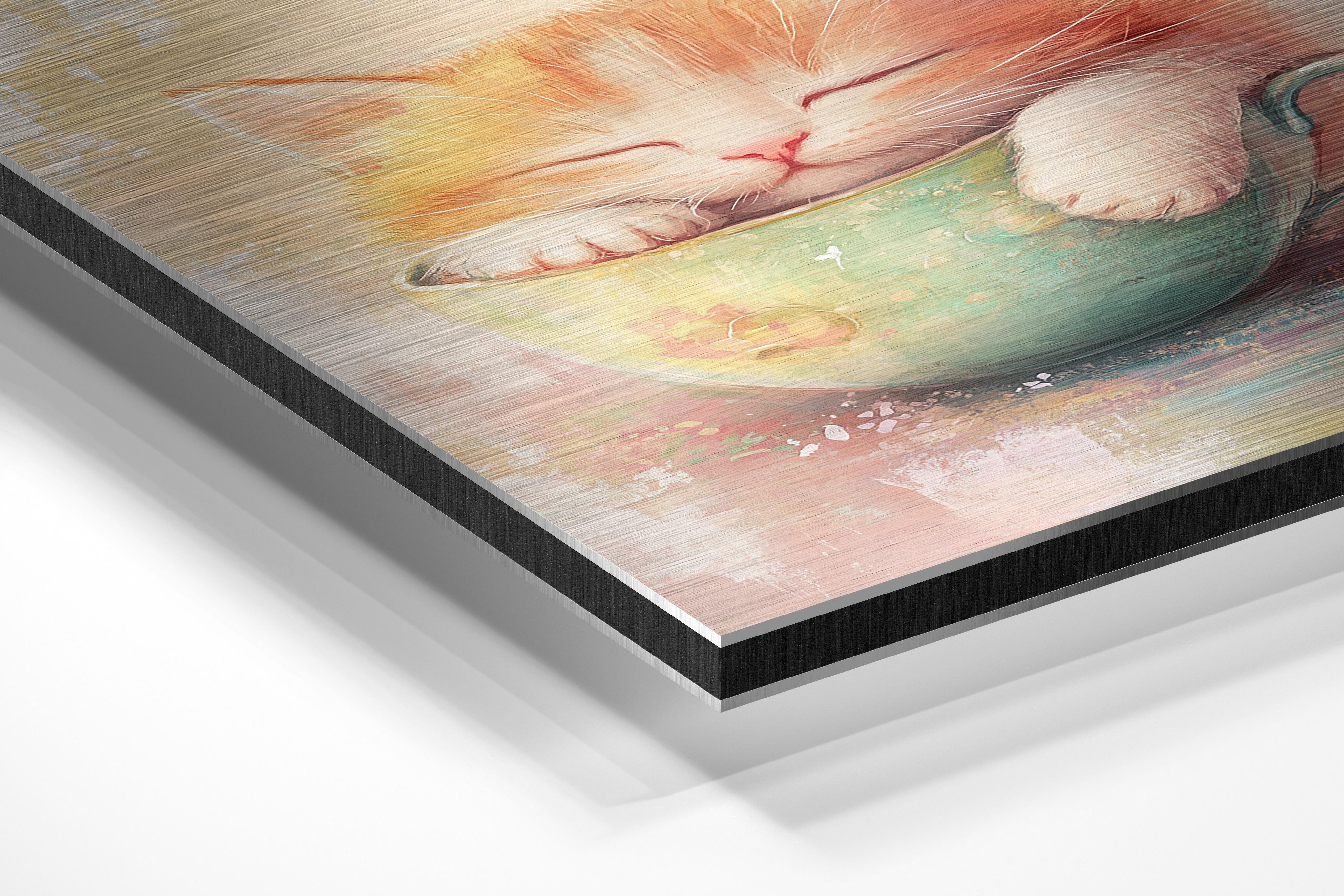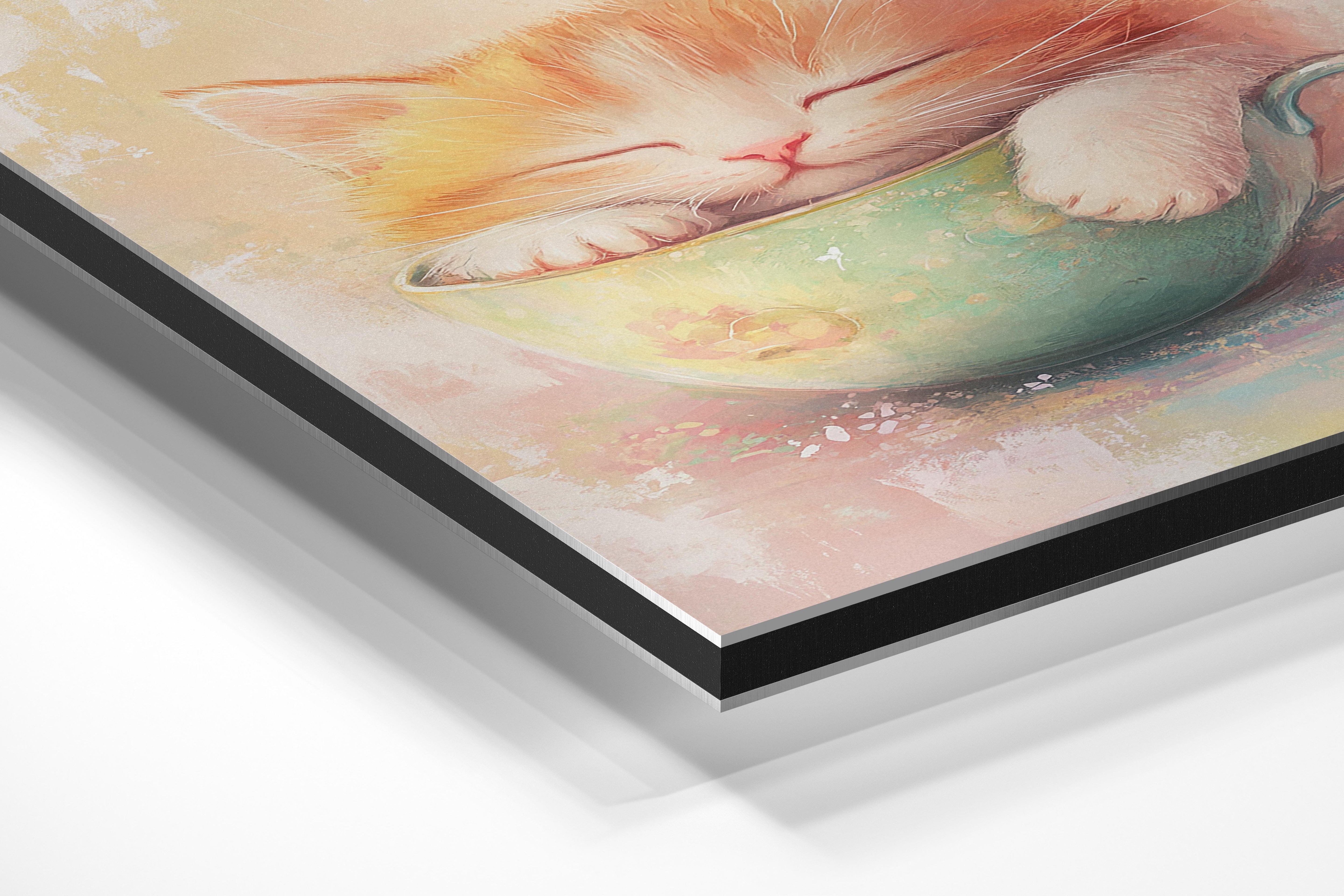 This adorable artwork features a tiny, fluffy kitten sleeping inside a floral teacup. The soft pastel colors and delicate brushstrokes create a dreamy, peaceful atmosphere, making it an ideal piece for cat lovers or those looking to add a touch of warmth to their space. The gentle blend of peach and cream hues adds to the overall coziness of the image. Perfect for a child’s room, a cozy reading nook, or even a café setting, this piece evokes feelings of comfort, tranquility, and love for small and tender moments in life.