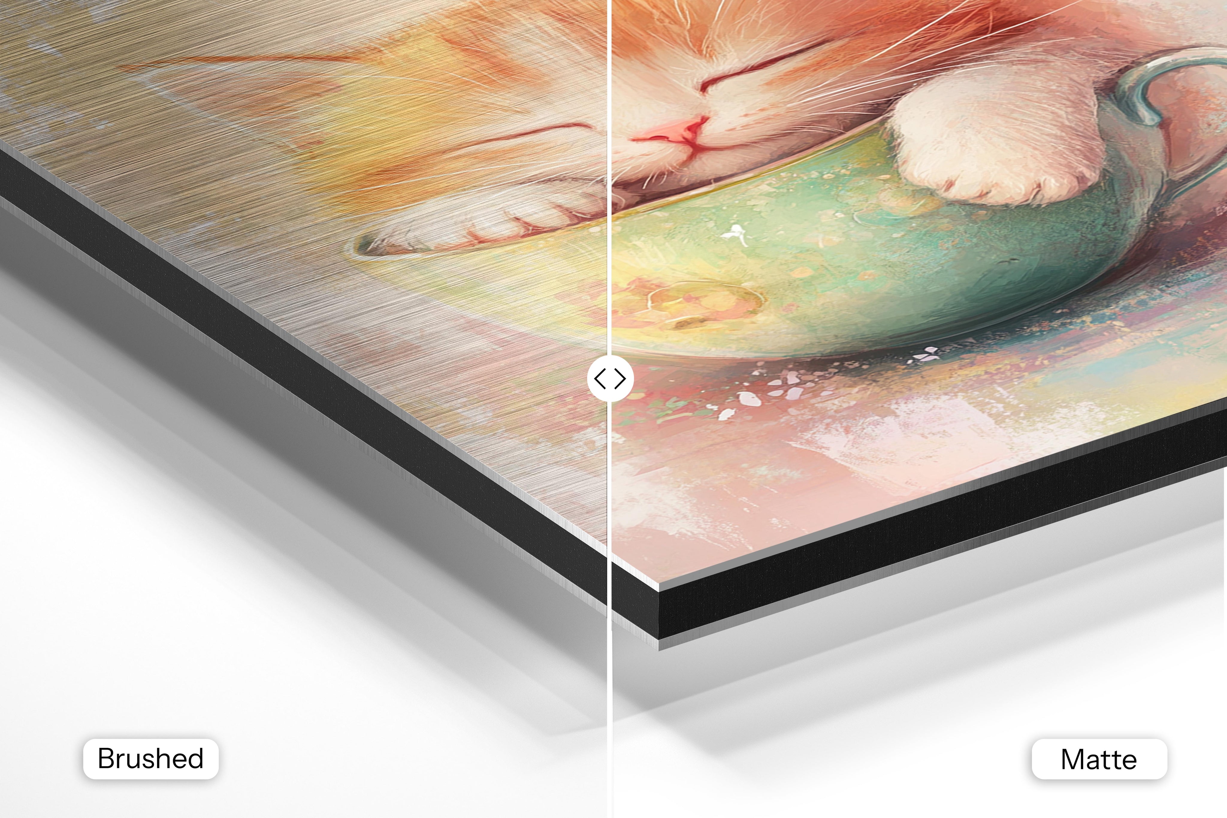 - Brushed Aluminum, on the other hand, features a raw metallic texture with visible brush strokes. Whites and highlights in your image let the silver surface show through, adding a dramatic, shimmering effect. Ideal for black-and-white images, minimalist designs, or abstract art, it creates a bold, industrial vibe with a modern edge.