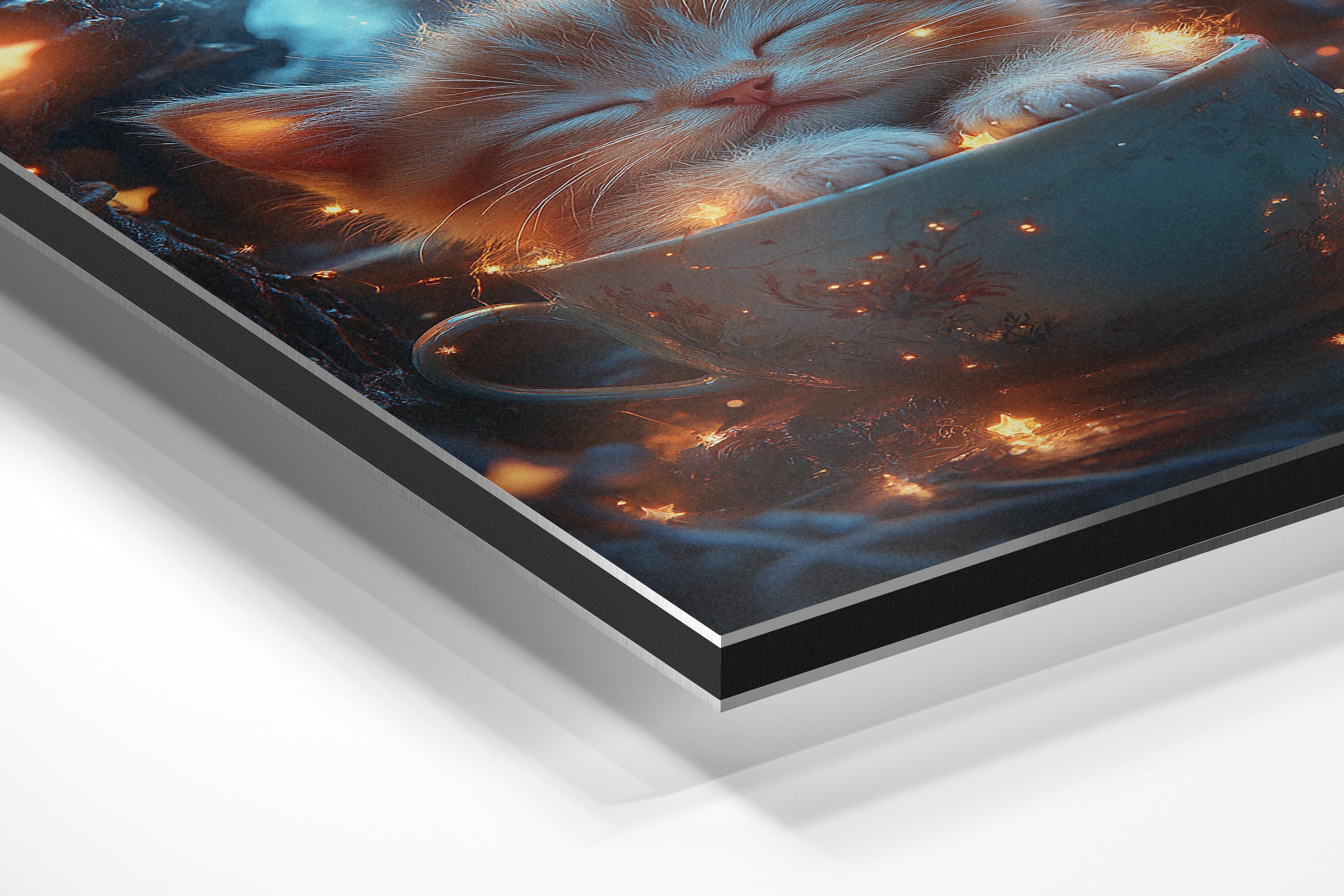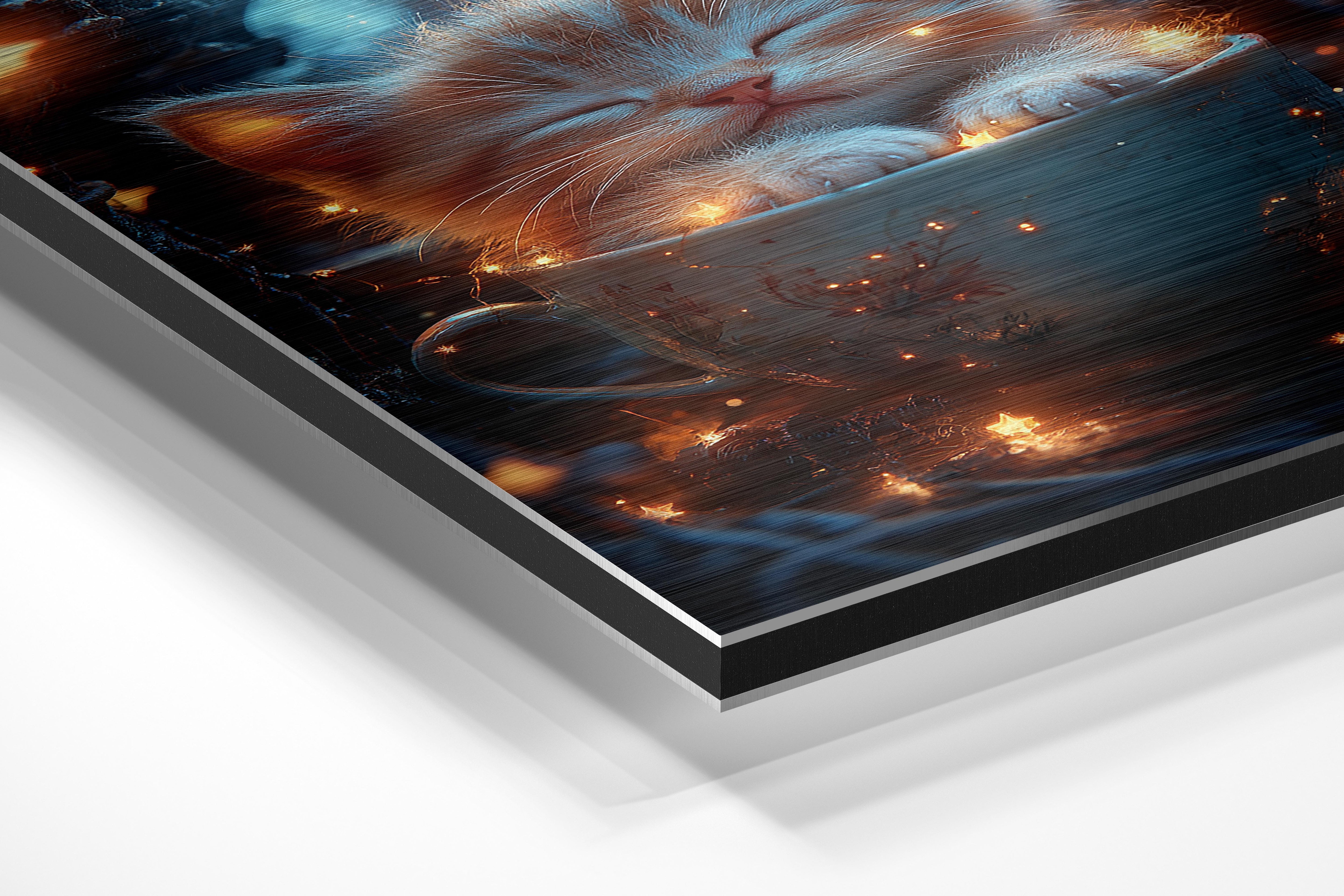 A tiny kitten peacefully sleeping in a decorative teacup, surrounded by glowing stars. The soft, warm lighting and delicate details create a cozy and magical atmosphere, making this artwork perfect for those who appreciate charming and whimsical designs. It’s ideal for nurseries, reading nooks, or spaces that seek to evoke a sense of calm and wonder.
