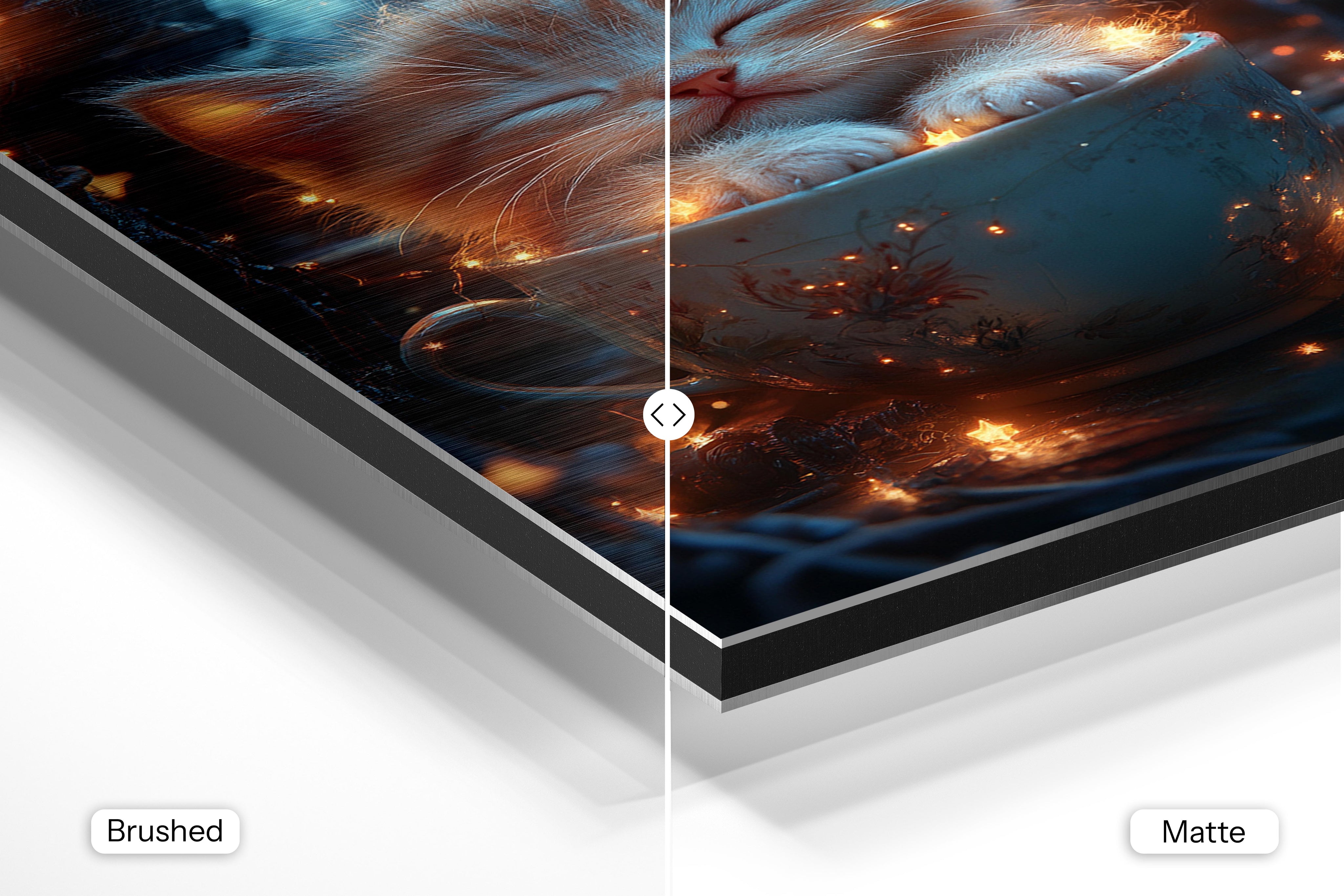 - Brushed Aluminum, on the other hand, features a raw metallic texture with visible brush strokes. Whites and highlights in your image let the silver surface show through, adding a dramatic, shimmering effect. Ideal for black-and-white images, minimalist designs, or abstract art, it creates a bold, industrial vibe with a modern edge.