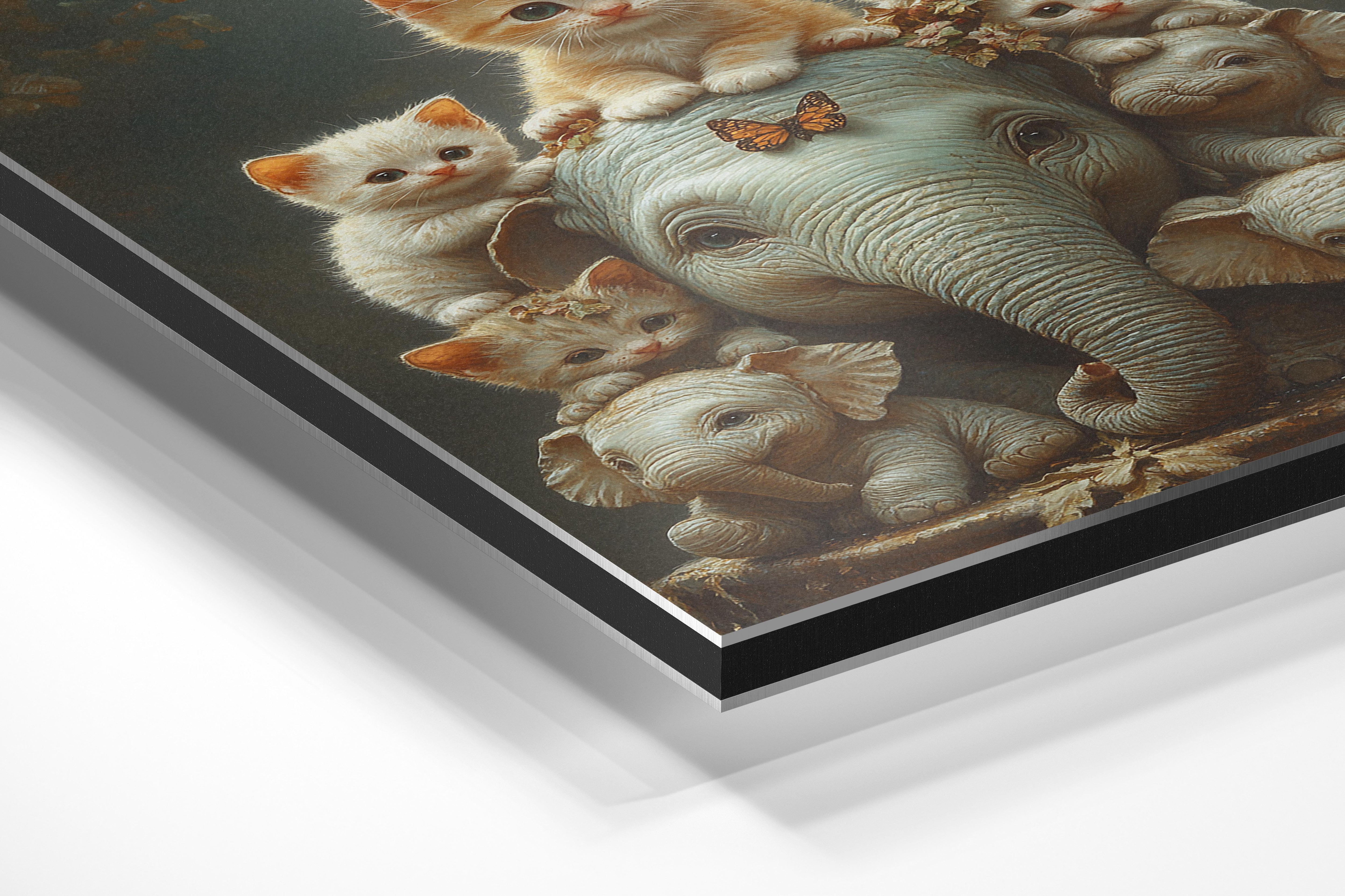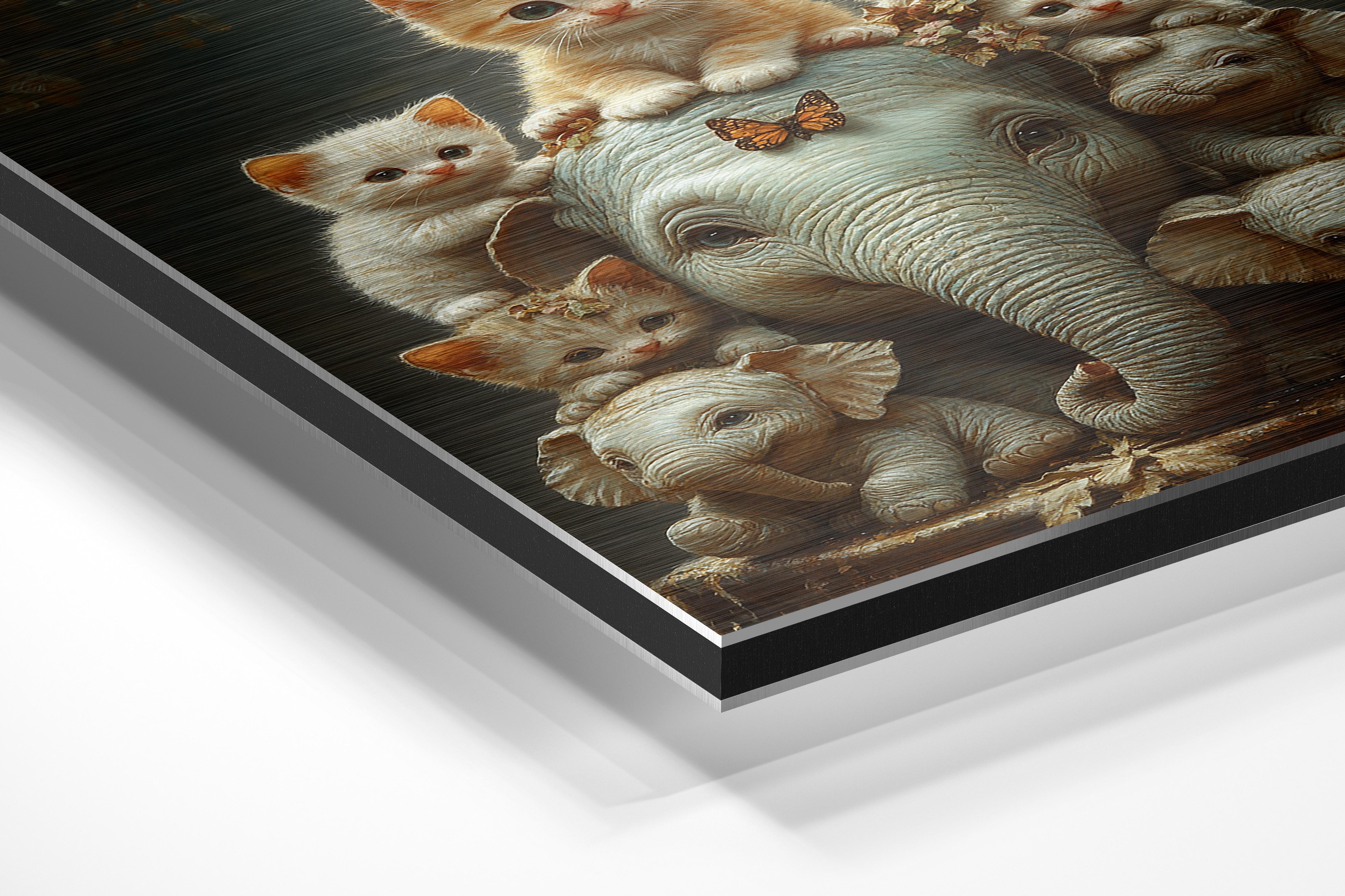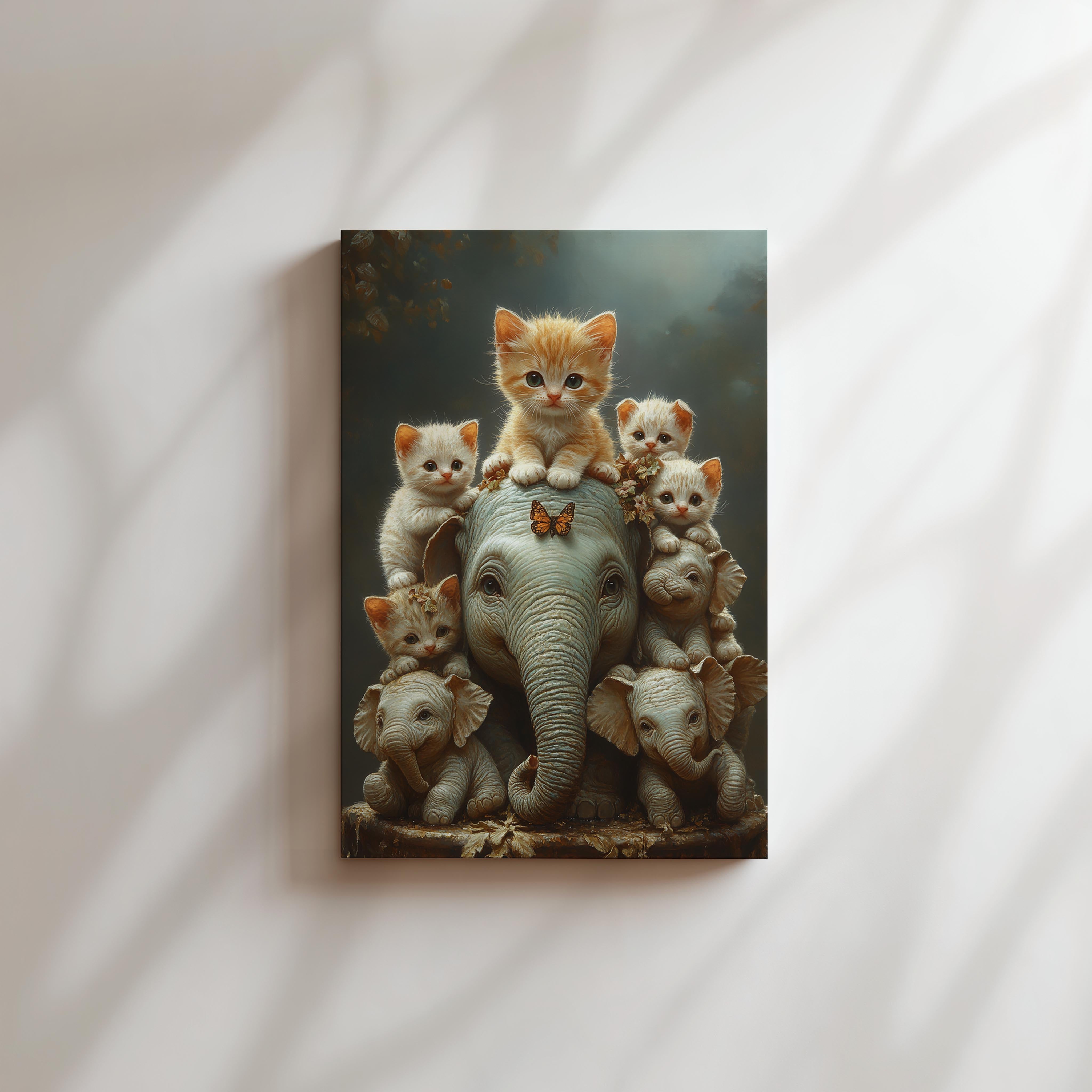 A whimsical and heartwarming digital artwork featuring a group of tiny kittens playfully perched on baby elephants. The dreamy lighting and gentle details create an enchanting fairytale-like atmosphere. This piece is perfect for children’s rooms, nurseries, or any space that benefits from playful, charming imagery. It brings together elements of innocence, adventure, and harmony in nature, making it a delightful conversation piece.