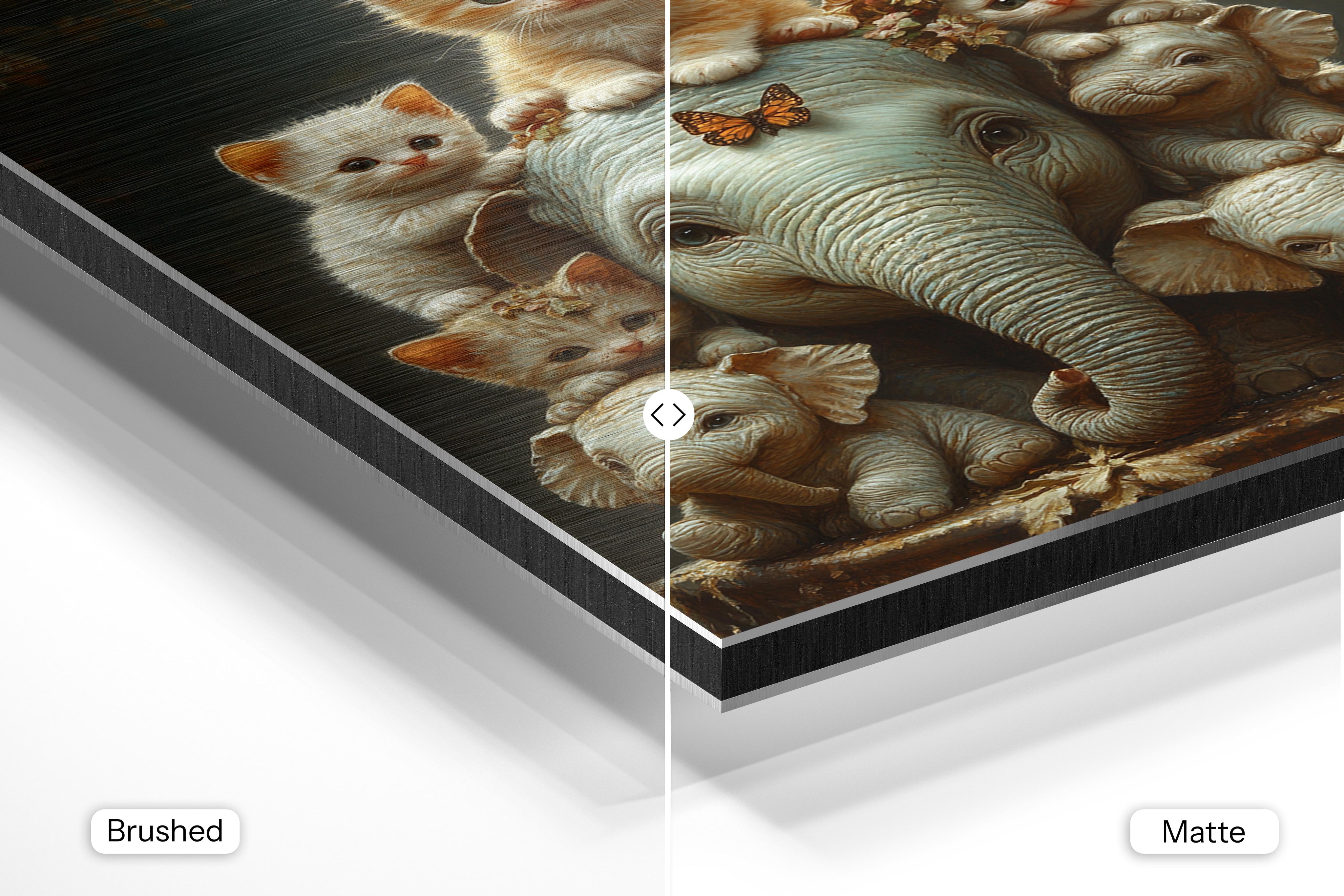 - Brushed Aluminum, on the other hand, features a raw metallic texture with visible brush strokes. Whites and highlights in your image let the silver surface show through, adding a dramatic, shimmering effect. Ideal for black-and-white images, minimalist designs, or abstract art, it creates a bold, industrial vibe with a modern edge.