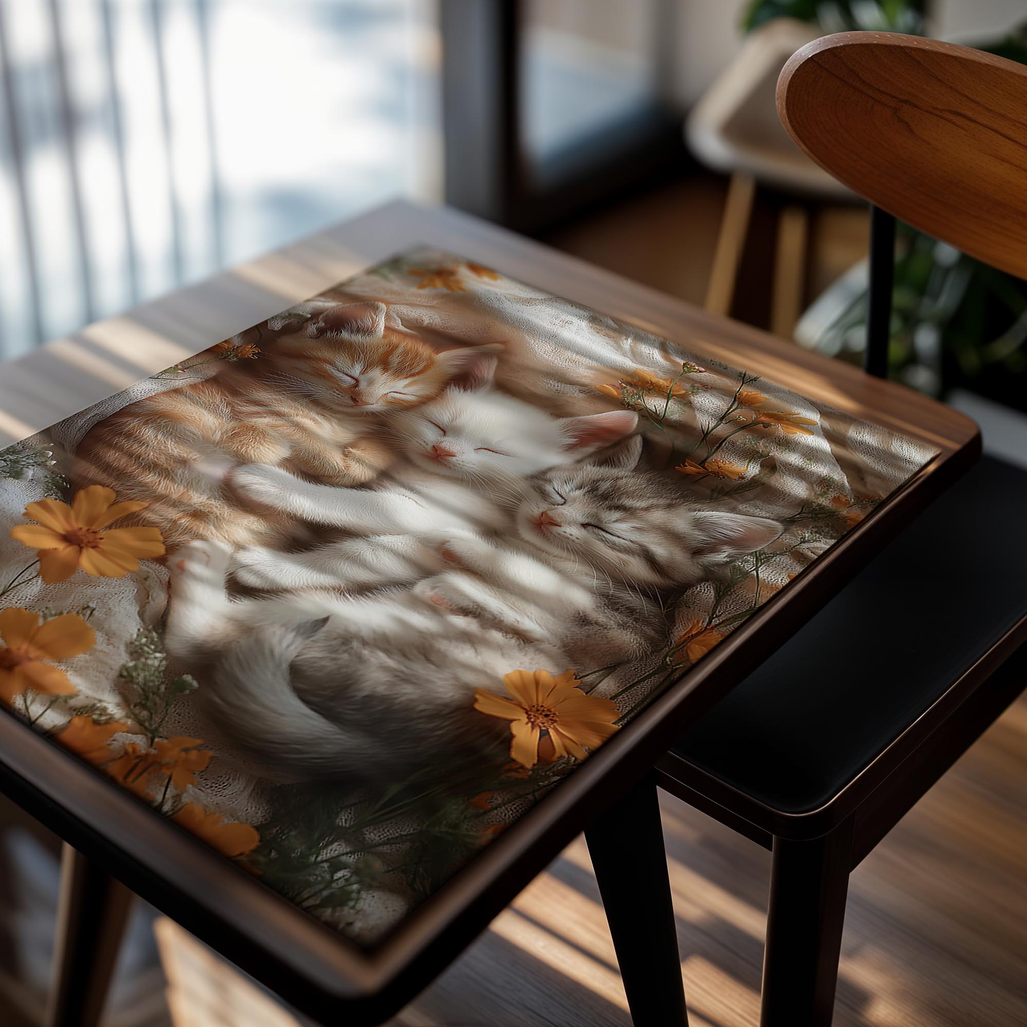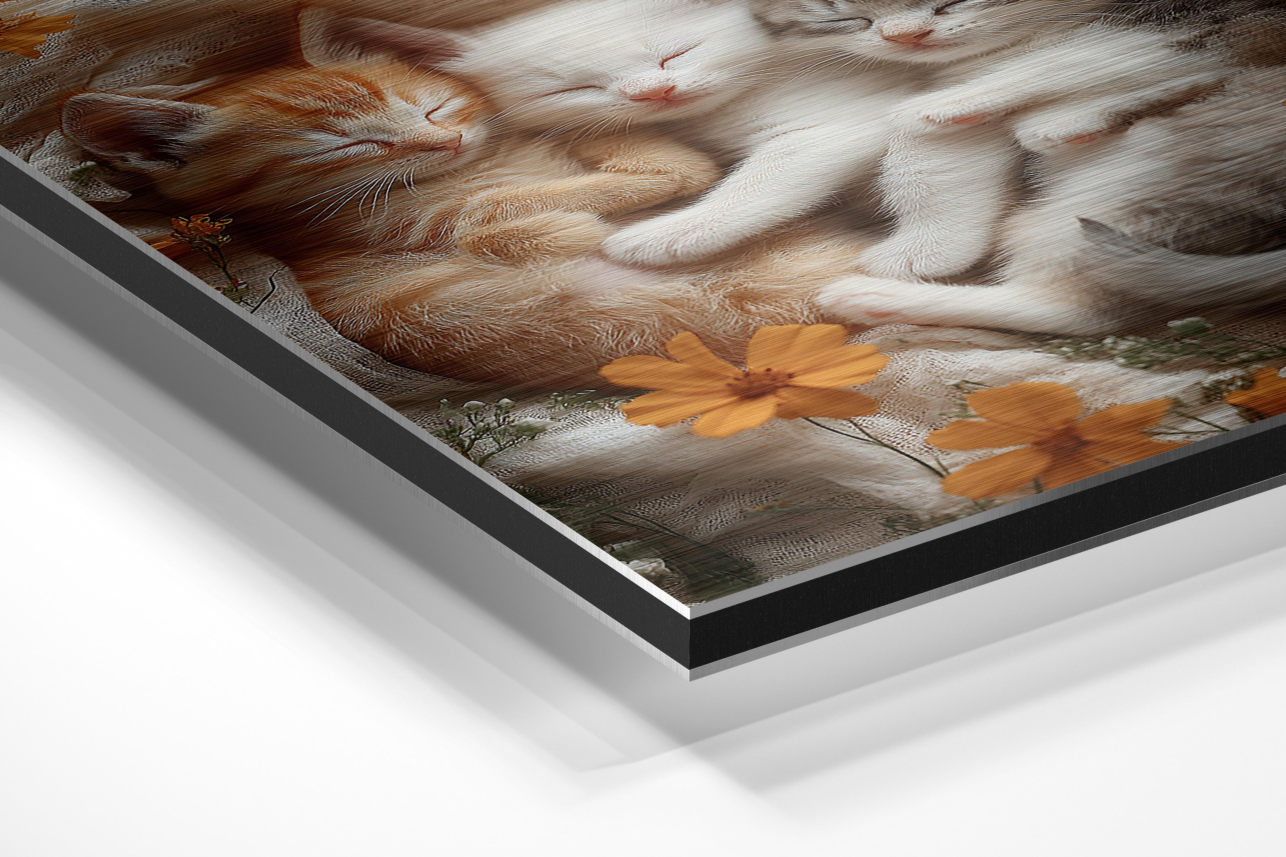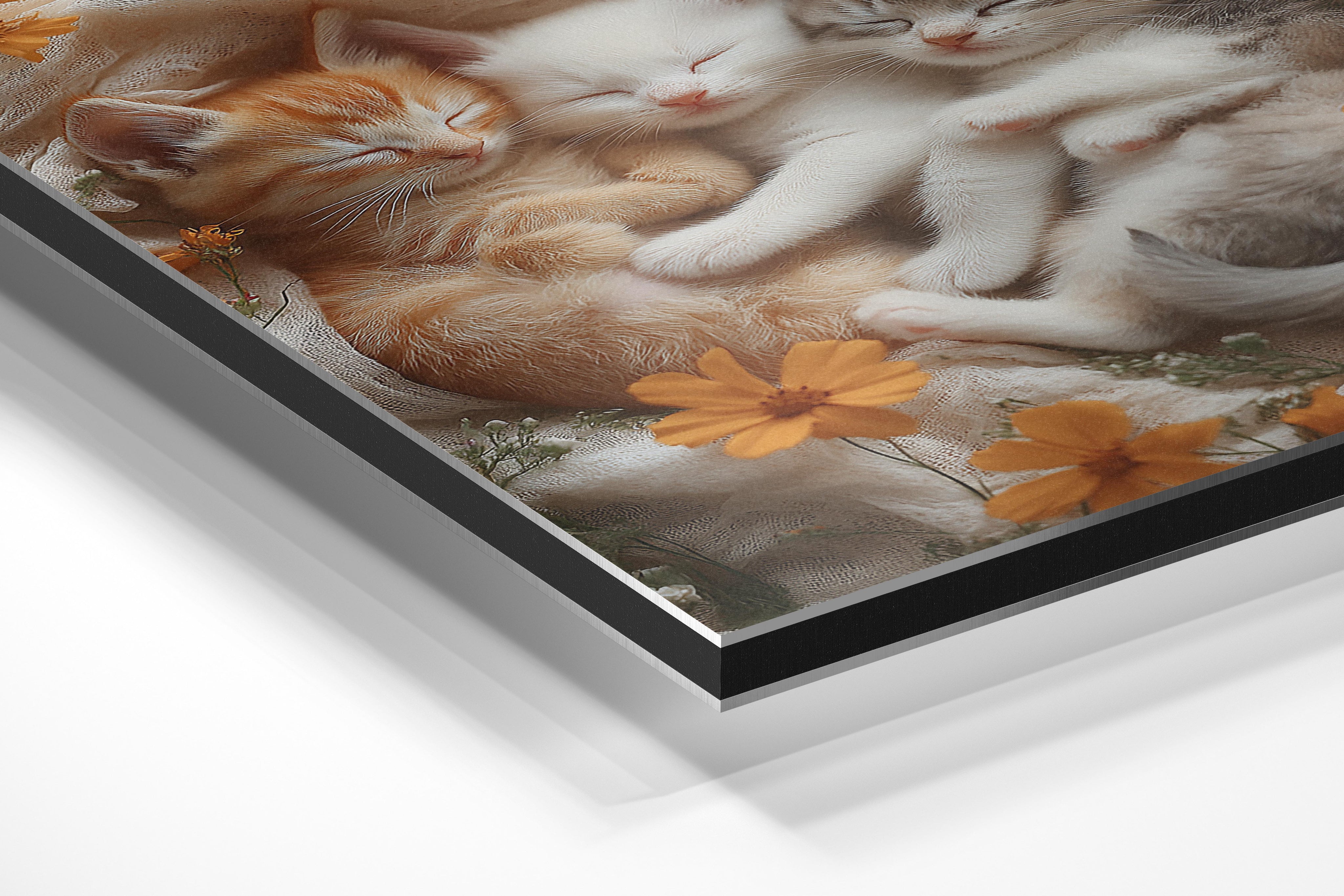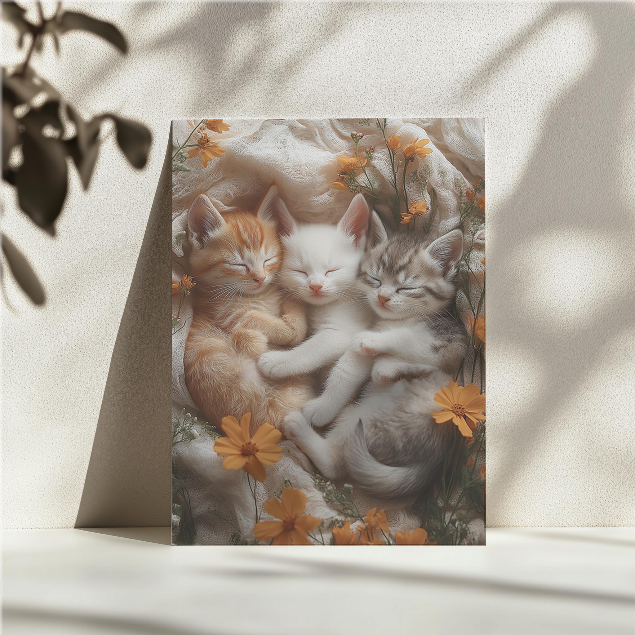 Three kittens peacefully asleep on a soft blanket adorned with wildflowers create a cozy and tender scene. This heartwarming image is ideal for a child’s bedroom, a pet-themed space, or as a comforting accent in a family living area. The soft tones and floral details add warmth and charm, creating an inviting atmosphere. The peaceful expressions of the kittens exude pure bliss, making this artwork a source of joy and relaxation. It’s a perfect addition for those who cherish moments of quiet contentment and for spaces designed to feel welcoming and serene. Its charm is truly irresistible.