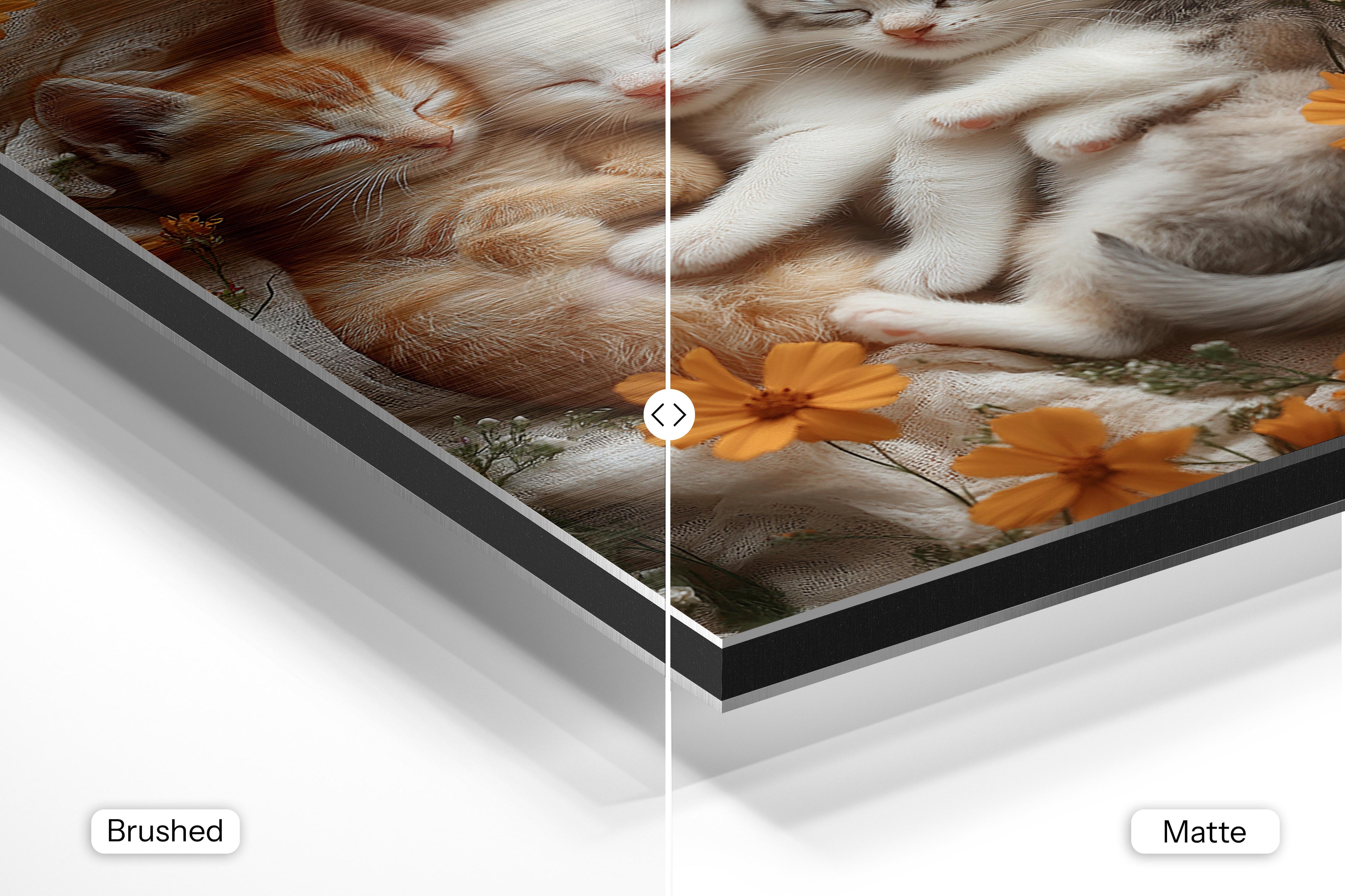 - Brushed Aluminum, on the other hand, features a raw metallic texture with visible brush strokes. Whites and highlights in your image let the silver surface show through, adding a dramatic, shimmering effect. Ideal for black-and-white images, minimalist designs, or abstract art, it creates a bold, industrial vibe with a modern edge.