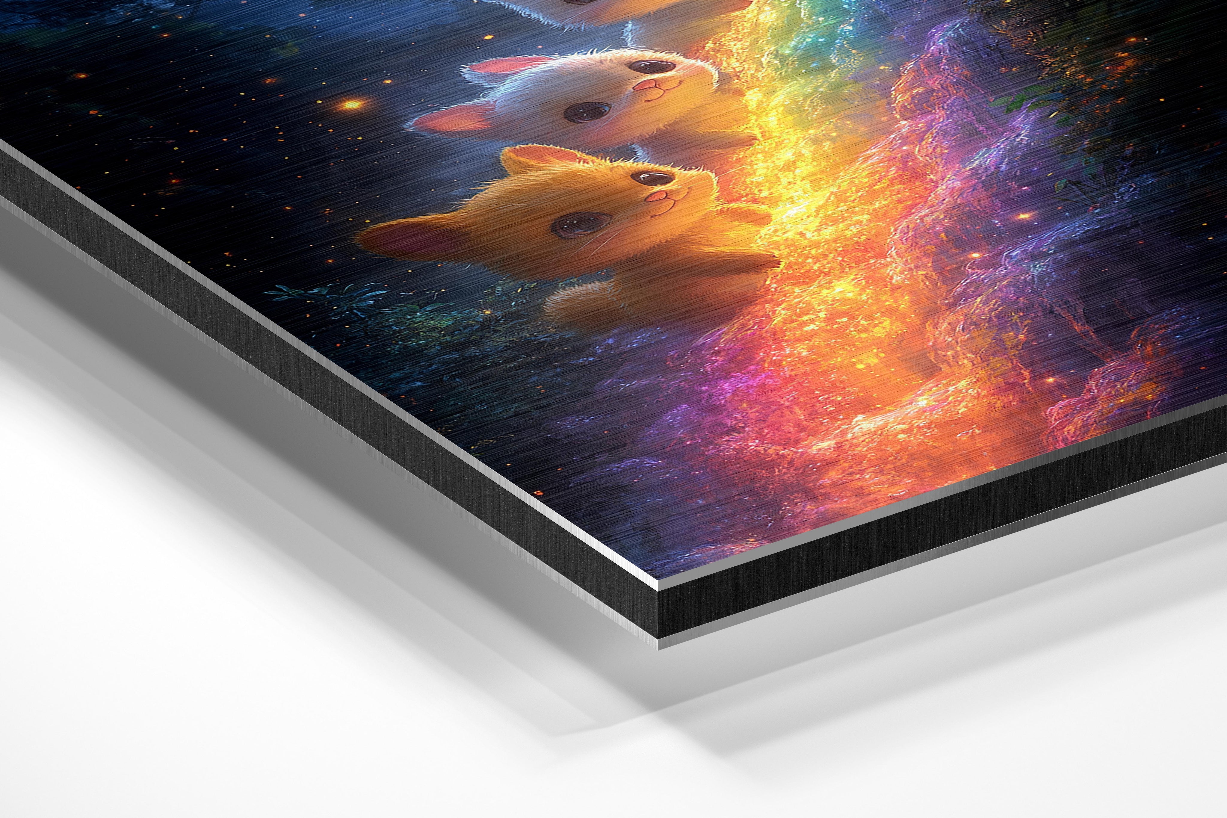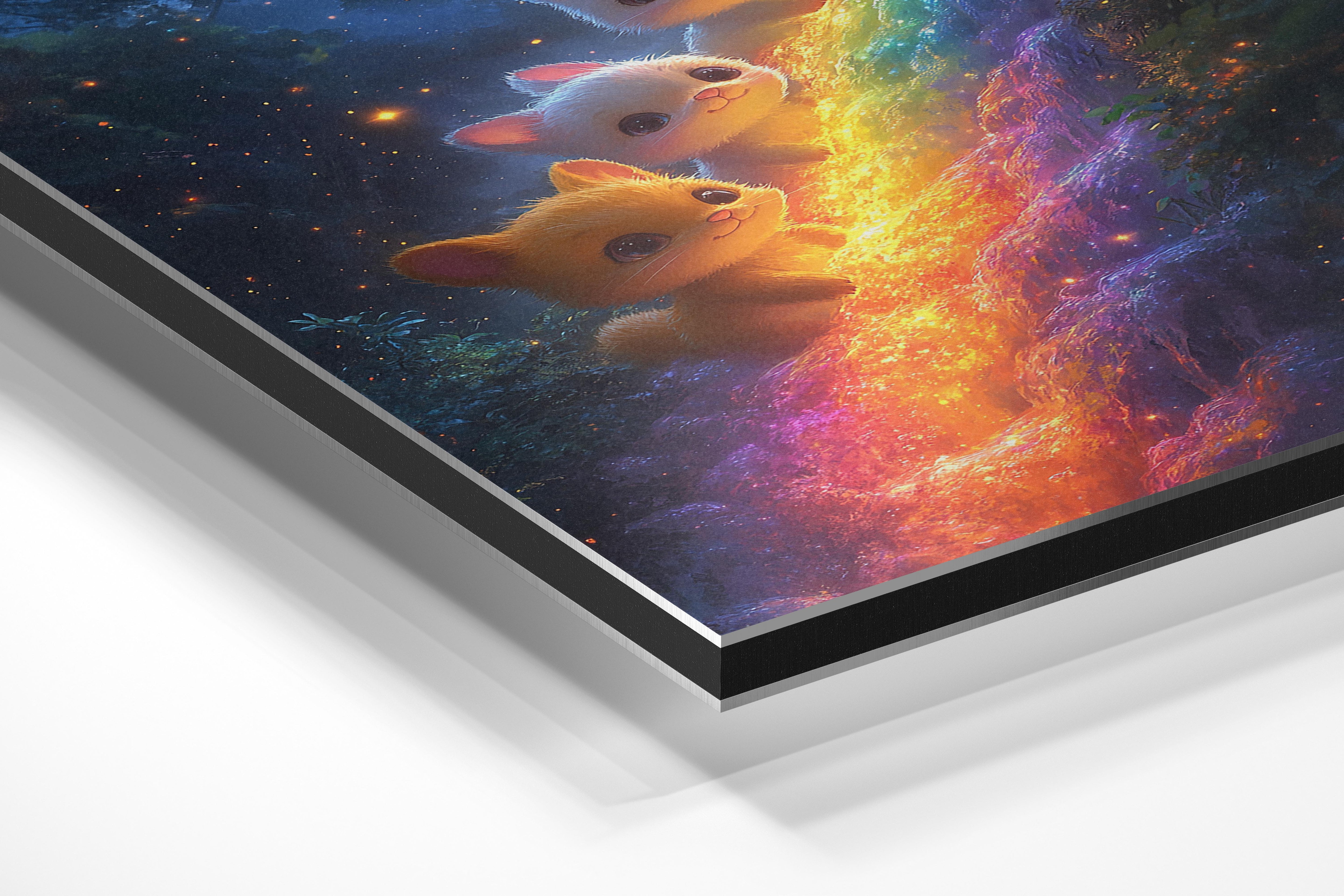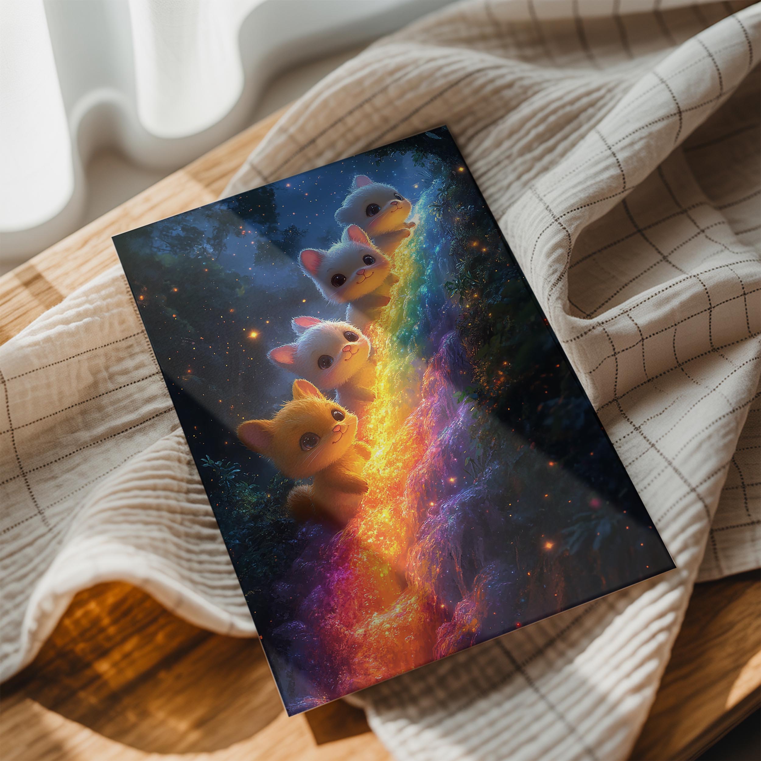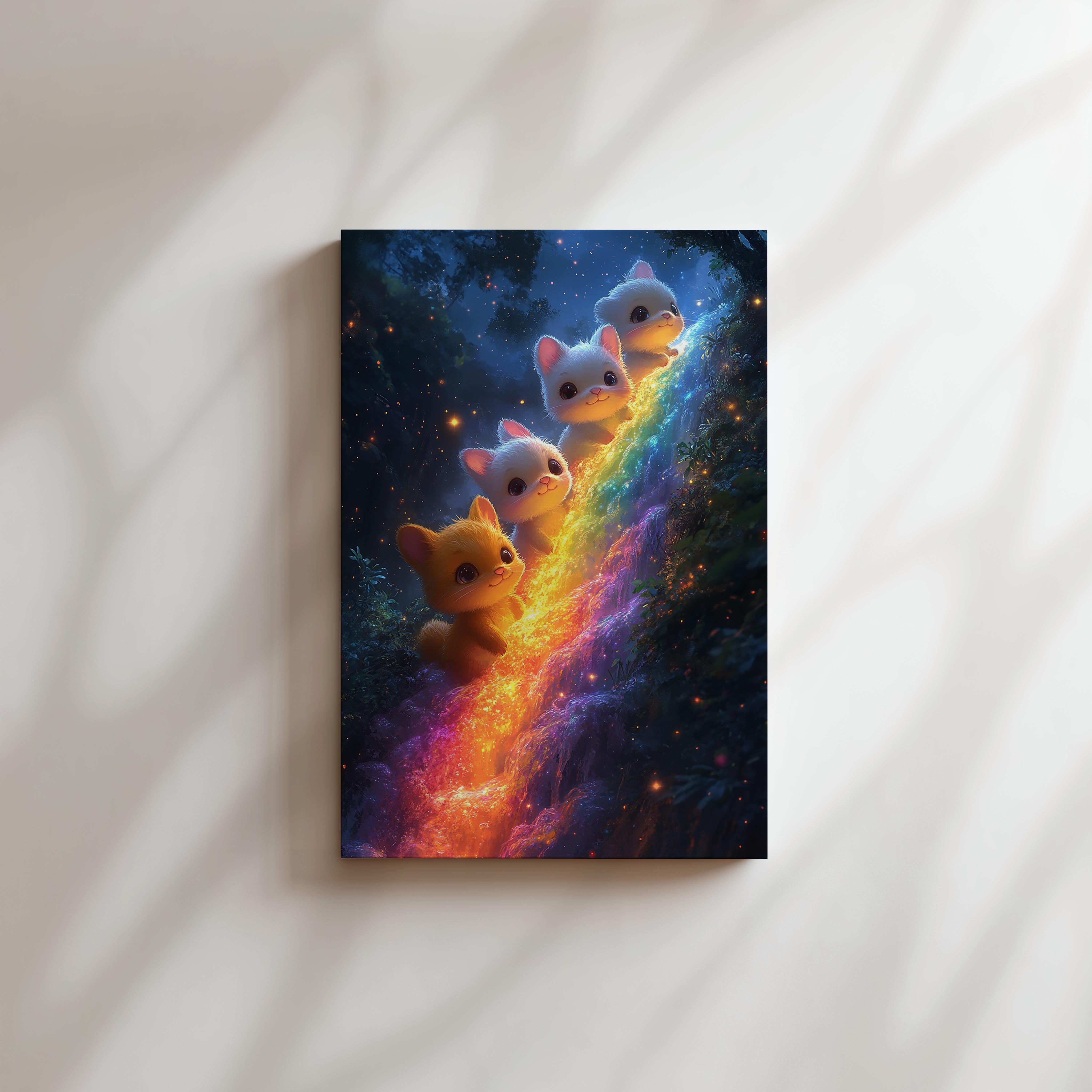This magical scene captures four adorable kittens playfully perched on a glowing rainbow-like stream cascading through a mystical forest. The kittens' curious expressions and soft fur are illuminated by the vibrant colors of the rainbow, creating a captivating composition. The contrast of the colorful stream against the dark, star-speckled forest background evokes a dreamlike atmosphere. This piece is perfect for creating a sense of wonder in children's rooms, inspiring imaginative stories and delighting animal lovers with its enchanting and playful charm.