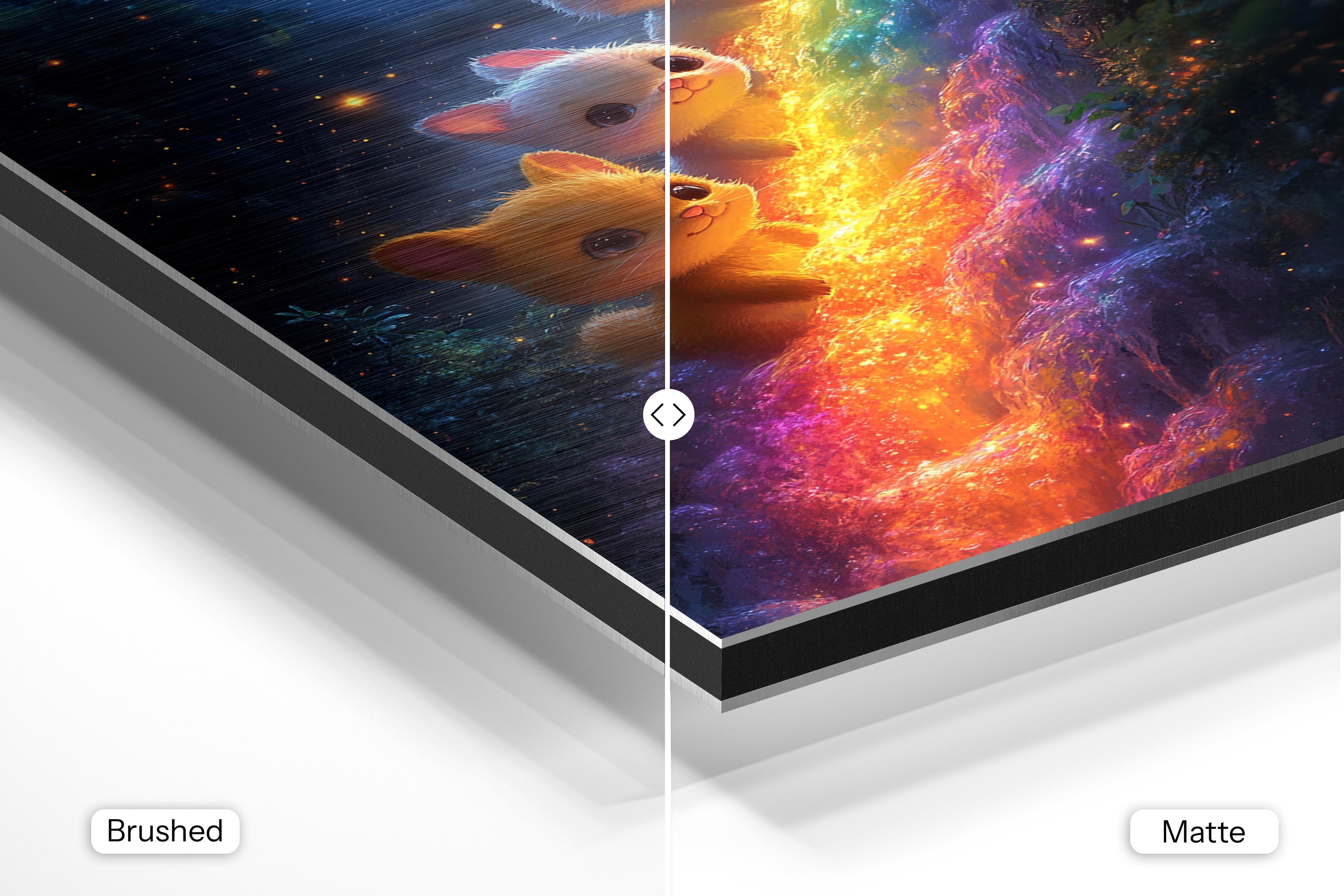 - Brushed Aluminum, on the other hand, features a raw metallic texture with visible brush strokes. Whites and highlights in your image let the silver surface show through, adding a dramatic, shimmering effect. Ideal for black-and-white images, minimalist designs, or abstract art, it creates a bold, industrial vibe with a modern edge.