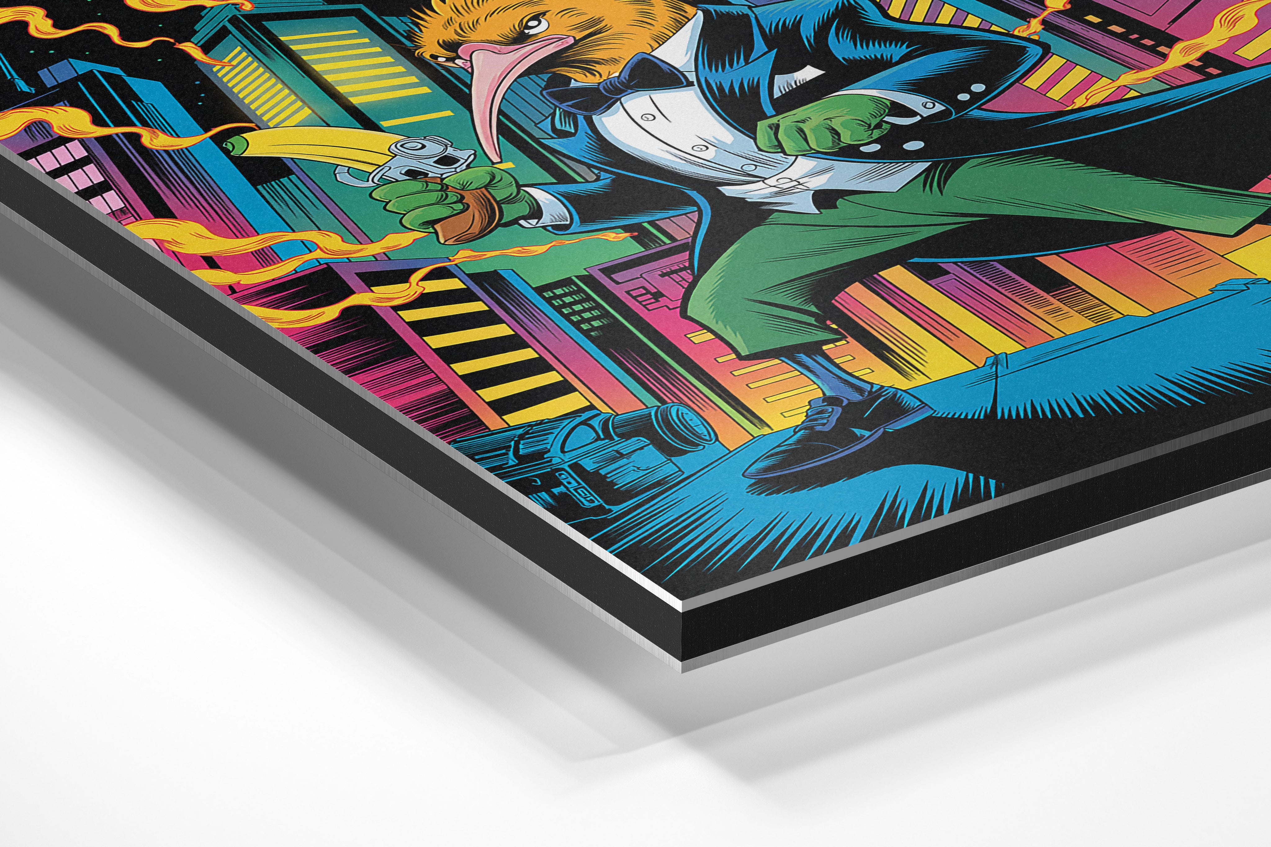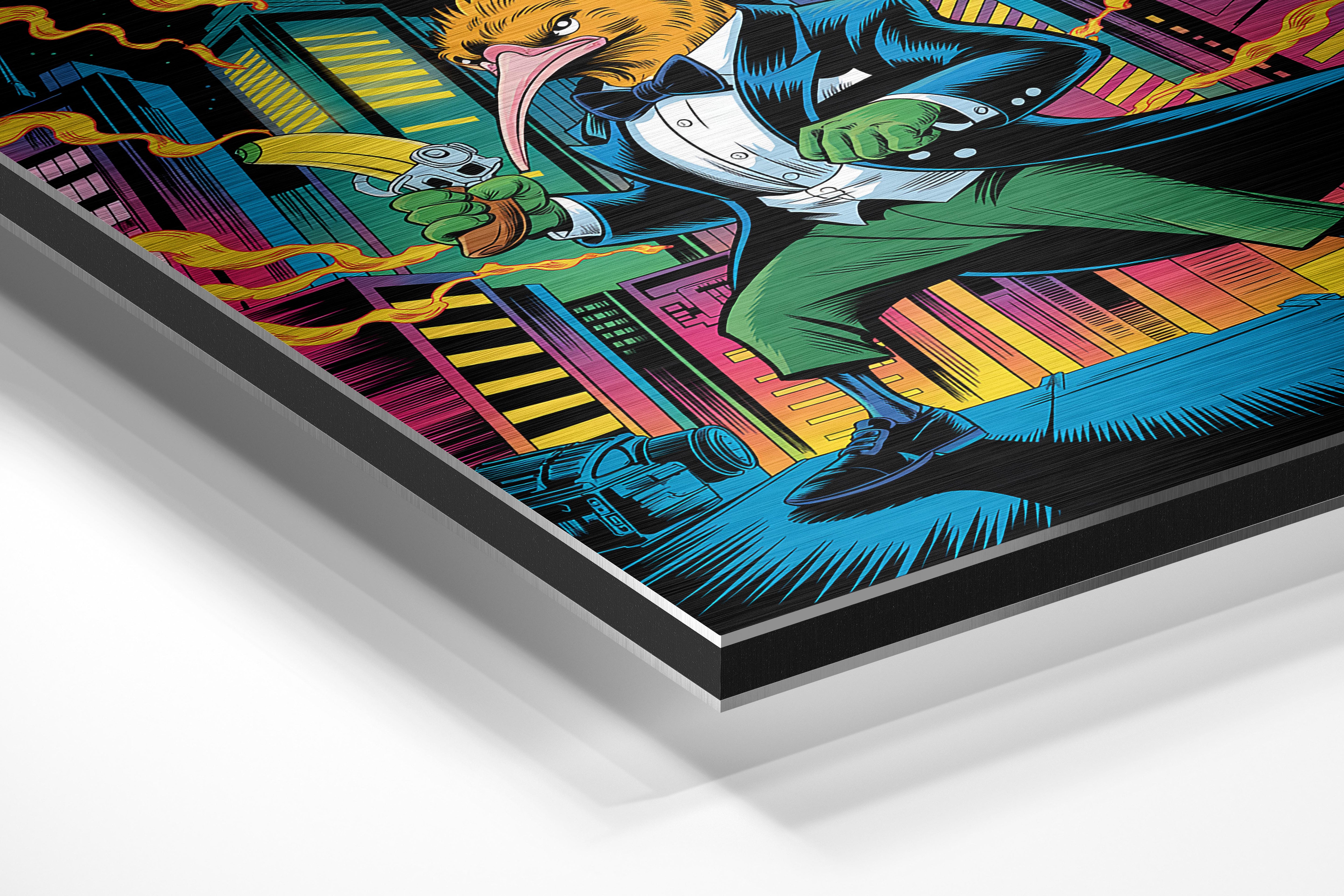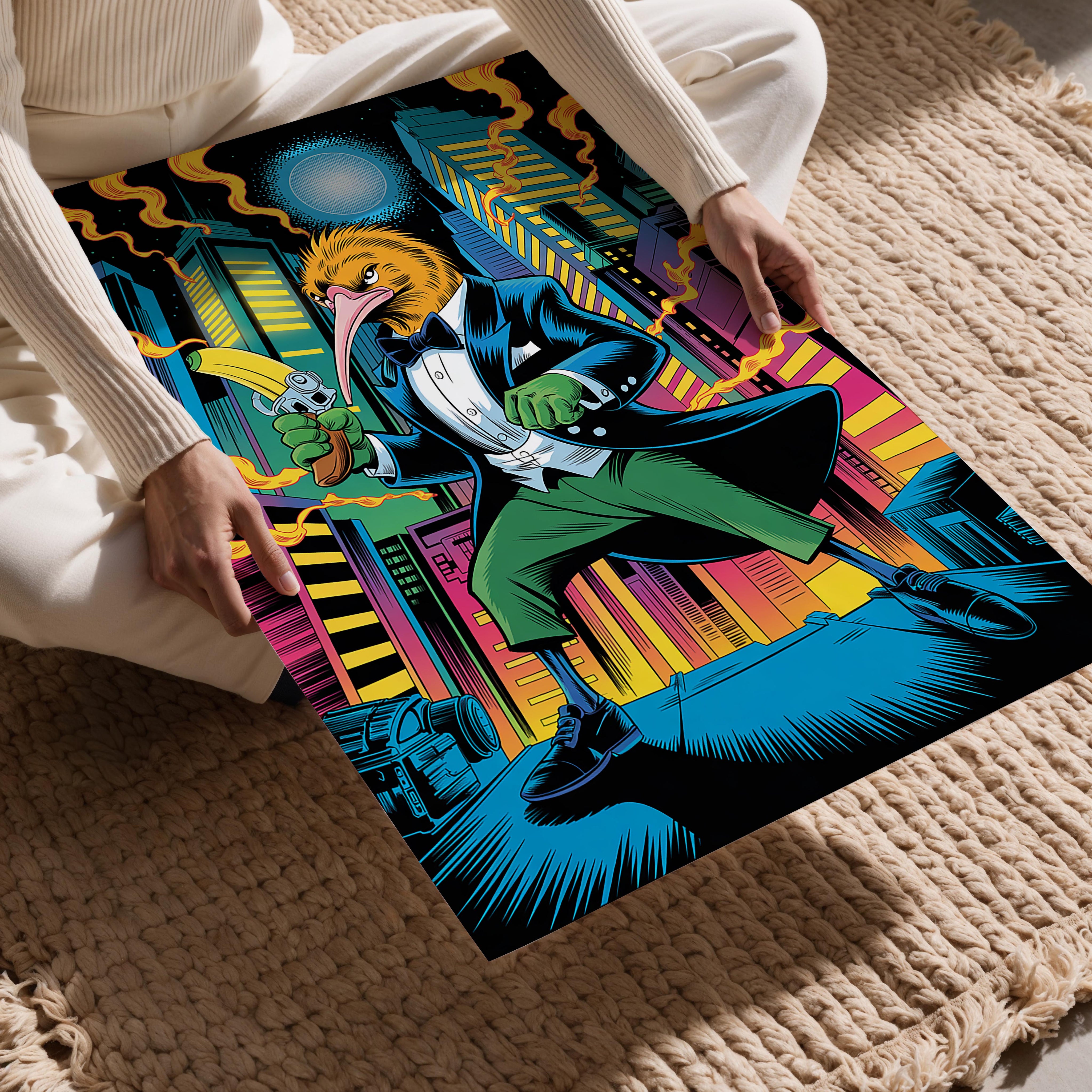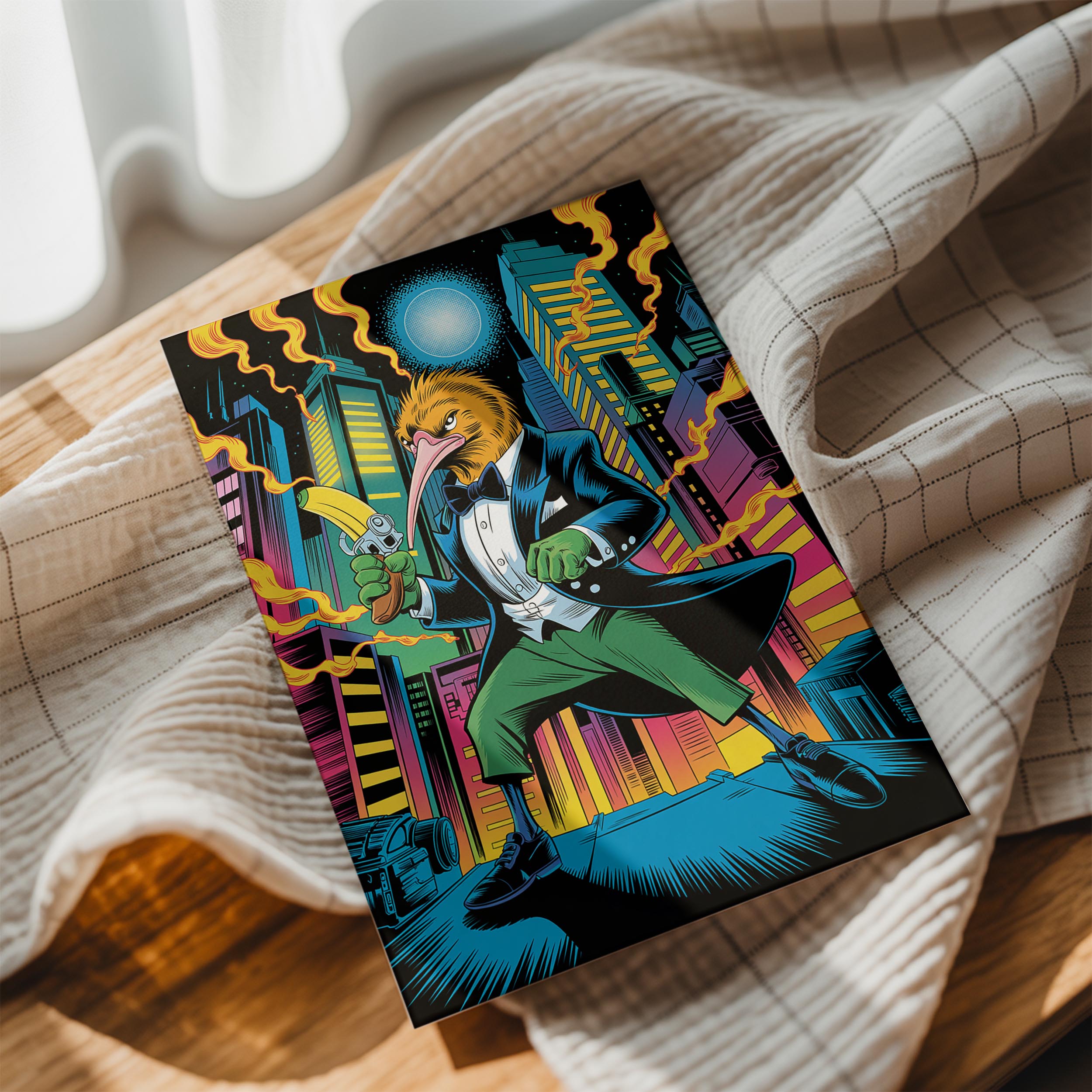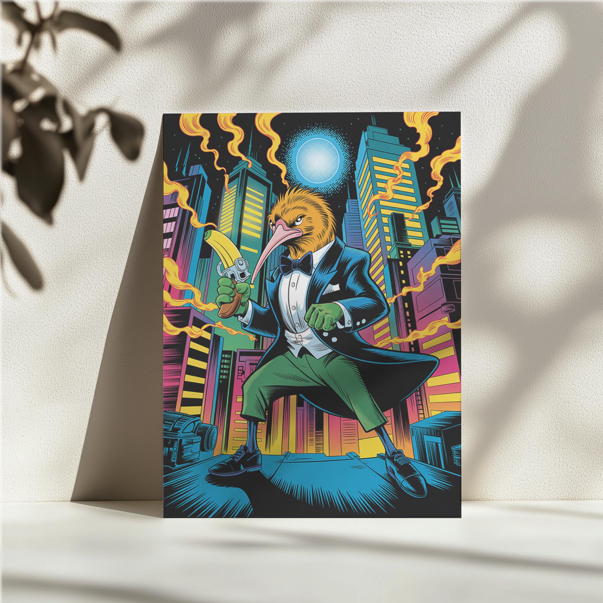 A kiwi bird in a tuxedo brandishes a banana as a weapon while standing atop a glowing neon cityscape under a bright moon. Smoke trails and dynamic poses give it the flair of a James Bond spoof, blending absurdity with slick comic stylization. Ideal for entertainment rooms, bachelor pads, or any space needing humor and action. Its saturated colors, bold lines, and imaginative concept make it a show-stealing piece full of energy and unexpected wit.