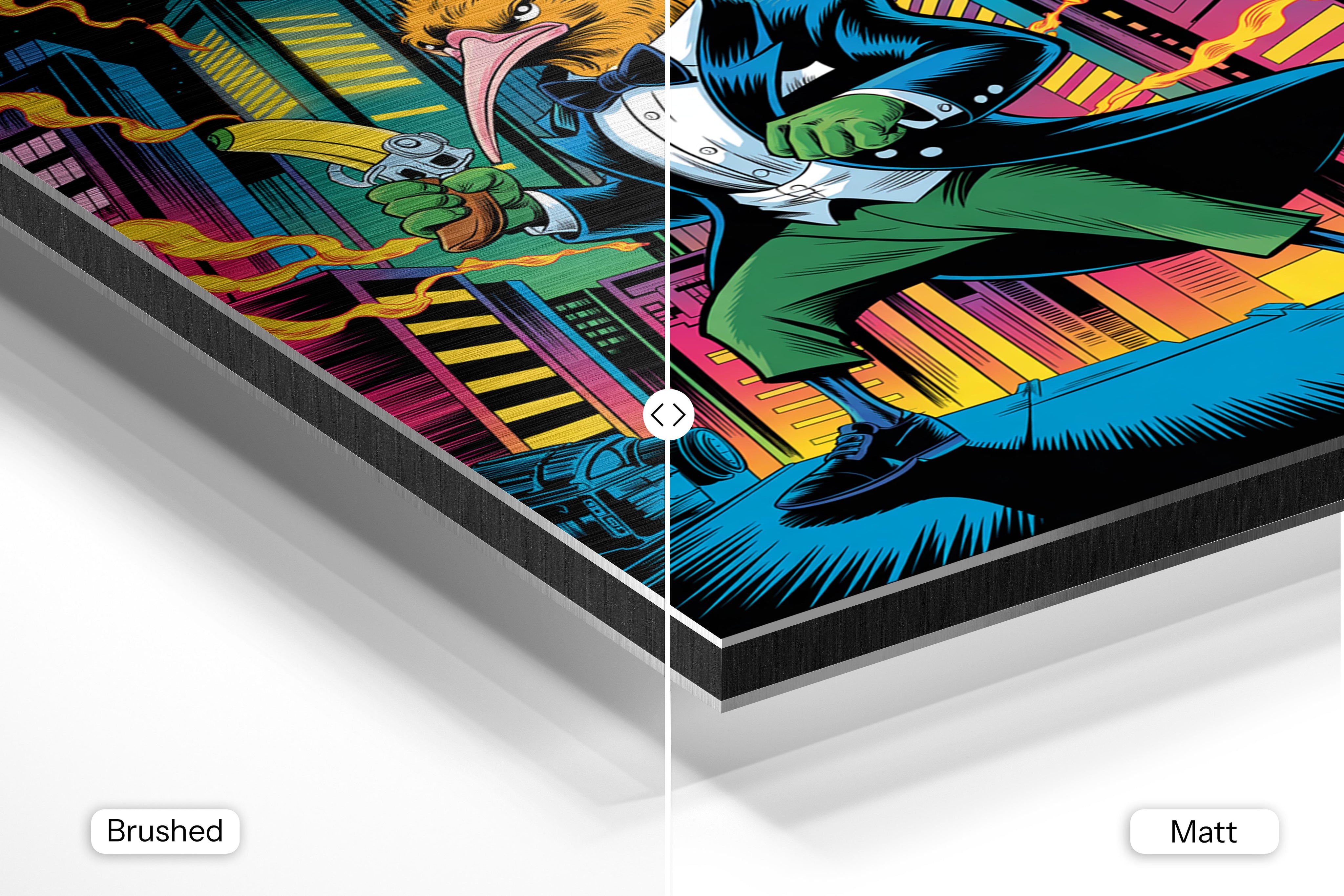 - Brushed Aluminum, on the other hand, features a raw metallic texture with visible brush strokes. Whites and highlights in your image let the silver surface show through, adding a dramatic, shimmering effect. Ideal for black-and-white images, minimalist designs, or abstract art, it creates a bold, industrial vibe with a modern edge.