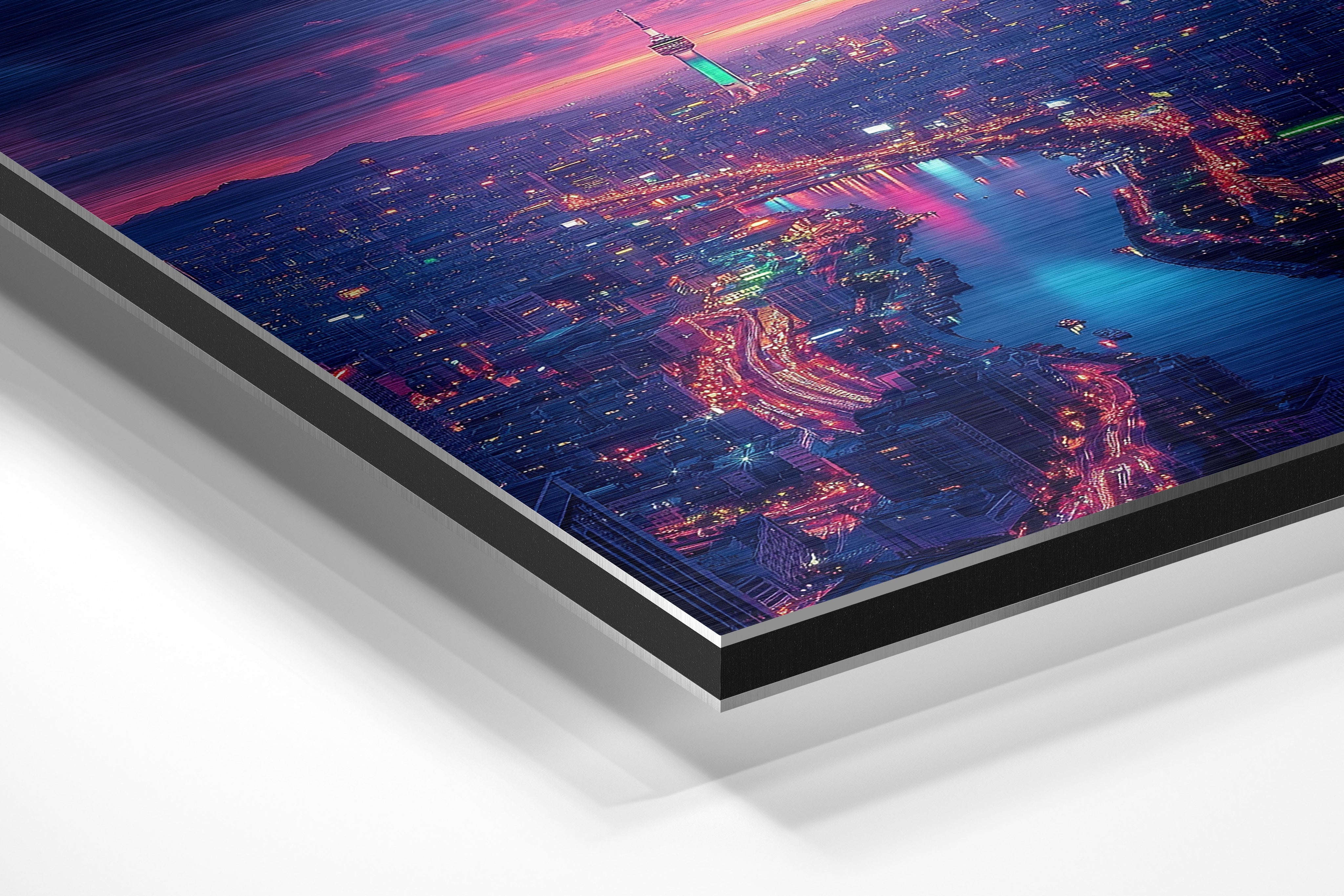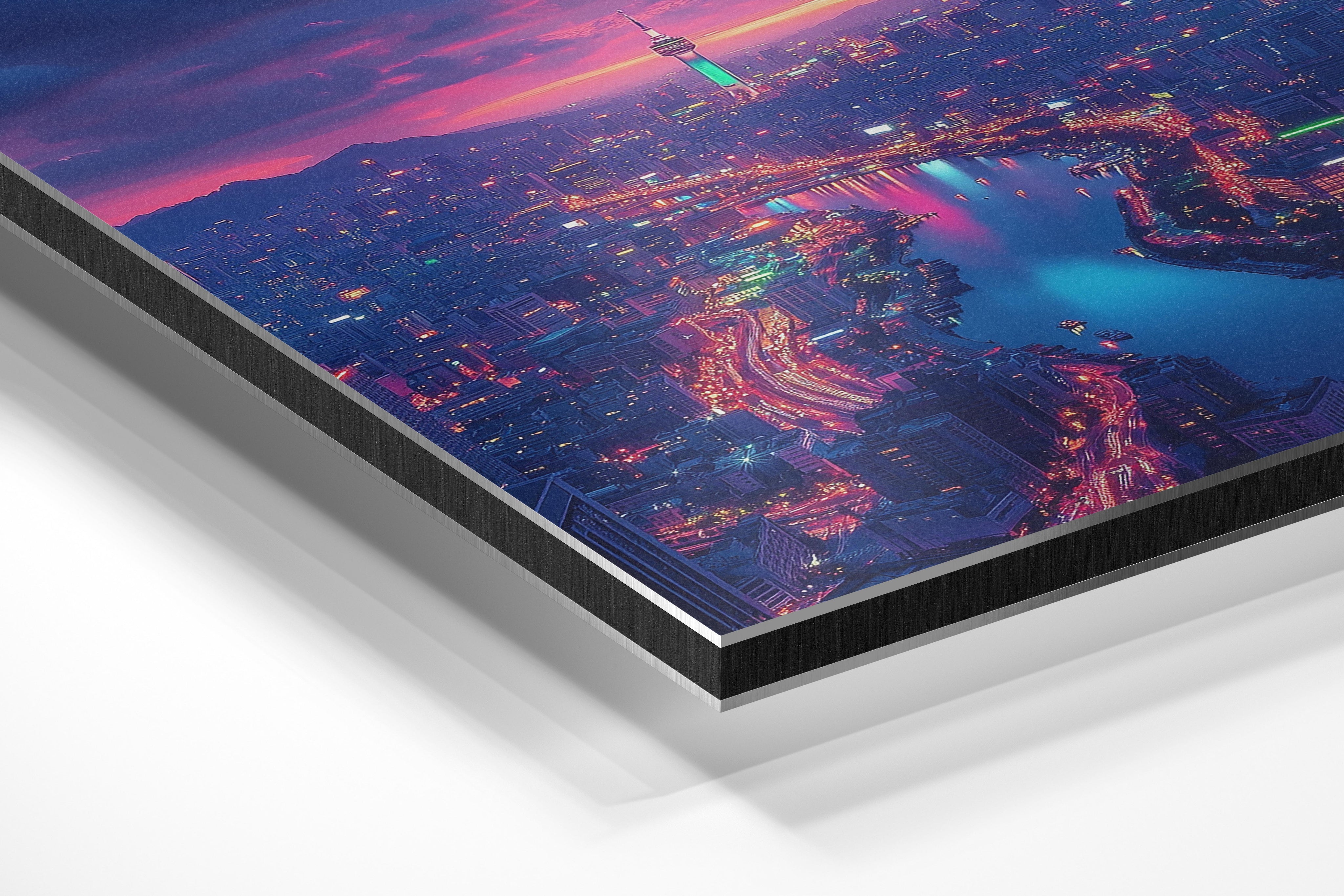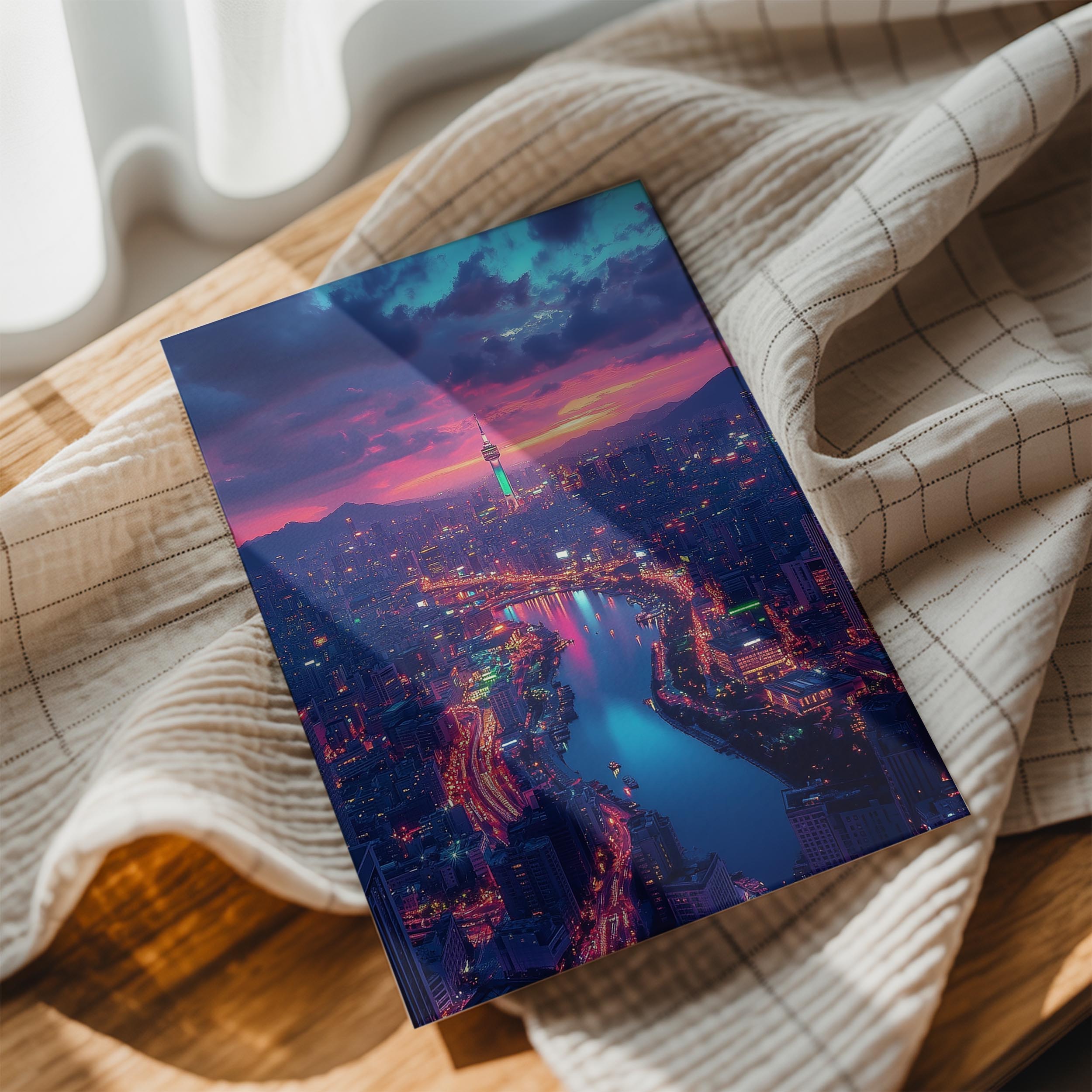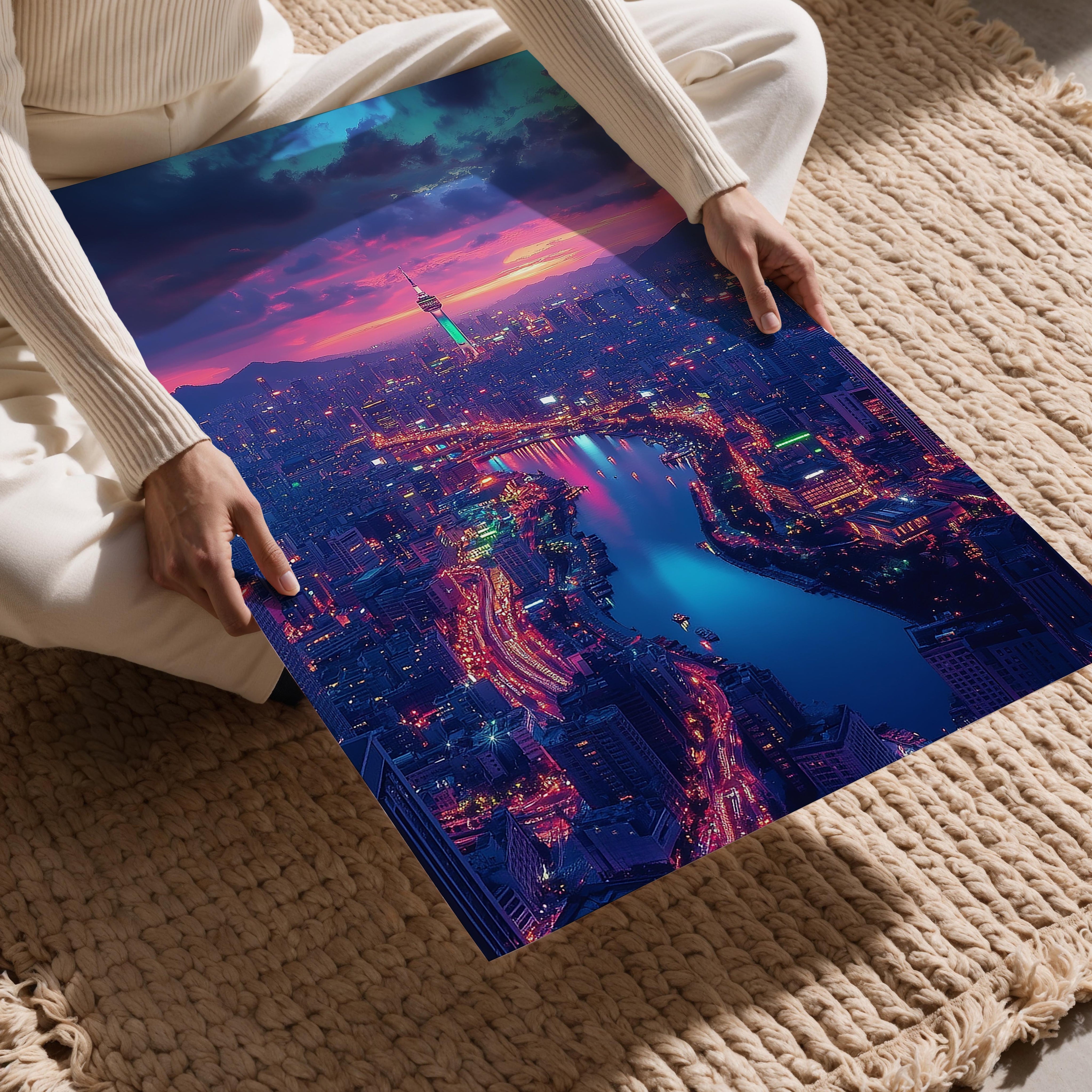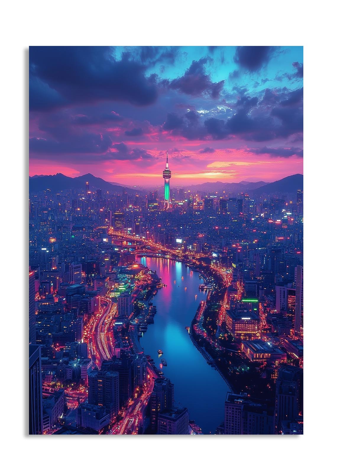 An awe-inspiring view of a Korean city at sunset, featuring a skyline punctuated by vibrant lights and a winding river. The stunning blend of pink, blue, and purple hues evokes a serene yet dynamic mood. This piece is perfect for modern homes, offices, or spaces celebrating urban life. Its vibrant palette and intricate details capture the beauty and energy of bustling cityscapes.