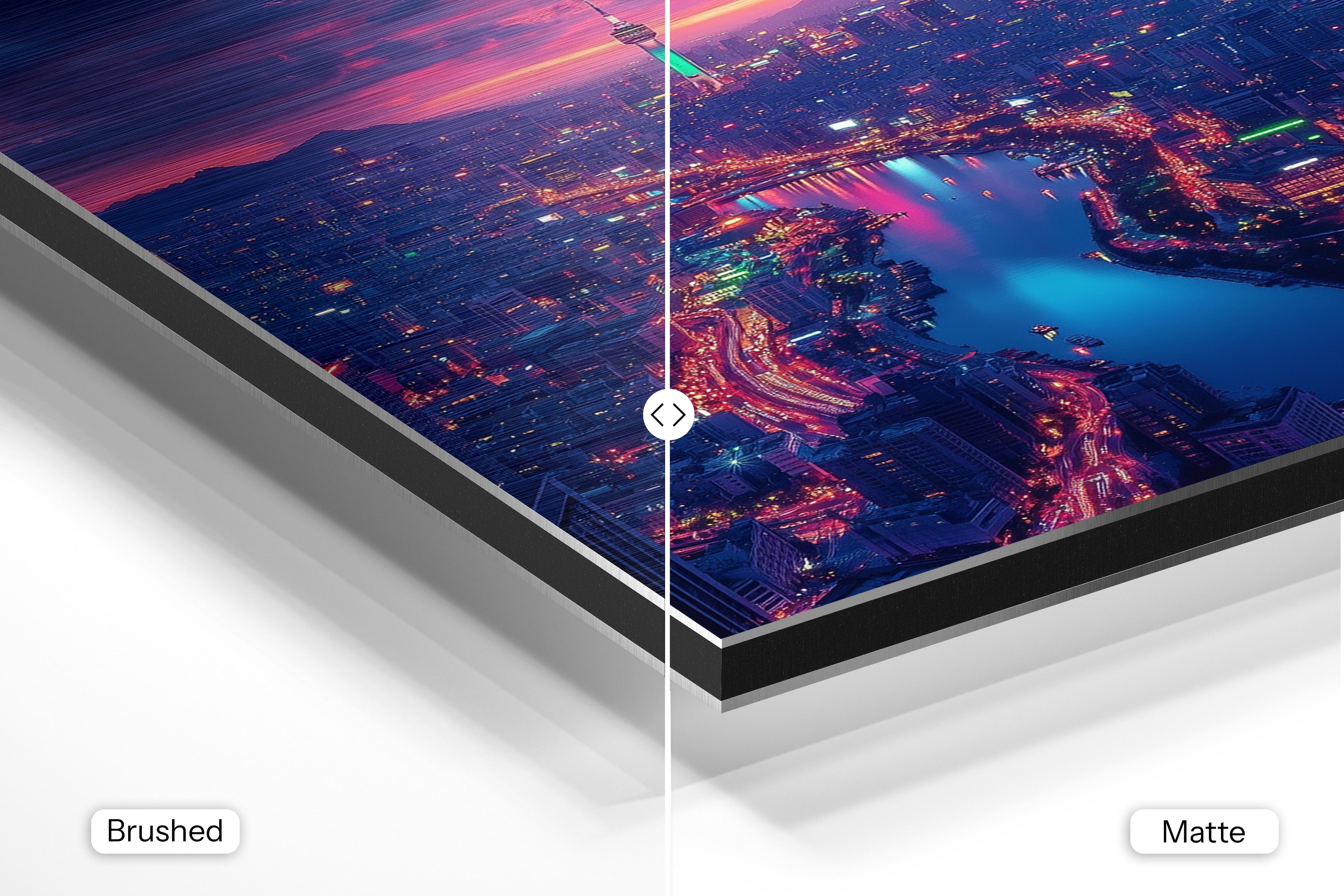 - Matte Aluminum offers a smooth, bright white surface that delivers crisp details and vibrant, true-to-life colors. With its non-reflective finish and subtle silky sheen, it’s perfect for photography, portraits, and colorful artwork—bringing a clean, polished look to any interior.