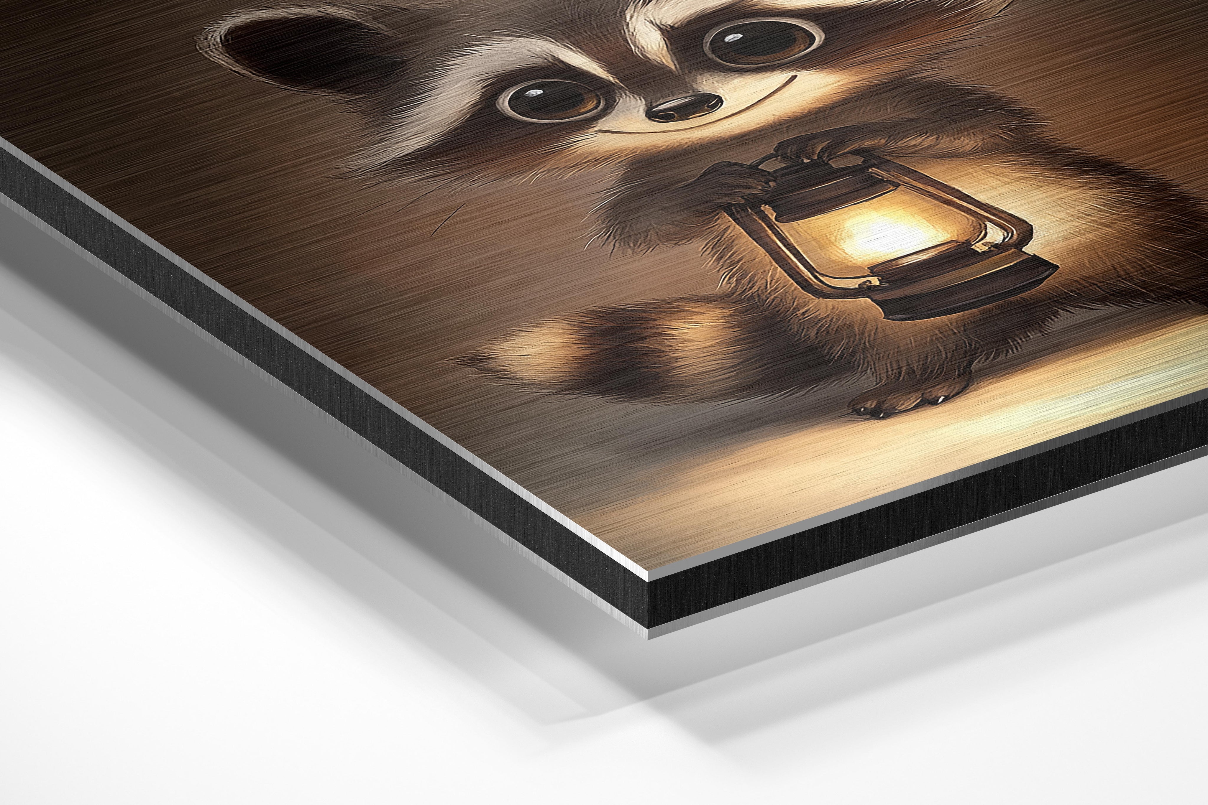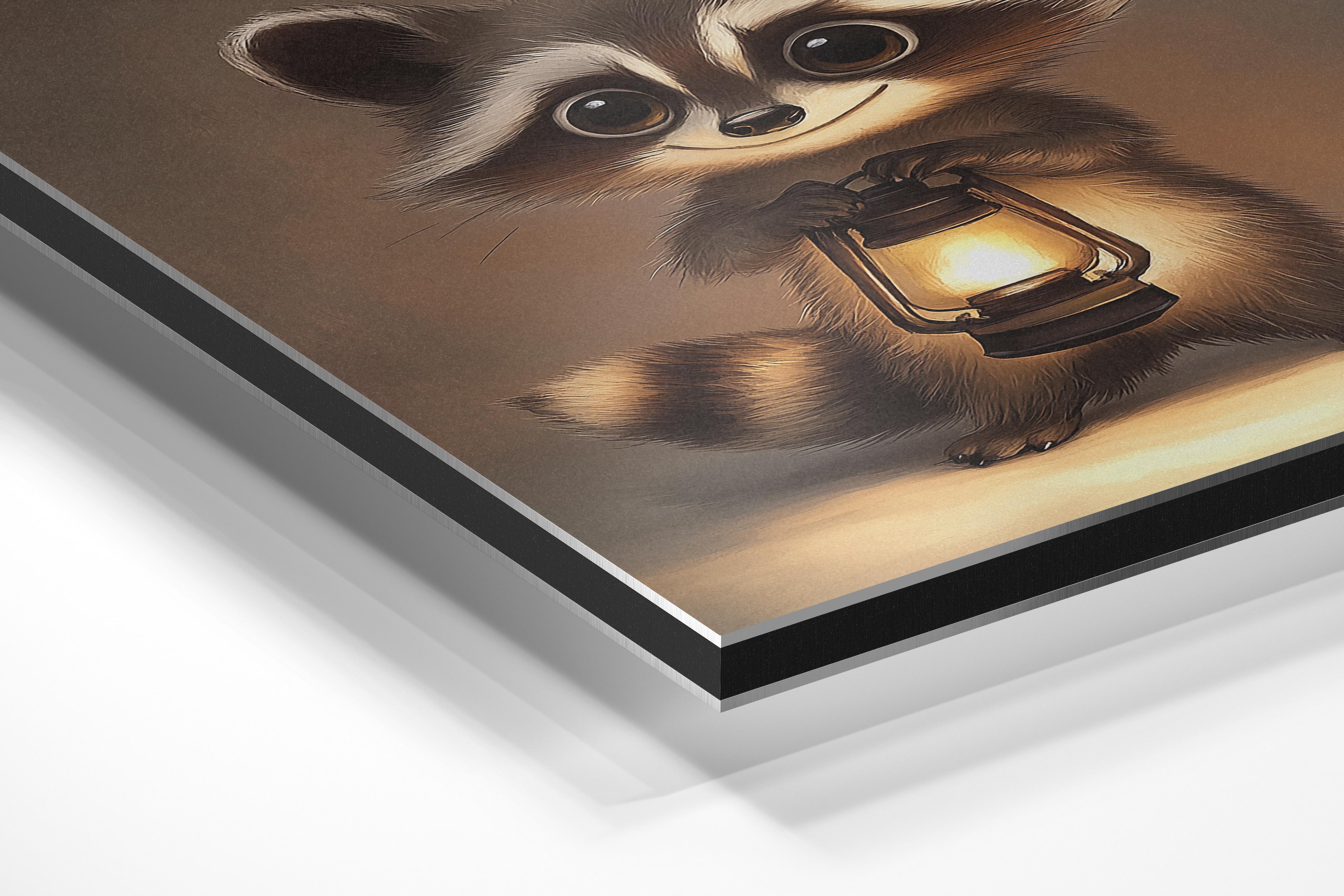 This charming digital illustration features an adorable raccoon standing upright, holding a glowing lantern. The soft, warm lighting adds a magical touch to the artwork, evoking a cozy and inviting atmosphere. The raccoon's large, expressive eyes and gentle smile give it a friendly, whimsical personality, making it an excellent choice for children's rooms, nurseries, or anyone who appreciates cute animal art. The background's muted tones create a harmonious balance, ensuring that the glowing lantern remains the focal point. This piece brings a sense of warmth, curiosity, and adventure, perfect for storytelling and imaginative spaces.