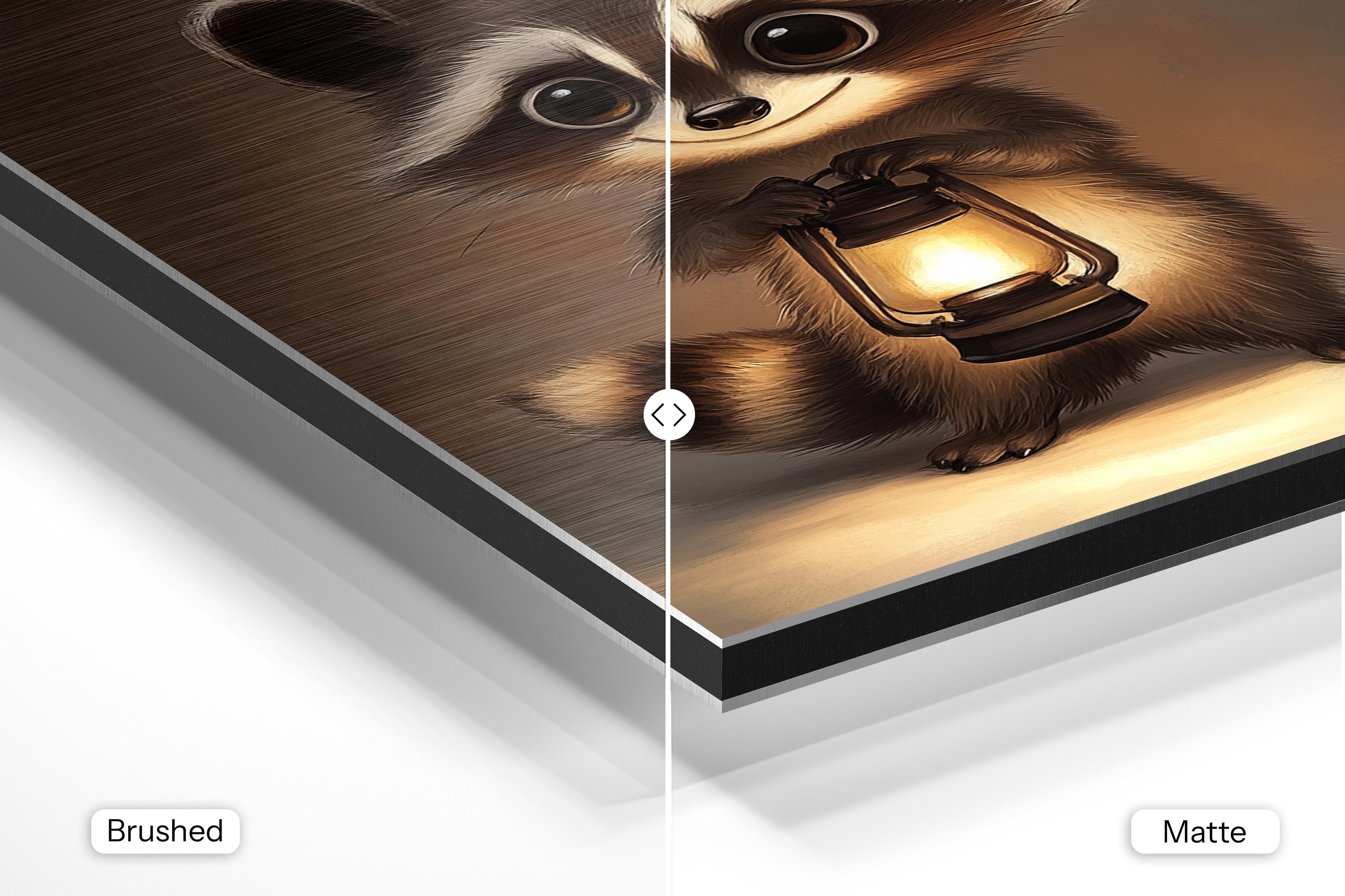 - Brushed Aluminum, on the other hand, features a raw metallic texture with visible brush strokes. Whites and highlights in your image let the silver surface show through, adding a dramatic, shimmering effect. Ideal for black-and-white images, minimalist designs, or abstract art, it creates a bold, industrial vibe with a modern edge.