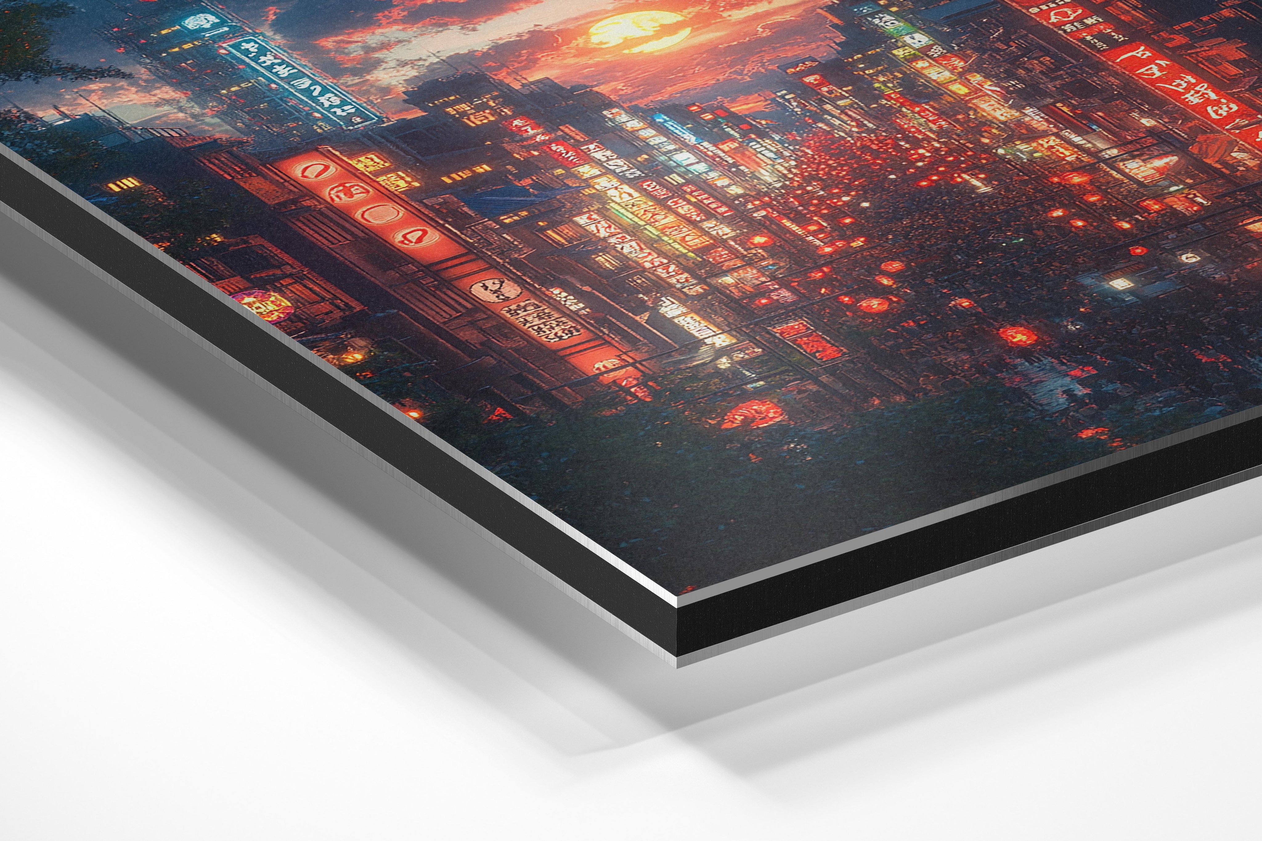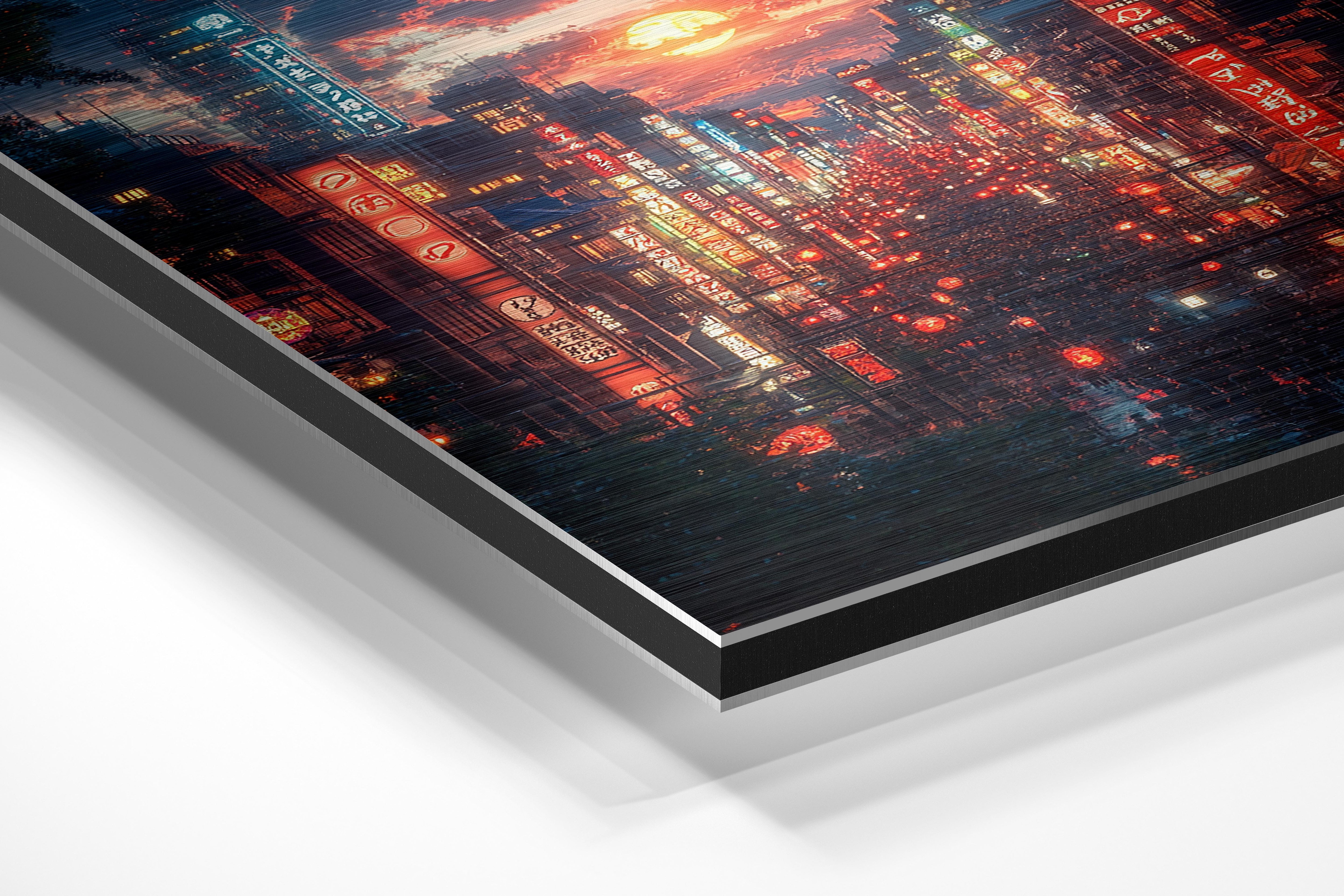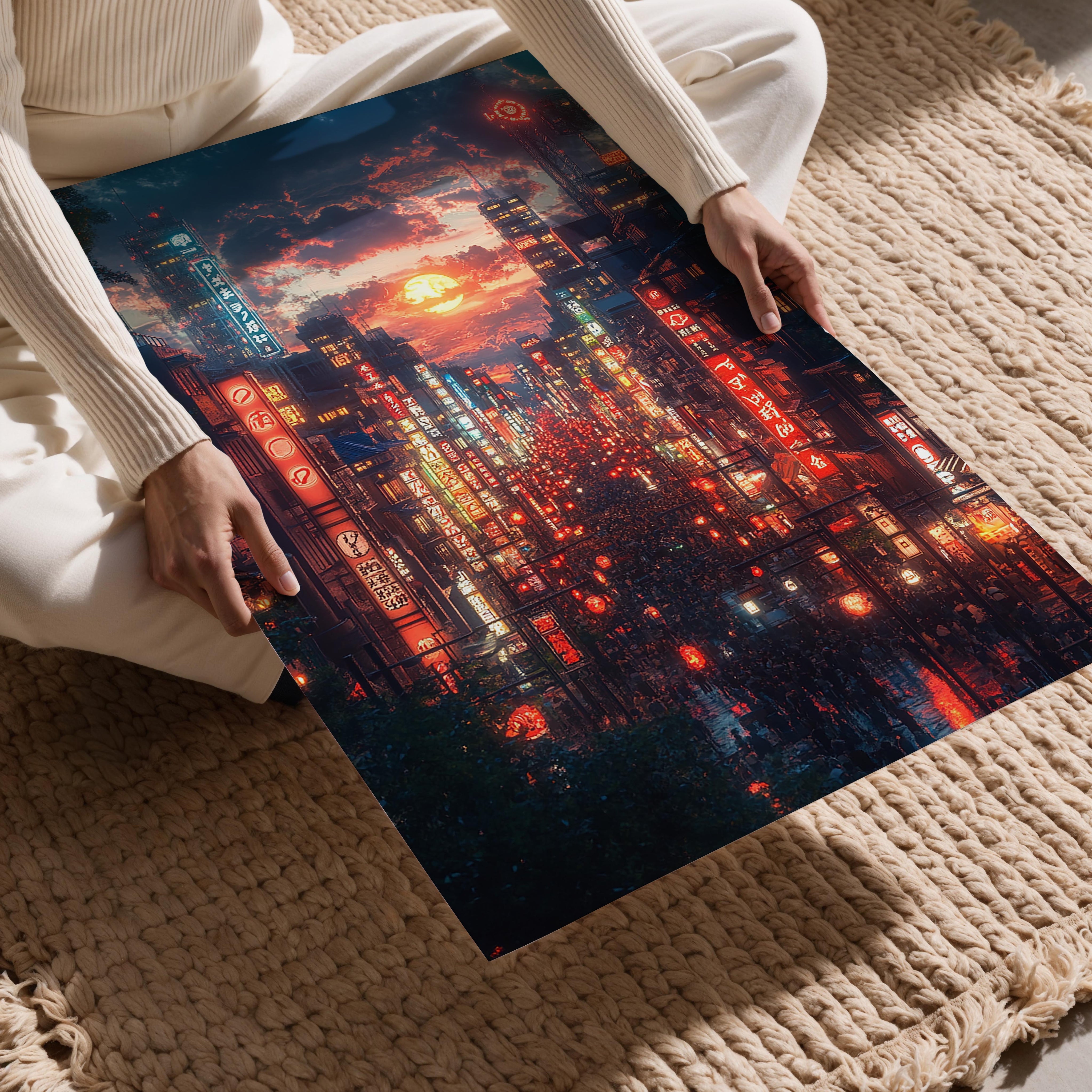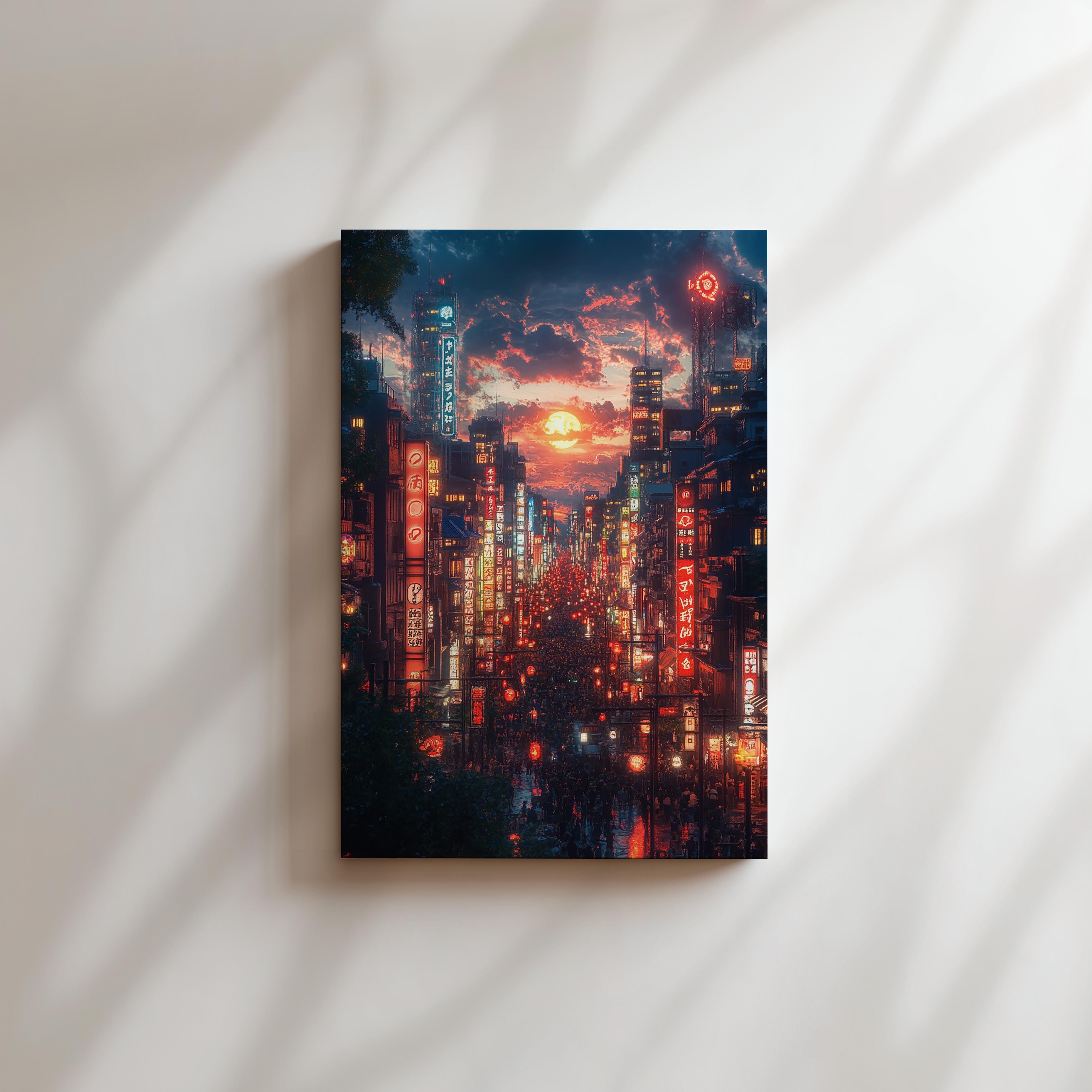 A vibrant, lantern-filled street glowing under a sunset sky captures the energetic pulse of an urban night market. The bustling crowd and illuminated signage bring this scene to life. It’s an ideal choice for retail spaces or anyone inspired by lively cultural experiences and the essence of vibrant urban nights.
