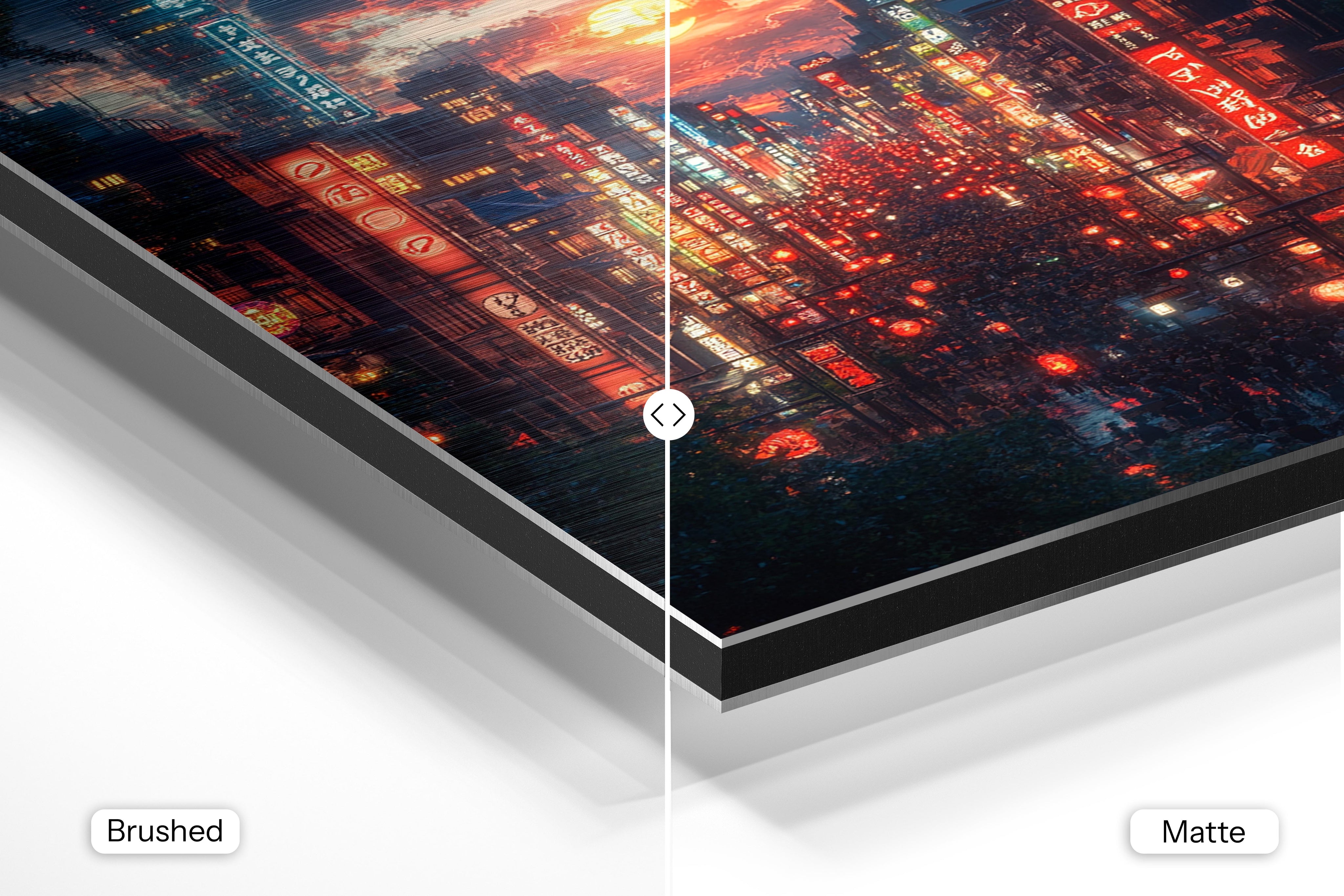 - Brushed Aluminum, on the other hand, features a raw metallic texture with visible brush strokes. Whites and highlights in your image let the silver surface show through, adding a dramatic, shimmering effect. Ideal for black-and-white images, minimalist designs, or abstract art, it creates a bold, industrial vibe with a modern edge.