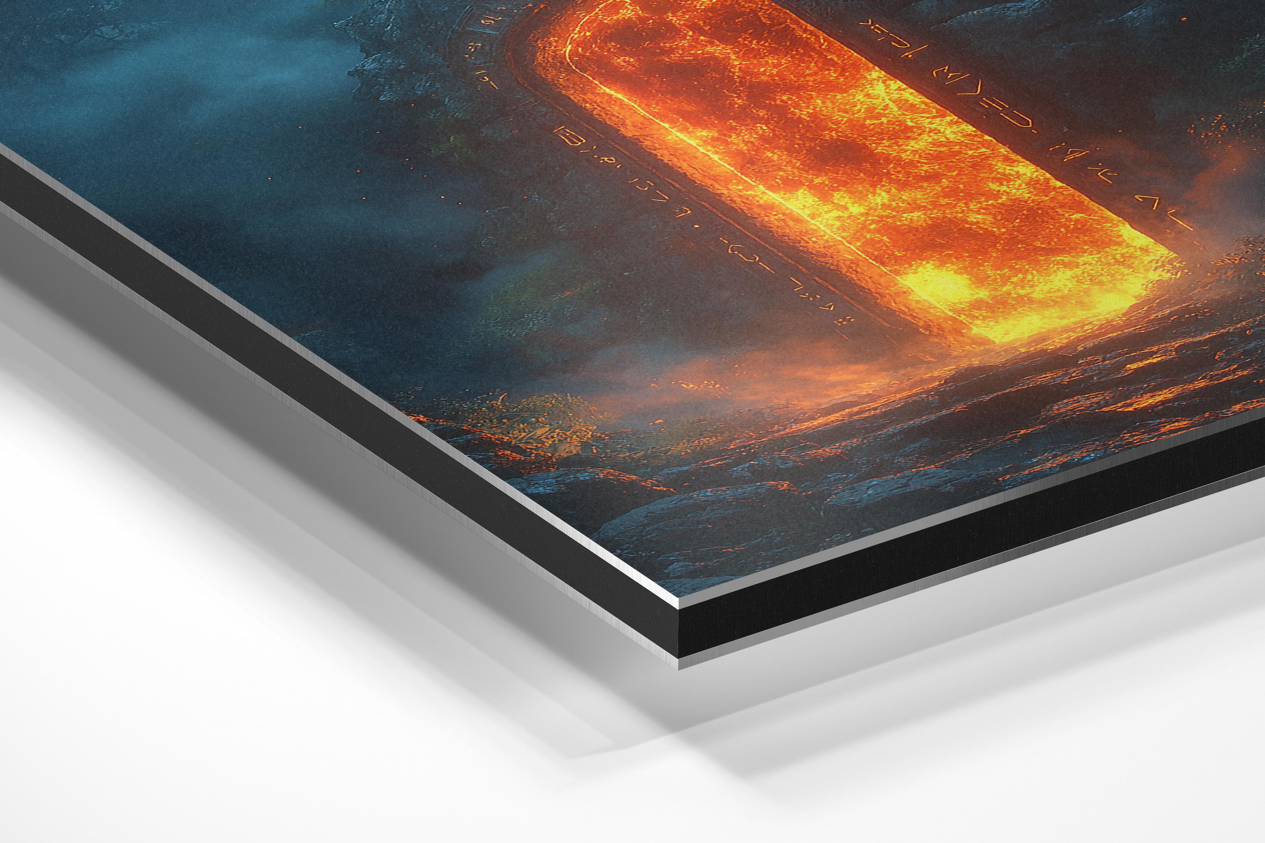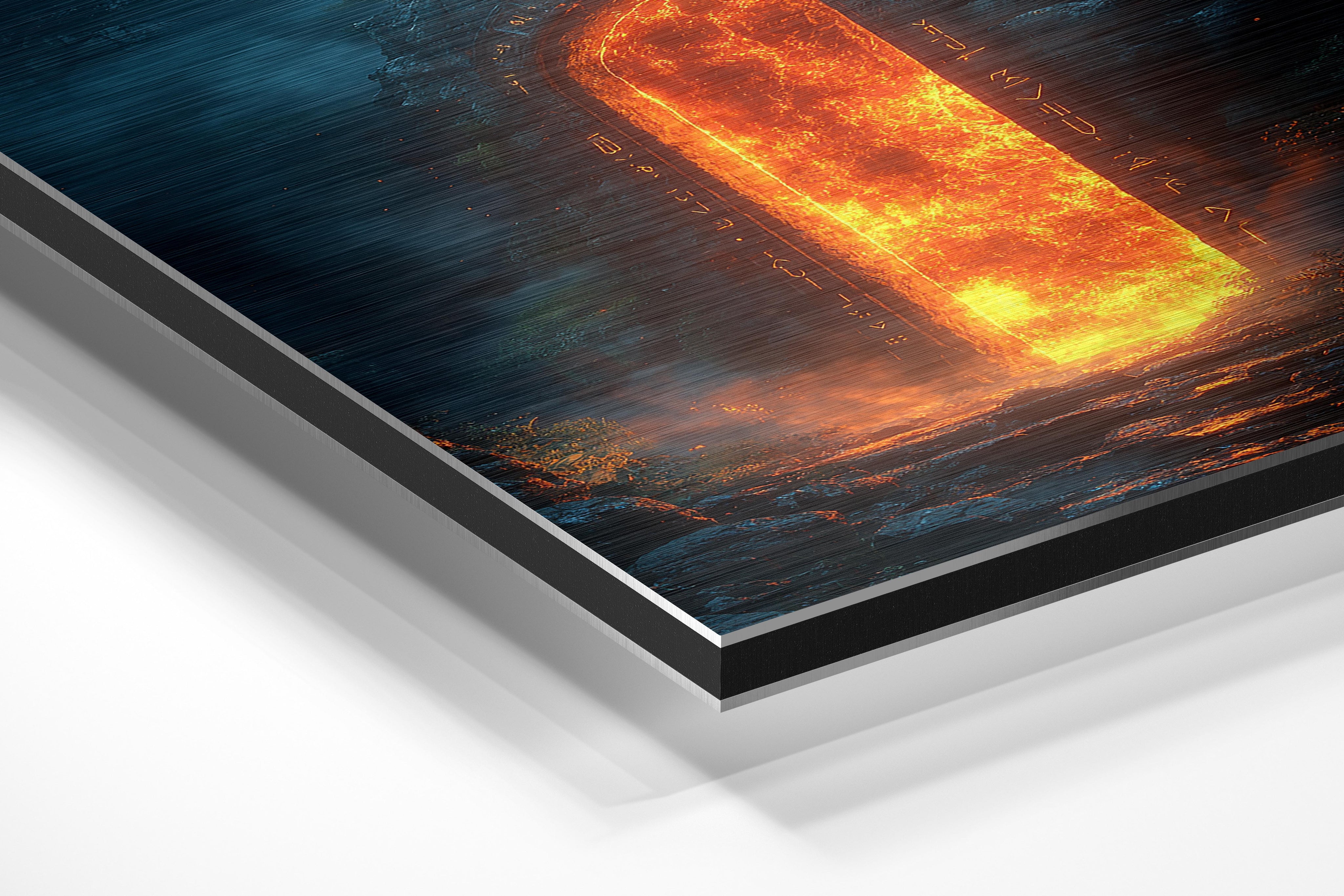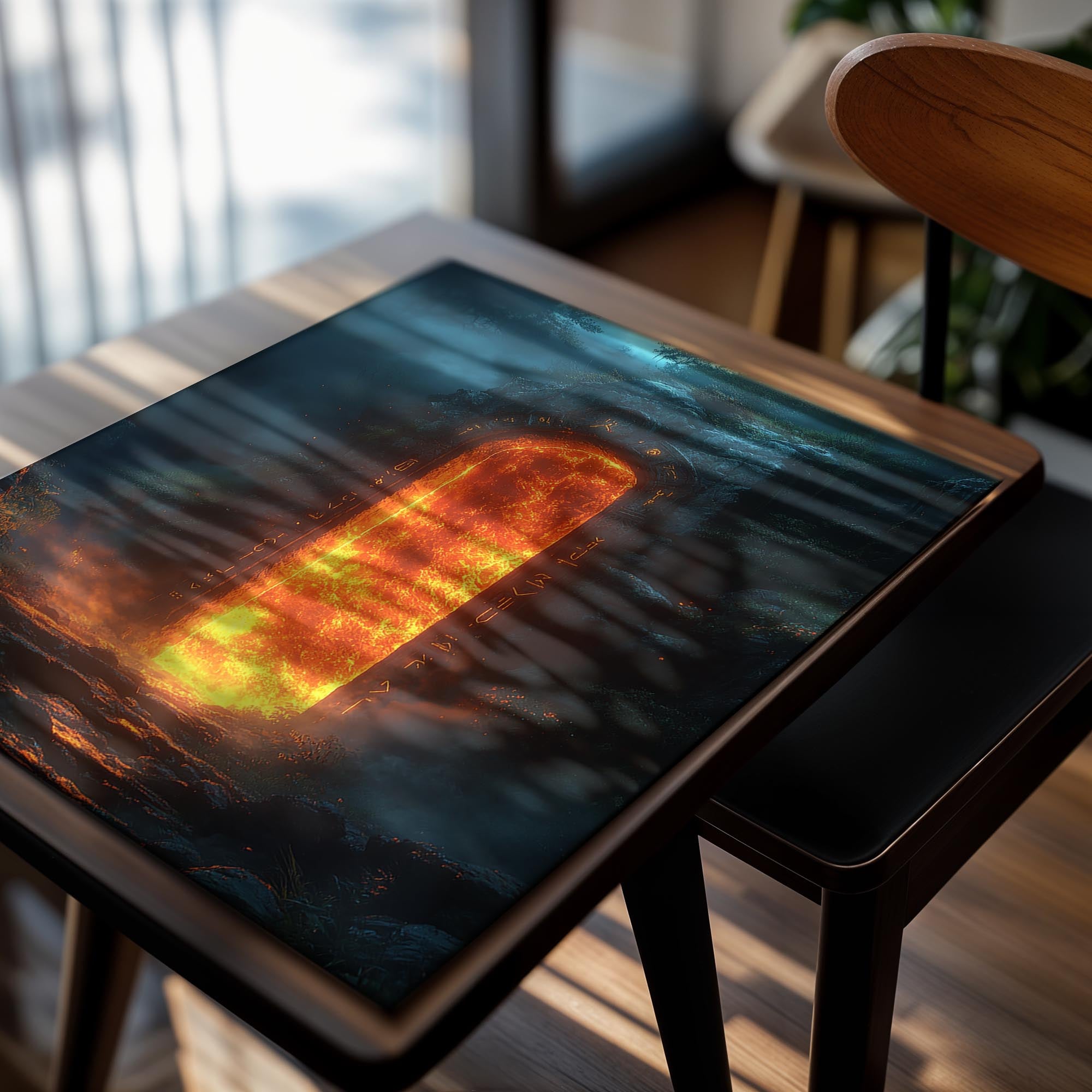 A vibrant doorway filled with molten lava-like energy, surrounded by mystical symbols and rock formations. This piece is ideal for dramatic interiors or storytelling spaces. Its fiery intensity captures the imagination, creating a bold focal point for lovers of fantasy or adventure themes.