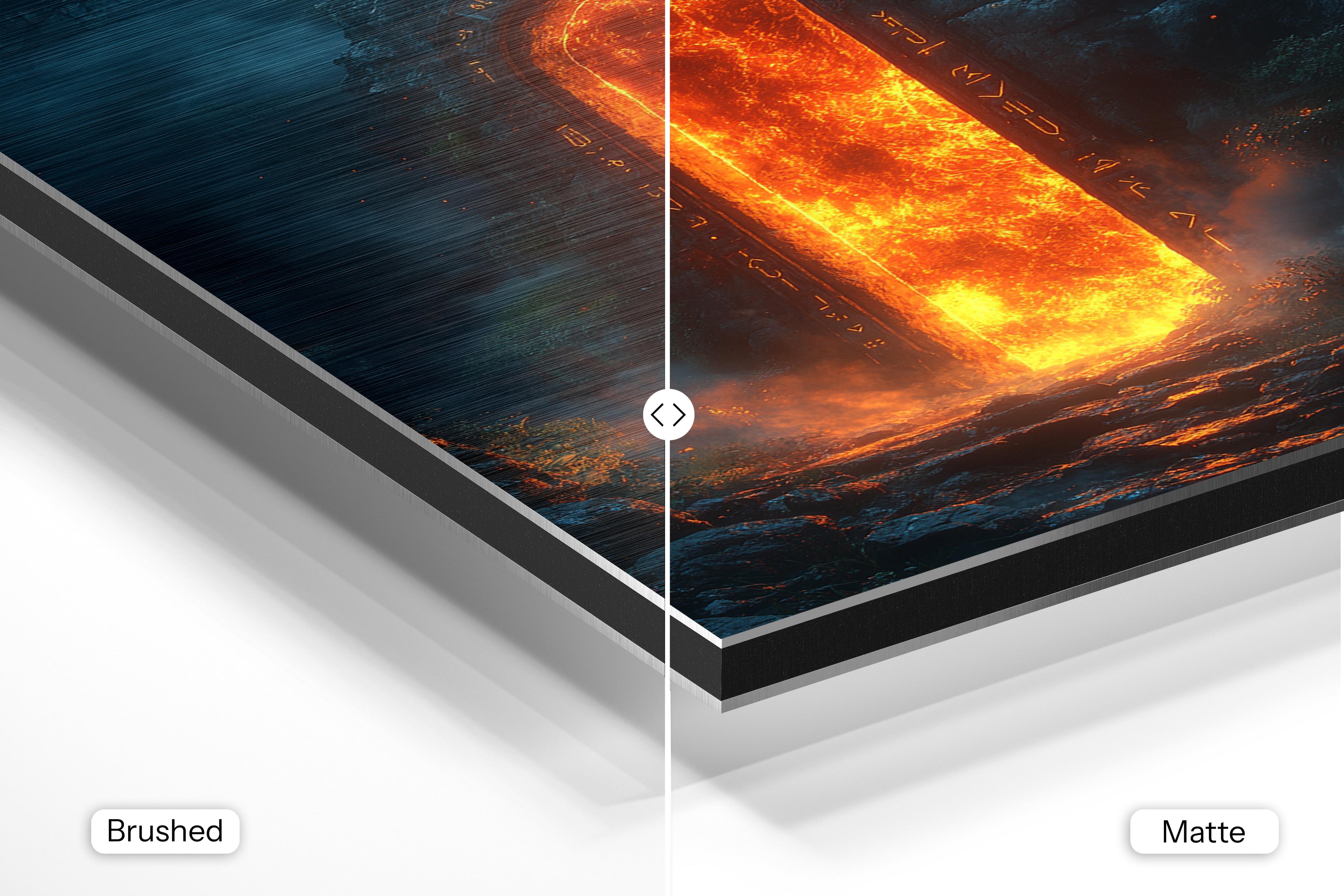 - Brushed Aluminum, on the other hand, features a raw metallic texture with visible brush strokes. Whites and highlights in your image let the silver surface show through, adding a dramatic, shimmering effect. Ideal for black-and-white images, minimalist designs, or abstract art, it creates a bold, industrial vibe with a modern edge.