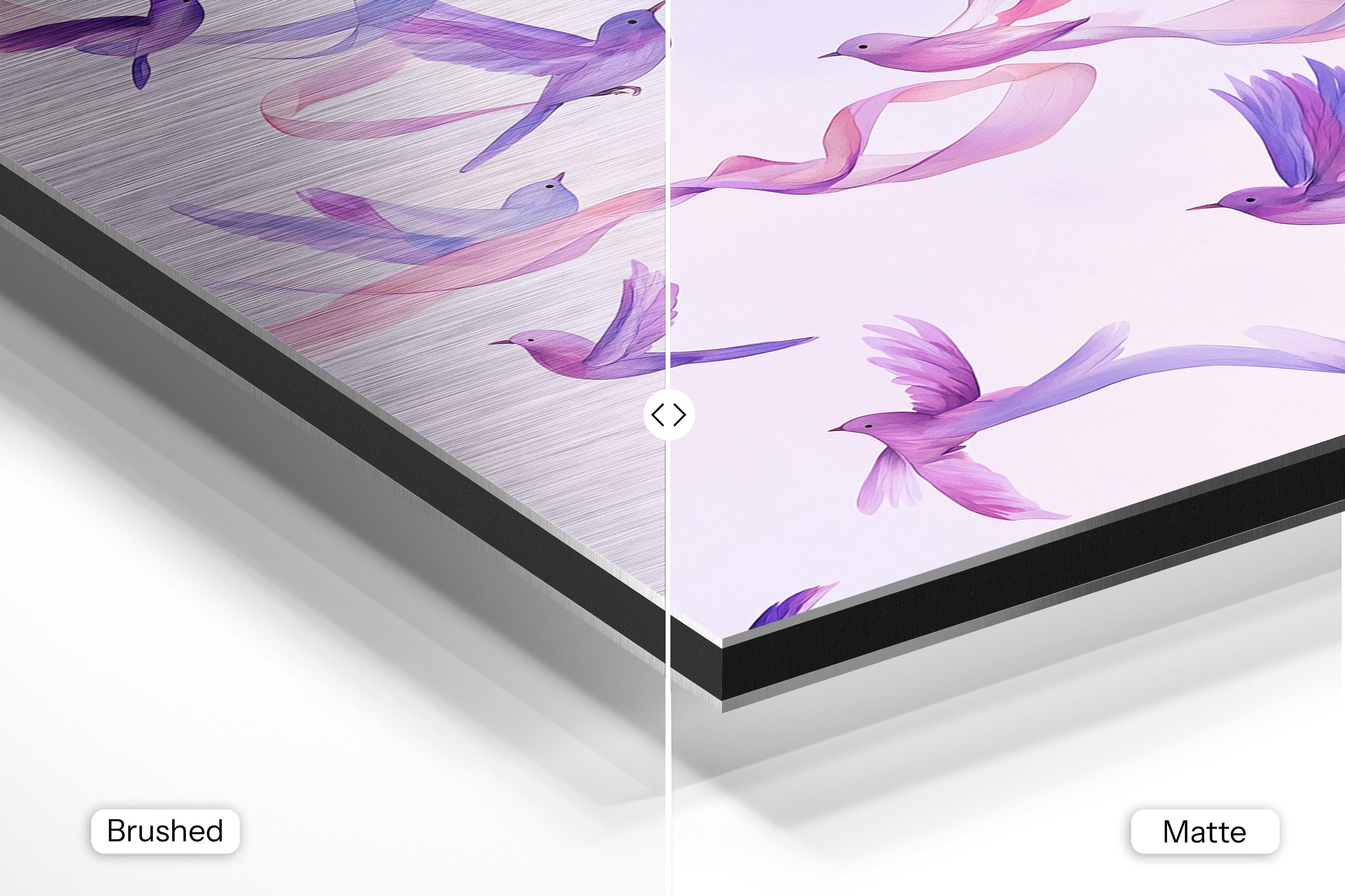 - Brushed Aluminum, on the other hand, features a raw metallic texture with visible brush strokes. Whites and highlights in your image let the silver surface show through, adding a dramatic, shimmering effect. Ideal for black-and-white images, minimalist designs, or abstract art, it creates a bold, industrial vibe with a modern edge.
