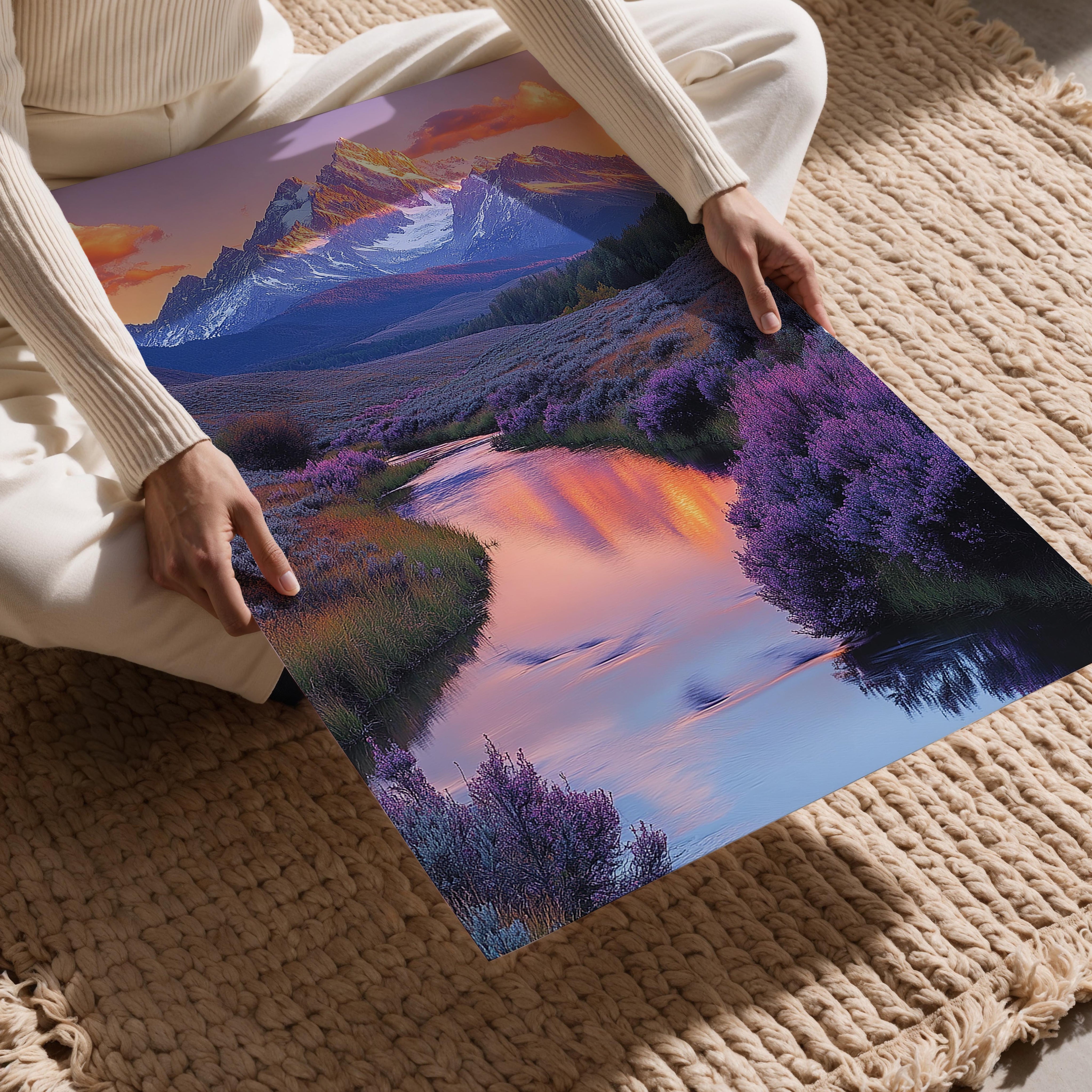 A picturesque scene where a meandering river reflects the soft pinks and purples of twilight, surrounded by fields of wild lavender. Towering snow-capped peaks rise in the background, creating a stunning contrast between warmth and coolness. The peaceful flow of water and the vibrant colors make this an ideal image for a relaxing bedroom, spa-like bathroom, or any space designed to promote calm and serenity. This artwork invites viewers to escape into a world of natural beauty and quiet contemplation.